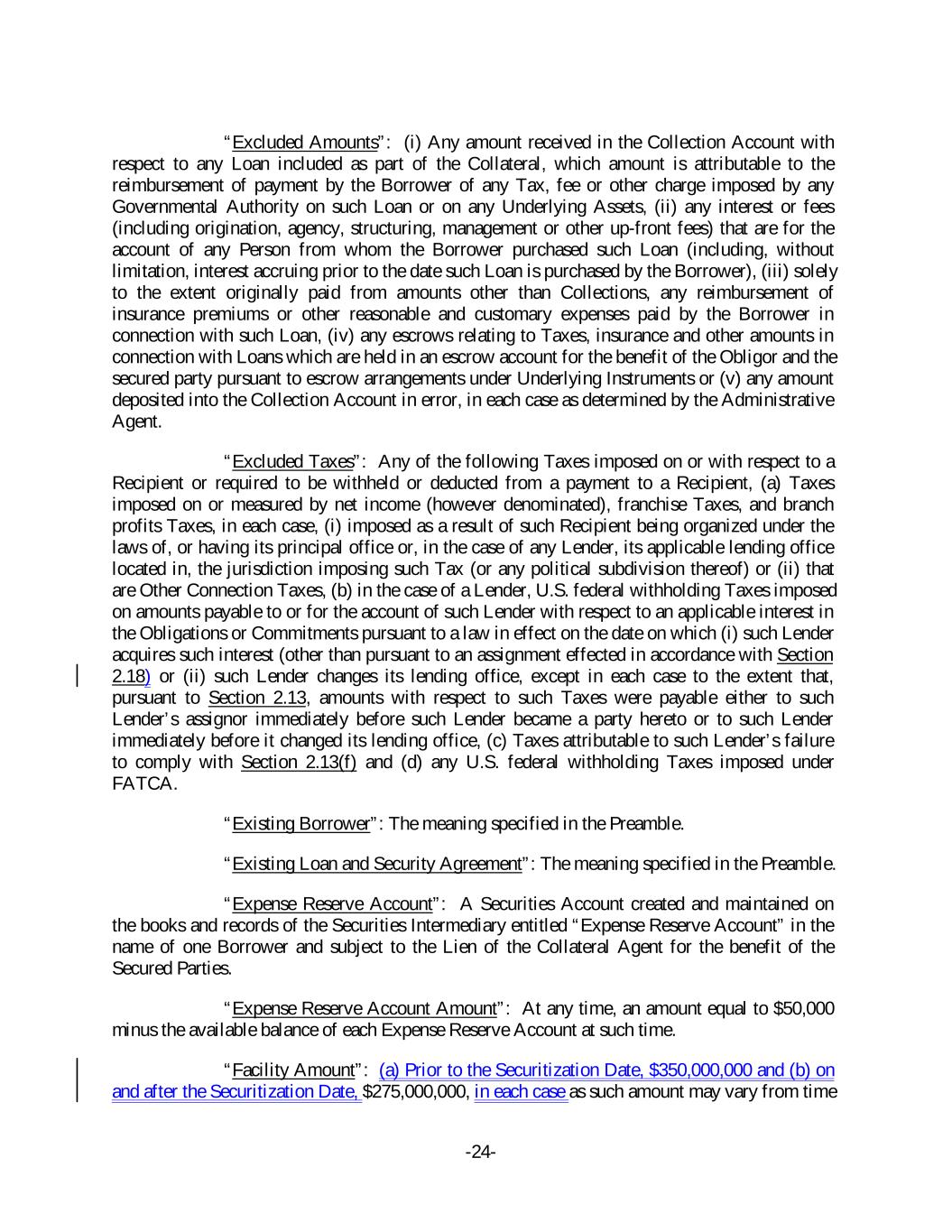 “Excluded Amounts”: (i) Any amount received in the Collection Account with respect to any Loan included as part of the Collateral, which amount is attributable to the reimbursement of payment by the Borrower of any Tax, fee or other charge imposed by any Governmental Authority on such Loan or on any Underlying Assets, (ii) any interest or fees (including origination, agency, structuring, management or other up-front fees) that are for the account of any Person from whom the Borrower purchased such Loan (including, without limitation, interest accruing prior to the date such Loan is purchased by the Borrower), (iii) solely to the extent originally paid from amounts other than Collections, any reimbursement of insurance premiums or other reasonable and customary expenses paid by the Borrower in connection with such Loan, (iv) any escrows relating to Taxes, insurance and other amounts in connection with Loans which are held in an escrow account for the benefit of the Obligor and the secured party pursuant to escrow arrangements under Underlying Instruments or (v) any amount deposited into the Collection Account in error, in each case as determined by the Administrative Agent. “Excluded Taxes”: Any of the following Taxes imposed on or with respect to a Recipient or required to be withheld or deducted from a payment to a Recipient, (a) Taxes imposed on or measured by net income (however denominated), franchise Taxes, and branch profits Taxes, in each case, (i) imposed as a result of such Recipient being organized under the laws of, or having its principal office or, in the case of any Lender, its applicable lending office located in, the jurisdiction imposing such Tax (or any political subdivision thereof) or (ii) that are Other Connection Taxes, (b) in the case of a Lender, U.S. federal withholding Taxes imposed on amounts payable to or for the account of such Lender with respect to an applicable interest in the Obligations or Commitments pursuant to a law in effect on the date on which (i) such Lender acquires such interest (other than pursuant to an assignment effected in accordance with Section 2.18) or (ii) such Lender changes its lending office, except in each case to the extent that, pursuant to Section 2.13, amounts with respect to such Taxes were payable either to such Lender’s assignor immediately before such Lender became a party hereto or to such Lender immediately before it changed its lending office, (c) Taxes attributable to such Lender’s failure to comply with Section 2.13(f) and (d) any U.S. federal withholding Taxes imposed under FATCA. “Existing Borrower”: The meaning specified in the Preamble. “Existing Loan and Security Agreement”: The meaning specified in the Preamble. “Expense Reserve Account”: A Securities Account created and maintained on the books and records of the Securities Intermediary entitled “Expense Reserve Account” in the name of one Borrower and subject to the Lien of the Collateral Agent for the benefit of the Secured Parties. “Expense Reserve Account Amount”: At any time, an amount equal to $50,000 minus the available balance of each Expense Reserve Account at such time. “Facility Amount”: (a) Prior to the Securitization Date, $350,000,000 and (b) on and after the Securitization Date, $275,000,000, in each case as such amount may vary from time -24-