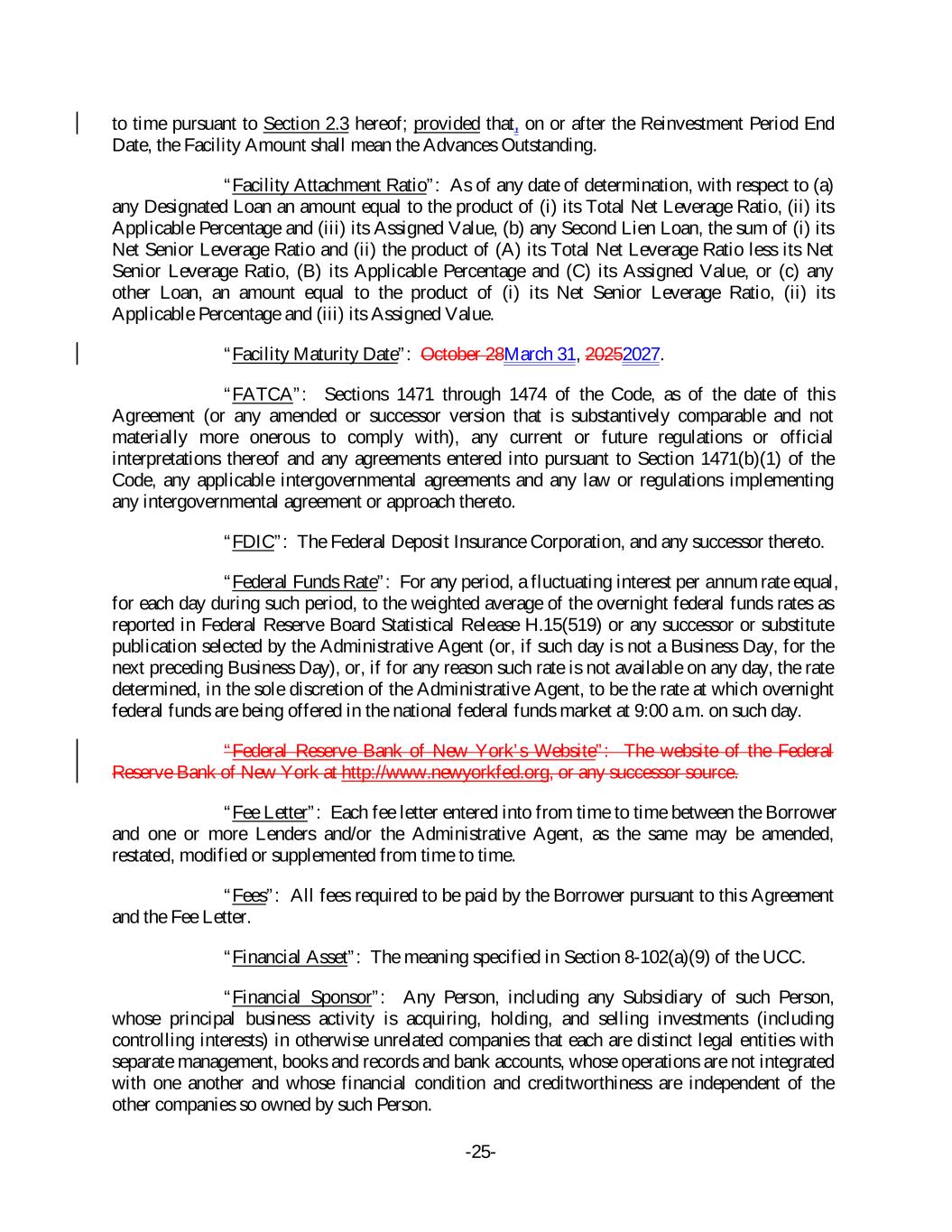 to time pursuant to Section 2.3 hereof; provided that, on or after the Reinvestment Period End Date, the Facility Amount shall mean the Advances Outstanding. “Facility Attachment Ratio”: As of any date of determination, with respect to (a) any Designated Loan an amount equal to the product of (i) its Total Net Leverage Ratio, (ii) its Applicable Percentage and (iii) its Assigned Value, (b) any Second Lien Loan, the sum of (i) its Net Senior Leverage Ratio and (ii) the product of (A) its Total Net Leverage Ratio less its Net Senior Leverage Ratio, (B) its Applicable Percentage and (C) its Assigned Value, or (c) any other Loan, an amount equal to the product of (i) its Net Senior Leverage Ratio, (ii) its Applicable Percentage and (iii) its Assigned Value. “Facility Maturity Date”: October 28March 31, 20252027. “FATCA”: Sections 1471 through 1474 of the Code, as of the date of this Agreement (or any amended or successor version that is substantively comparable and not materially more onerous to comply with), any current or future regulations or official interpretations thereof and any agreements entered into pursuant to Section 1471(b)(1) of the Code, any applicable intergovernmental agreements and any law or regulations implementing any intergovernmental agreement or approach thereto. “FDIC”: The Federal Deposit Insurance Corporation, and any successor thereto. “Federal Funds Rate”: For any period, a fluctuating interest per annum rate equal, for each day during such period, to the weighted average of the overnight federal funds rates as reported in Federal Reserve Board Statistical Release H.15(519) or any successor or substitute publication selected by the Administrative Agent (or, if such day is not a Business Day, for the next preceding Business Day), or, if for any reason such rate is not available on any day, the rate determined, in the sole discretion of the Administrative Agent, to be the rate at which overnight federal funds are being offered in the national federal funds market at 9:00 a.m. on such day. “Federal Reserve Bank of New York’s Website”: The website of the Federal Reserve Bank of New York at http://www.newyorkfed.org, or any successor source. “Fee Letter”: Each fee letter entered into from time to time between the Borrower and one or more Lenders and/or the Administrative Agent, as the same may be amended, restated, modified or supplemented from time to time. “Fees”: All fees required to be paid by the Borrower pursuant to this Agreement and the Fee Letter. “Financial Asset”: The meaning specified in Section 8-102(a)(9) of the UCC. “Financial Sponsor”: Any Person, including any Subsidiary of such Person, whose principal business activity is acquiring, holding, and selling investments (including controlling interests) in otherwise unrelated companies that each are distinct legal entities with separate management, books and records and bank accounts, whose operations are not integrated with one another and whose financial condition and creditworthiness are independent of the other companies so owned by such Person. -25-