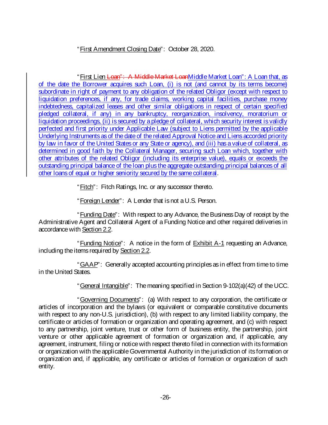 “First Amendment Closing Date”: October 28, 2020. “First Lien Loan”: A Middle Market LoanMiddle Market Loan”: A Loan that, as of the date the Borrower acquires such Loan, (i) is not (and cannot by its terms become) subordinate in right of payment to any obligation of the related Obligor (except with respect to liquidation preferences, if any, for trade claims, working capital facilities, purchase money indebtedness, capitalized leases and other similar obligations in respect of certain specified pledged collateral, if any) in any bankruptcy, reorganization, insolvency, moratorium or liquidation proceedings, (ii) is secured by a pledge of collateral, which security interest is validly perfected and first priority under Applicable Law (subject to Liens permitted by the applicable Underlying Instruments as of the date of the related Approval Notice and Liens accorded priority by law in favor of the United States or any State or agency), and (iii) has a value of collateral, as determined in good faith by the Collateral Manager, securing such Loan which, together with other attributes of the related Obligor (including its enterprise value), equals or exceeds the outstanding principal balance of the loan plus the aggregate outstanding principal balances of all other loans of equal or higher seniority secured by the same collateral. “Fitch”: Fitch Ratings, Inc. or any successor thereto. “Foreign Lender”: A Lender that is not a U.S. Person. “Funding Date”: With respect to any Advance, the Business Day of receipt by the Administrative Agent and Collateral Agent of a Funding Notice and other required deliveries in accordance with Section 2.2. “Funding Notice”: A notice in the form of Exhibit A-1 requesting an Advance, including the items required by Section 2.2. “GAAP”: Generally accepted accounting principles as in effect from time to time in the United States. “General Intangible”: The meaning specified in Section 9-102(a)(42) of the UCC. “Governing Documents”: (a) With respect to any corporation, the certificate or articles of incorporation and the bylaws (or equivalent or comparable constitutive documents with respect to any non-U.S. jurisdiction), (b) with respect to any limited liability company, the certificate or articles of formation or organization and operating agreement, and (c) with respect to any partnership, joint venture, trust or other form of business entity, the partnership, joint venture or other applicable agreement of formation or organization and, if applicable, any agreement, instrument, filing or notice with respect thereto filed in connection with its formation or organization with the applicable Governmental Authority in the jurisdiction of its formation or organization and, if applicable, any certificate or articles of formation or organization of such entity. -26-