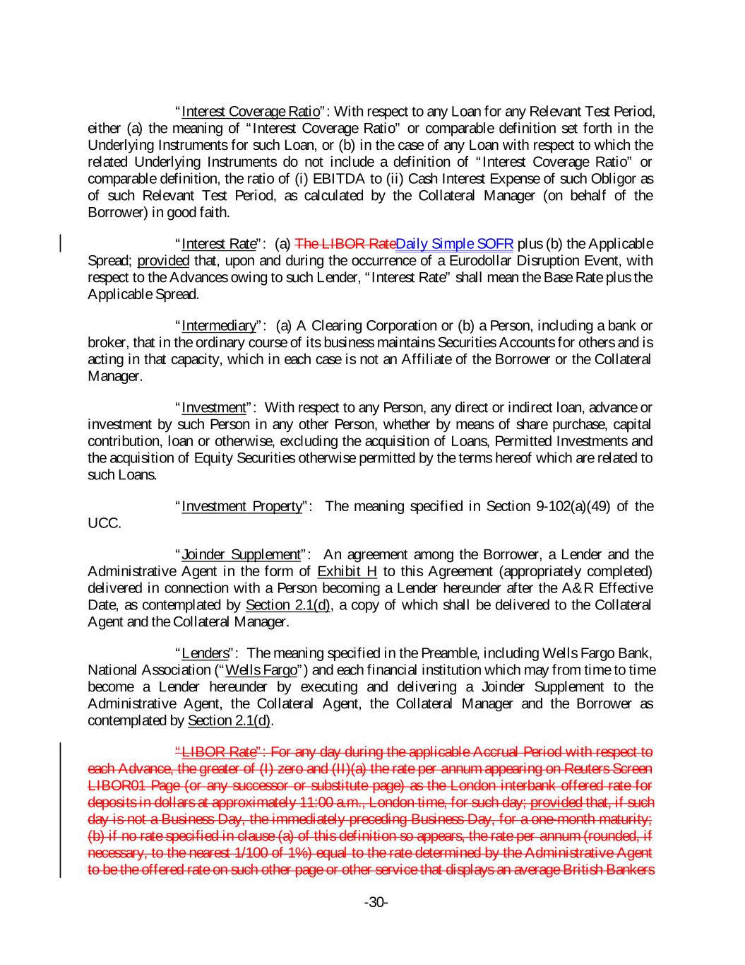 “Interest Coverage Ratio”: With respect to any Loan for any Relevant Test Period, either (a) the meaning of “Interest Coverage Ratio” or comparable definition set forth in the Underlying Instruments for such Loan, or (b) in the case of any Loan with respect to which the related Underlying Instruments do not include a definition of “Interest Coverage Ratio” or comparable definition, the ratio of (i) EBITDA to (ii) Cash Interest Expense of such Obligor as of such Relevant Test Period, as calculated by the Collateral Manager (on behalf of the Borrower) in good faith. “Interest Rate”: (a) The LIBOR RateDaily Simple SOFR plus (b) the Applicable Spread; provided that, upon and during the occurrence of a Eurodollar Disruption Event, with respect to the Advances owing to such Lender, “Interest Rate” shall mean the Base Rate plus the Applicable Spread. “Intermediary”: (a) A Clearing Corporation or (b) a Person, including a bank or broker, that in the ordinary course of its business maintains Securities Accounts for others and is acting in that capacity, which in each case is not an Affiliate of the Borrower or the Collateral Manager. “Investment”: With respect to any Person, any direct or indirect loan, advance or investment by such Person in any other Person, whether by means of share purchase, capital contribution, loan or otherwise, excluding the acquisition of Loans, Permitted Investments and the acquisition of Equity Securities otherwise permitted by the terms hereof which are related to such Loans. “Investment Property”: The meaning specified in Section 9-102(a)(49) of the UCC. “Joinder Supplement”: An agreement among the Borrower, a Lender and the Administrative Agent in the form of Exhibit H to this Agreement (appropriately completed) delivered in connection with a Person becoming a Lender hereunder after the A&R Effective Date, as contemplated by Section 2.1(d), a copy of which shall be delivered to the Collateral Agent and the Collateral Manager. “Lenders”: The meaning specified in the Preamble, including Wells Fargo Bank, National Association (“Wells Fargo”) and each financial institution which may from time to time become a Lender hereunder by executing and delivering a Joinder Supplement to the Administrative Agent, the Collateral Agent, the Collateral Manager and the Borrower as contemplated by Section 2.1(d). “LIBOR Rate”: For any day during the applicable Accrual Period with respect to each Advance, the greater of (I) zero and (II)(a) the rate per annum appearing on Reuters Screen LIBOR01 Page (or any successor or substitute page) as the London interbank offered rate for deposits in dollars at approximately 11:00 a.m., London time, for such day; provided that, if such day is not a Business Day, the immediately preceding Business Day, for a one-month maturity; (b) if no rate specified in clause (a) of this definition so appears, the rate per annum (rounded, if necessary, to the nearest 1/100 of 1%) equal to the rate determined by the Administrative Agent to be the offered rate on such other page or other service that displays an average British Bankers -30-