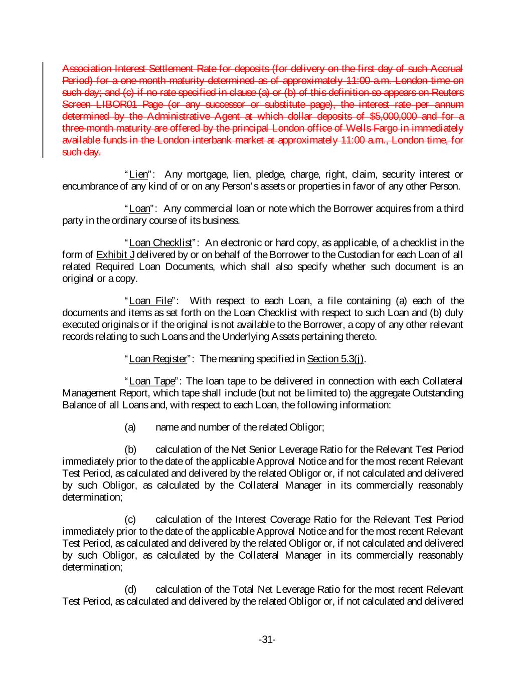 Association Interest Settlement Rate for deposits (for delivery on the first day of such Accrual Period) for a one-month maturity determined as of approximately 11:00 a.m. London time on such day; and (c) if no rate specified in clause (a) or (b) of this definition so appears on Reuters Screen LIBOR01 Page (or any successor or substitute page), the interest rate per annum determined by the Administrative Agent at which dollar deposits of $5,000,000 and for a three-month maturity are offered by the principal London office of Wells Fargo in immediately available funds in the London interbank market at approximately 11:00 a.m., London time, for such day. “Lien”: Any mortgage, lien, pledge, charge, right, claim, security interest or encumbrance of any kind of or on any Person’s assets or properties in favor of any other Person. “Loan”: Any commercial loan or note which the Borrower acquires from a third party in the ordinary course of its business. “Loan Checklist”: An electronic or hard copy, as applicable, of a checklist in the form of Exhibit J delivered by or on behalf of the Borrower to the Custodian for each Loan of all related Required Loan Documents, which shall also specify whether such document is an original or a copy. “Loan File”: With respect to each Loan, a file containing (a) each of the documents and items as set forth on the Loan Checklist with respect to such Loan and (b) duly executed originals or if the original is not available to the Borrower, a copy of any other relevant records relating to such Loans and the Underlying Assets pertaining thereto. “Loan Register”: The meaning specified in Section 5.3(j). “Loan Tape”: The loan tape to be delivered in connection with each Collateral Management Report, which tape shall include (but not be limited to) the aggregate Outstanding Balance of all Loans and, with respect to each Loan, the following information: (a) name and number of the related Obligor; (b) calculation of the Net Senior Leverage Ratio for the Relevant Test Period immediately prior to the date of the applicable Approval Notice and for the most recent Relevant Test Period, as calculated and delivered by the related Obligor or, if not calculated and delivered by such Obligor, as calculated by the Collateral Manager in its commercially reasonably determination; (c) calculation of the Interest Coverage Ratio for the Relevant Test Period immediately prior to the date of the applicable Approval Notice and for the most recent Relevant Test Period, as calculated and delivered by the related Obligor or, if not calculated and delivered by such Obligor, as calculated by the Collateral Manager in its commercially reasonably determination; (d) calculation of the Total Net Leverage Ratio for the most recent Relevant Test Period, as calculated and delivered by the related Obligor or, if not calculated and delivered -31-