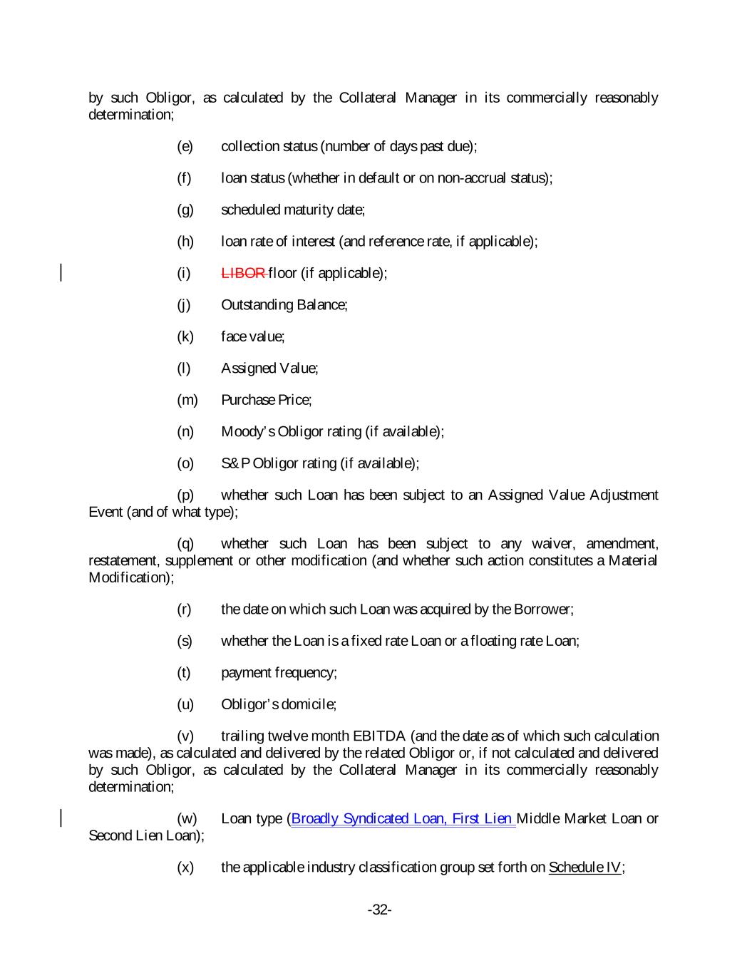 by such Obligor, as calculated by the Collateral Manager in its commercially reasonably determination; (e) collection status (number of days past due); (f) loan status (whether in default or on non-accrual status); (g) scheduled maturity date; (h) loan rate of interest (and reference rate, if applicable); (i) LIBOR floor (if applicable); (j) Outstanding Balance; (k) face value; (l) Assigned Value; (m) Purchase Price; (n) Moody’s Obligor rating (if available); (o) S&P Obligor rating (if available); (p) whether such Loan has been subject to an Assigned Value Adjustment Event (and of what type); (q) whether such Loan has been subject to any waiver, amendment, restatement, supplement or other modification (and whether such action constitutes a Material Modification); (r) the date on which such Loan was acquired by the Borrower; (s) whether the Loan is a fixed rate Loan or a floating rate Loan; (t) payment frequency; (u) Obligor’s domicile; (v) trailing twelve month EBITDA (and the date as of which such calculation was made), as calculated and delivered by the related Obligor or, if not calculated and delivered by such Obligor, as calculated by the Collateral Manager in its commercially reasonably determination; (w) Loan type (Broadly Syndicated Loan, First Lien Middle Market Loan or Second Lien Loan); (x) the applicable industry classification group set forth on Schedule IV; -32-