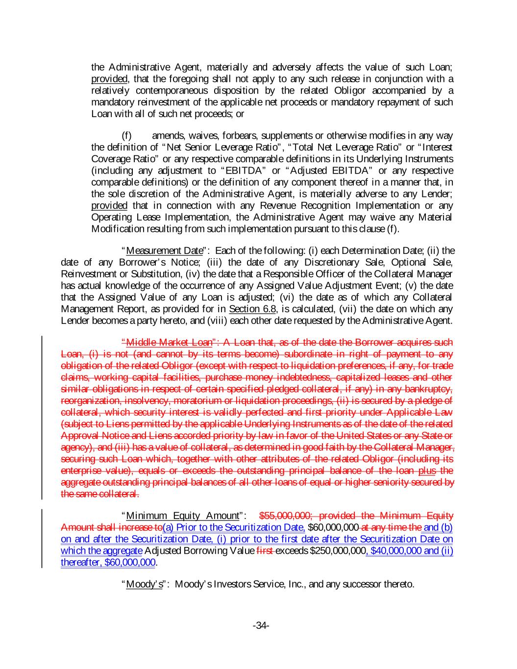 the Administrative Agent, materially and adversely affects the value of such Loan; provided, that the foregoing shall not apply to any such release in conjunction with a relatively contemporaneous disposition by the related Obligor accompanied by a mandatory reinvestment of the applicable net proceeds or mandatory repayment of such Loan with all of such net proceeds; or (f) amends, waives, forbears, supplements or otherwise modifies in any way the definition of “Net Senior Leverage Ratio”, “Total Net Leverage Ratio” or “Interest Coverage Ratio” or any respective comparable definitions in its Underlying Instruments (including any adjustment to “EBITDA” or “Adjusted EBITDA” or any respective comparable definitions) or the definition of any component thereof in a manner that, in the sole discretion of the Administrative Agent, is materially adverse to any Lender; provided that in connection with any Revenue Recognition Implementation or any Operating Lease Implementation, the Administrative Agent may waive any Material Modification resulting from such implementation pursuant to this clause (f). “Measurement Date”: Each of the following: (i) each Determination Date; (ii) the date of any Borrower’s Notice; (iii) the date of any Discretionary Sale, Optional Sale, Reinvestment or Substitution, (iv) the date that a Responsible Officer of the Collateral Manager has actual knowledge of the occurrence of any Assigned Value Adjustment Event; (v) the date that the Assigned Value of any Loan is adjusted; (vi) the date as of which any Collateral Management Report, as provided for in Section 6.8, is calculated, (vii) the date on which any Lender becomes a party hereto, and (viii) each other date requested by the Administrative Agent. “Middle Market Loan”: A Loan that, as of the date the Borrower acquires such Loan, (i) is not (and cannot by its terms become) subordinate in right of payment to any obligation of the related Obligor (except with respect to liquidation preferences, if any, for trade claims, working capital facilities, purchase money indebtedness, capitalized leases and other similar obligations in respect of certain specified pledged collateral, if any) in any bankruptcy, reorganization, insolvency, moratorium or liquidation proceedings, (ii) is secured by a pledge of collateral, which security interest is validly perfected and first priority under Applicable Law (subject to Liens permitted by the applicable Underlying Instruments as of the date of the related Approval Notice and Liens accorded priority by law in favor of the United States or any State or agency), and (iii) has a value of collateral, as determined in good faith by the Collateral Manager, securing such Loan which, together with other attributes of the related Obligor (including its enterprise value), equals or exceeds the outstanding principal balance of the loan plus the aggregate outstanding principal balances of all other loans of equal or higher seniority secured by the same collateral. “Minimum Equity Amount”: $55,000,000; provided the Minimum Equity Amount shall increase to(a) Prior to the Securitization Date, $60,000,000 at any time the and (b) on and after the Securitization Date, (i) prior to the first date after the Securitization Date on which the aggregate Adjusted Borrowing Value first exceeds $250,000,000, $40,000,000 and (ii) thereafter, $60,000,000. “Moody’s”: Moody’s Investors Service, Inc., and any successor thereto. -34-