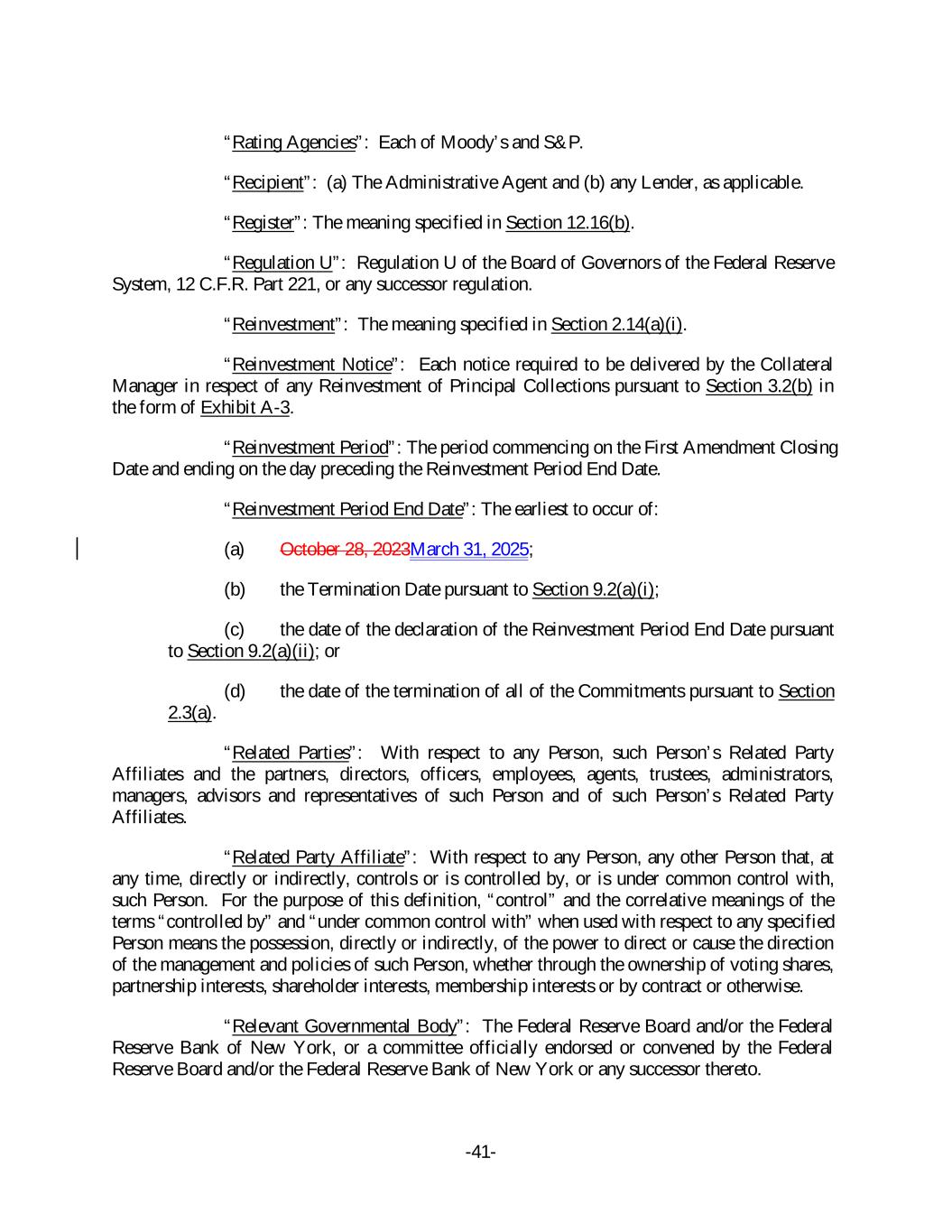 “Rating Agencies”: Each of Moody’s and S&P. “Recipient”: (a) The Administrative Agent and (b) any Lender, as applicable. “Register”: The meaning specified in Section 12.16(b). “Regulation U”: Regulation U of the Board of Governors of the Federal Reserve System, 12 C.F.R. Part 221, or any successor regulation. “Reinvestment”: The meaning specified in Section 2.14(a)(i). “Reinvestment Notice”: Each notice required to be delivered by the Collateral Manager in respect of any Reinvestment of Principal Collections pursuant to Section 3.2(b) in the form of Exhibit A-3. “Reinvestment Period”: The period commencing on the First Amendment Closing Date and ending on the day preceding the Reinvestment Period End Date. “Reinvestment Period End Date”: The earliest to occur of: (a) October 28, 2023March 31, 2025; (b) the Termination Date pursuant to Section 9.2(a)(i); (c) the date of the declaration of the Reinvestment Period End Date pursuant to Section 9.2(a)(ii); or (d) the date of the termination of all of the Commitments pursuant to Section 2.3(a). “Related Parties”: With respect to any Person, such Person’s Related Party Affiliates and the partners, directors, officers, employees, agents, trustees, administrators, managers, advisors and representatives of such Person and of such Person’s Related Party Affiliates. “Related Party Affiliate”: With respect to any Person, any other Person that, at any time, directly or indirectly, controls or is controlled by, or is under common control with, such Person. For the purpose of this definition, “control” and the correlative meanings of the terms “controlled by” and “under common control with” when used with respect to any specified Person means the possession, directly or indirectly, of the power to direct or cause the direction of the management and policies of such Person, whether through the ownership of voting shares, partnership interests, shareholder interests, membership interests or by contract or otherwise. “Relevant Governmental Body”: The Federal Reserve Board and/or the Federal Reserve Bank of New York, or a committee officially endorsed or convened by the Federal Reserve Board and/or the Federal Reserve Bank of New York or any successor thereto. -41-