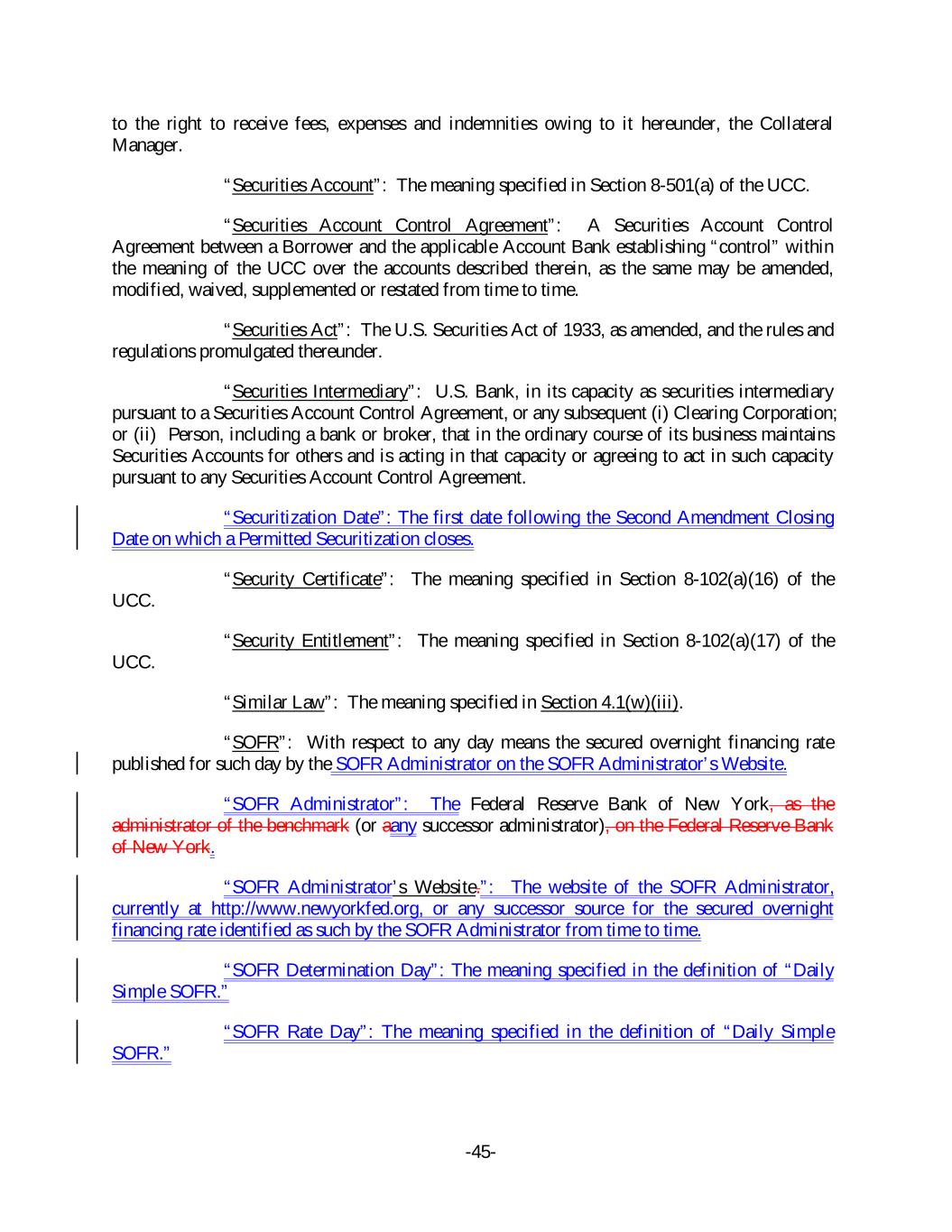 to the right to receive fees, expenses and indemnities owing to it hereunder, the Collateral Manager. “Securities Account”: The meaning specified in Section 8-501(a) of the UCC. “Securities Account Control Agreement”: A Securities Account Control Agreement between a Borrower and the applicable Account Bank establishing “control” within the meaning of the UCC over the accounts described therein, as the same may be amended, modified, waived, supplemented or restated from time to time. “Securities Act”: The U.S. Securities Act of 1933, as amended, and the rules and regulations promulgated thereunder. “Securities Intermediary”: U.S. Bank, in its capacity as securities intermediary pursuant to a Securities Account Control Agreement, or any subsequent (i) Clearing Corporation; or (ii) Person, including a bank or broker, that in the ordinary course of its business maintains Securities Accounts for others and is acting in that capacity or agreeing to act in such capacity pursuant to any Securities Account Control Agreement. “Securitization Date”: The first date following the Second Amendment Closing Date on which a Permitted Securitization closes. “Security Certificate”: The meaning specified in Section 8-102(a)(16) of the UCC. “Security Entitlement”: The meaning specified in Section 8-102(a)(17) of the UCC. “Similar Law”: The meaning specified in Section 4.1(w)(iii). “SOFR”: With respect to any day means the secured overnight financing rate published for such day by the SOFR Administrator on the SOFR Administrator’s Website. “SOFR Administrator”: The Federal Reserve Bank of New York, as the administrator of the benchmark (or aany successor administrator), on the Federal Reserve Bank of New York. “SOFR Administrator’s Website.”: The website of the SOFR Administrator, currently at http://www.newyorkfed.org, or any successor source for the secured overnight financing rate identified as such by the SOFR Administrator from time to time. “SOFR Determination Day”: The meaning specified in the definition of “Daily Simple SOFR.” “SOFR Rate Day”: The meaning specified in the definition of “Daily Simple SOFR.” -45-