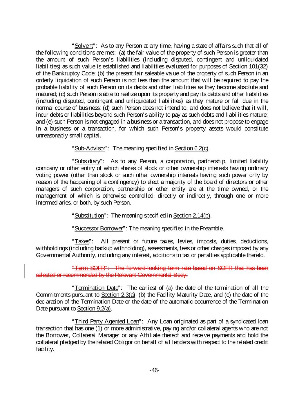 “Solvent”: As to any Person at any time, having a state of affairs such that all of the following conditions are met: (a) the fair value of the property of such Person is greater than the amount of such Person’s liabilities (including disputed, contingent and unliquidated liabilities) as such value is established and liabilities evaluated for purposes of Section 101(32) of the Bankruptcy Code; (b) the present fair saleable value of the property of such Person in an orderly liquidation of such Person is not less than the amount that will be required to pay the probable liability of such Person on its debts and other liabilities as they become absolute and matured; (c) such Person is able to realize upon its property and pay its debts and other liabilities (including disputed, contingent and unliquidated liabilities) as they mature or fall due in the normal course of business; (d) such Person does not intend to, and does not believe that it will, incur debts or liabilities beyond such Person’s ability to pay as such debts and liabilities mature; and (e) such Person is not engaged in a business or a transaction, and does not propose to engage in a business or a transaction, for which such Person’s property assets would constitute unreasonably small capital. “Sub-Advisor”: The meaning specified in Section 6.2(c). “Subsidiary”: As to any Person, a corporation, partnership, limited liability company or other entity of which shares of stock or other ownership interests having ordinary voting power (other than stock or such other ownership interests having such power only by reason of the happening of a contingency) to elect a majority of the board of directors or other managers of such corporation, partnership or other entity are at the time owned, or the management of which is otherwise controlled, directly or indirectly, through one or more intermediaries, or both, by such Person. “Substitution”: The meaning specified in Section 2.14(b). “Successor Borrower”: The meaning specified in the Preamble. “Taxes”: All present or future taxes, levies, imposts, duties, deductions, withholdings (including backup withholding), assessments, fees or other charges imposed by any Governmental Authority, including any interest, additions to tax or penalties applicable thereto. “Term SOFR”: The forward-looking term rate based on SOFR that has been selected or recommended by the Relevant Governmental Body. “Termination Date”: The earliest of (a) the date of the termination of all the Commitments pursuant to Section 2.3(a), (b) the Facility Maturity Date, and (c) the date of the declaration of the Termination Date or the date of the automatic occurrence of the Termination Date pursuant to Section 9.2(a). “Third Party Agented Loan”: Any Loan originated as part of a syndicated loan transaction that has one (1) or more administrative, paying and/or collateral agents who are not the Borrower, Collateral Manager or any Affiliate thereof and receive payments and hold the collateral pledged by the related Obligor on behalf of all lenders with respect to the related credit facility. -46-