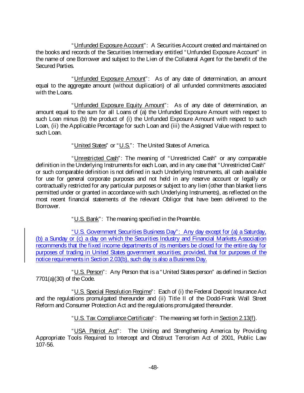“Unfunded Exposure Account”: A Securities Account created and maintained on the books and records of the Securities Intermediary entitled “Unfunded Exposure Account” in the name of one Borrower and subject to the Lien of the Collateral Agent for the benefit of the Secured Parties. “Unfunded Exposure Amount”: As of any date of determination, an amount equal to the aggregate amount (without duplication) of all unfunded commitments associated with the Loans. “Unfunded Exposure Equity Amount”: As of any date of determination, an amount equal to the sum for all Loans of (a) the Unfunded Exposure Amount with respect to such Loan minus (b) the product of (i) the Unfunded Exposure Amount with respect to such Loan, (ii) the Applicable Percentage for such Loan and (iii) the Assigned Value with respect to such Loan. “United States” or “U.S.”: The United States of America. “Unrestricted Cash”: The meaning of “Unrestricted Cash” or any comparable definition in the Underlying Instruments for each Loan, and in any case that “Unrestricted Cash” or such comparable definition is not defined in such Underlying Instruments, all cash available for use for general corporate purposes and not held in any reserve account or legally or contractually restricted for any particular purposes or subject to any lien (other than blanket liens permitted under or granted in accordance with such Underlying Instruments), as reflected on the most recent financial statements of the relevant Obligor that have been delivered to the Borrower. “U.S. Bank”: The meaning specified in the Preamble. “U.S. Government Securities Business Day”: Any day except for (a) a Saturday, (b) a Sunday or (c) a day on which the Securities Industry and Financial Markets Association recommends that the fixed income departments of its members be closed for the entire day for purposes of trading in United States government securities; provided, that for purposes of the notice requirements in Section 2.03(b), such day is also a Business Day. “U.S. Person”: Any Person that is a “United States person” as defined in Section 7701(a)(30) of the Code. “U.S. Special Resolution Regime”: Each of (i) the Federal Deposit Insurance Act and the regulations promulgated thereunder and (ii) Title II of the Dodd-Frank Wall Street Reform and Consumer Protection Act and the regulations promulgated thereunder. “U.S. Tax Compliance Certificate”: The meaning set forth in Section 2.13(f). “USA Patriot Act”: The Uniting and Strengthening America by Providing Appropriate Tools Required to Intercept and Obstruct Terrorism Act of 2001, Public Law 107-56. -48-