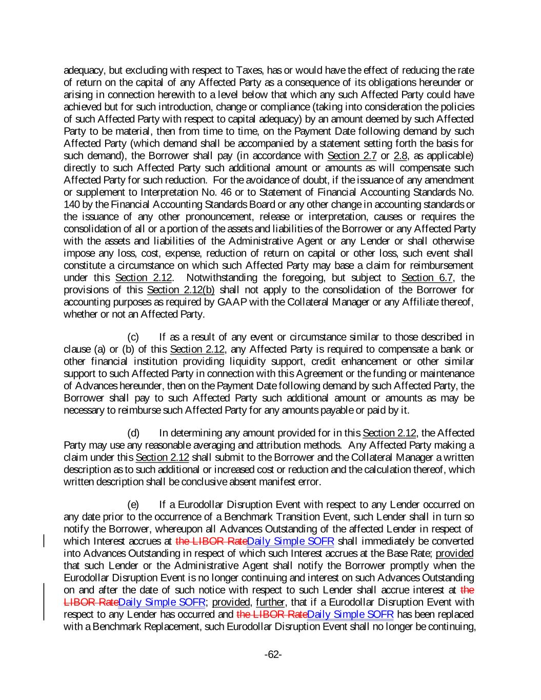 adequacy, but excluding with respect to Taxes, has or would have the effect of reducing the rate of return on the capital of any Affected Party as a consequence of its obligations hereunder or arising in connection herewith to a level below that which any such Affected Party could have achieved but for such introduction, change or compliance (taking into consideration the policies of such Affected Party with respect to capital adequacy) by an amount deemed by such Affected Party to be material, then from time to time, on the Payment Date following demand by such Affected Party (which demand shall be accompanied by a statement setting forth the basis for such demand), the Borrower shall pay (in accordance with Section 2.7 or 2.8, as applicable) directly to such Affected Party such additional amount or amounts as will compensate such Affected Party for such reduction. For the avoidance of doubt, if the issuance of any amendment or supplement to Interpretation No. 46 or to Statement of Financial Accounting Standards No. 140 by the Financial Accounting Standards Board or any other change in accounting standards or the issuance of any other pronouncement, release or interpretation, causes or requires the consolidation of all or a portion of the assets and liabilities of the Borrower or any Affected Party with the assets and liabilities of the Administrative Agent or any Lender or shall otherwise impose any loss, cost, expense, reduction of return on capital or other loss, such event shall constitute a circumstance on which such Affected Party may base a claim for reimbursement under this Section 2.12. Notwithstanding the foregoing, but subject to Section 6.7, the provisions of this Section 2.12(b) shall not apply to the consolidation of the Borrower for accounting purposes as required by GAAP with the Collateral Manager or any Affiliate thereof, whether or not an Affected Party. (c) If as a result of any event or circumstance similar to those described in clause (a) or (b) of this Section 2.12, any Affected Party is required to compensate a bank or other financial institution providing liquidity support, credit enhancement or other similar support to such Affected Party in connection with this Agreement or the funding or maintenance of Advances hereunder, then on the Payment Date following demand by such Affected Party, the Borrower shall pay to such Affected Party such additional amount or amounts as may be necessary to reimburse such Affected Party for any amounts payable or paid by it. (d) In determining any amount provided for in this Section 2.12, the Affected Party may use any reasonable averaging and attribution methods. Any Affected Party making a claim under this Section 2.12 shall submit to the Borrower and the Collateral Manager a written description as to such additional or increased cost or reduction and the calculation thereof, which written description shall be conclusive absent manifest error. (e) If a Eurodollar Disruption Event with respect to any Lender occurred on any date prior to the occurrence of a Benchmark Transition Event, such Lender shall in turn so notify the Borrower, whereupon all Advances Outstanding of the affected Lender in respect of which Interest accrues at the LIBOR RateDaily Simple SOFR shall immediately be converted into Advances Outstanding in respect of which such Interest accrues at the Base Rate; provided that such Lender or the Administrative Agent shall notify the Borrower promptly when the Eurodollar Disruption Event is no longer continuing and interest on such Advances Outstanding on and after the date of such notice with respect to such Lender shall accrue interest at the LIBOR RateDaily Simple SOFR; provided, further, that if a Eurodollar Disruption Event with respect to any Lender has occurred and the LIBOR RateDaily Simple SOFR has been replaced with a Benchmark Replacement, such Eurodollar Disruption Event shall no longer be continuing, -62-