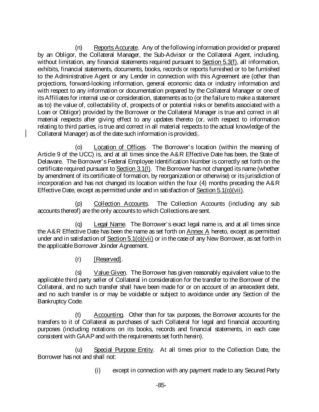 (n) Reports Accurate. Any of the following information provided or prepared by an Obligor, the Collateral Manager, the Sub-Advisor or the Collateral Agent, including, without limitation, any financial statements required pursuant to Section 5.3(f), all information, exhibits, financial statements, documents, books, records or reports furnished or to be furnished to the Administrative Agent or any Lender in connection with this Agreement are (other than projections, forward-looking information, general economic data or industry information and with respect to any information or documentation prepared by the Collateral Manager or one of its Affiliates for internal use or consideration, statements as to (or the failure to make a statement as to) the value of, collectability of, prospects of or potential risks or benefits associated with a Loan or Obligor) provided by the Borrower or the Collateral Manager is true and correct in all material respects after giving effect to any updates thereto (or, with respect to information relating to third parties, is true and correct in all material respects to the actual knowledge of the Collateral Manager) as of the date such information is provided;. (o) Location of Offices. The Borrower’s location (within the meaning of Article 9 of the UCC) is, and at all times since the A&R Effective Date has been, the State of Delaware. The Borrower’s Federal Employee Identification Number is correctly set forth on the certificate required pursuant to Section 3.1(l). The Borrower has not changed its name (whether by amendment of its certificate of formation, by reorganization or otherwise) or its jurisdiction of incorporation and has not changed its location within the four (4) months preceding the A&R Effective Date, except as permitted under and in satisfaction of Section 5.1(o)(vii). (p) Collection Accounts. The Collection Accounts (including any sub accounts thereof) are the only accounts to which Collections are sent. (q) Legal Name. The Borrower’s exact legal name is, and at all times since the A&R Effective Date has been the name as set forth on Annex A hereto, except as permitted under and in satisfaction of Section 5.1(o)(vii) or in the case of any New Borrower, as set forth in the applicable Borrower Joinder Agreement. (r) [Reserved]. (s) Value Given. The Borrower has given reasonably equivalent value to the applicable third party seller of Collateral in consideration for the transfer to the Borrower of the Collateral, and no such transfer shall have been made for or on account of an antecedent debt, and no such transfer is or may be voidable or subject to avoidance under any Section of the Bankruptcy Code. (t) Accounting. Other than for tax purposes, the Borrower accounts for the transfers to it of Collateral as purchases of such Collateral for legal and financial accounting purposes (including notations on its books, records and financial statements, in each case consistent with GAAP and with the requirements set forth herein). (u) Special Purpose Entity. At all times prior to the Collection Date, the Borrower has not and shall not: (i) except in connection with any payment made to any Secured Party -85-