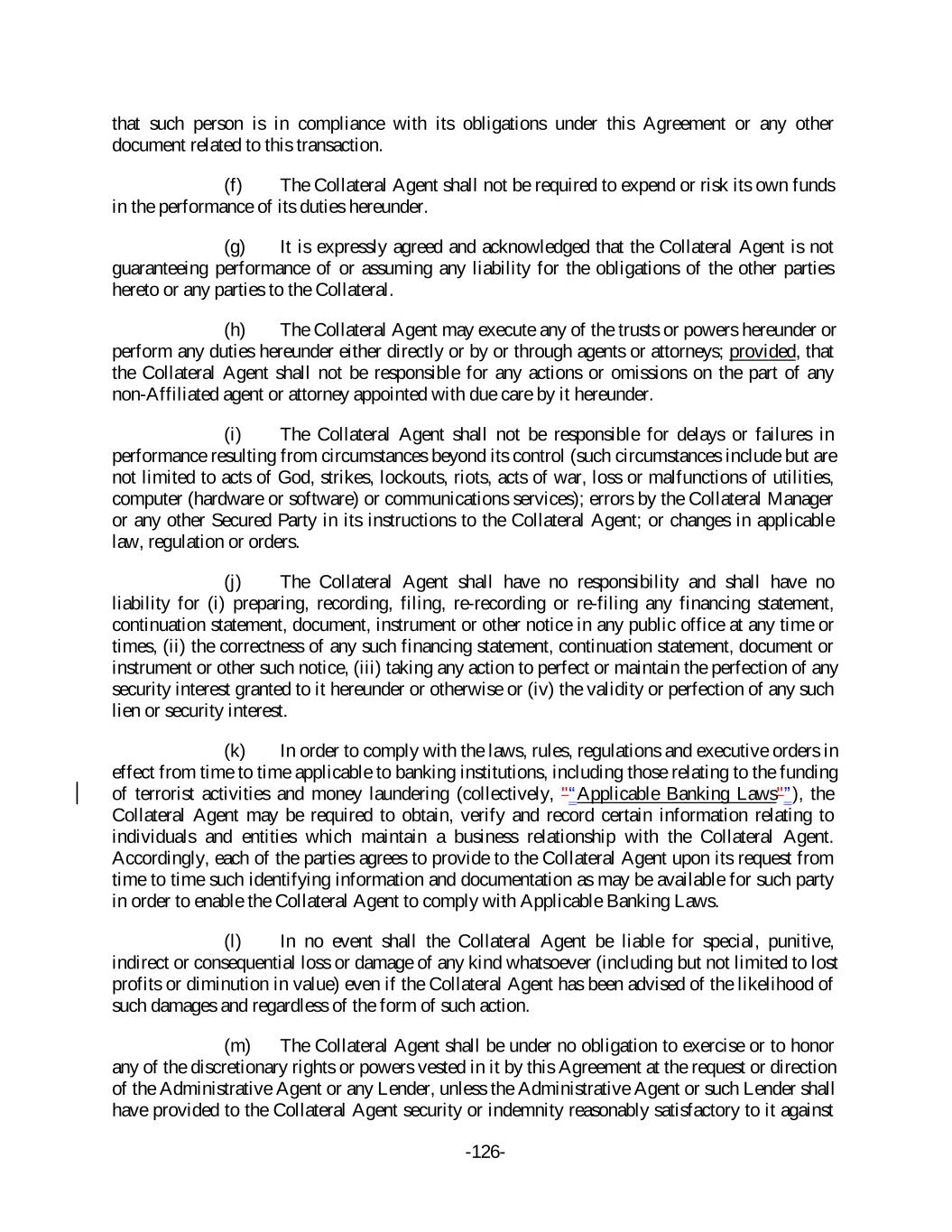 that such person is in compliance with its obligations under this Agreement or any other document related to this transaction. (f) The Collateral Agent shall not be required to expend or risk its own funds in the performance of its duties hereunder. (g) It is expressly agreed and acknowledged that the Collateral Agent is not guaranteeing performance of or assuming any liability for the obligations of the other parties hereto or any parties to the Collateral. (h) The Collateral Agent may execute any of the trusts or powers hereunder or perform any duties hereunder either directly or by or through agents or attorneys; provided, that the Collateral Agent shall not be responsible for any actions or omissions on the part of any non-Affiliated agent or attorney appointed with due care by it hereunder. (i) The Collateral Agent shall not be responsible for delays or failures in performance resulting from circumstances beyond its control (such circumstances include but are not limited to acts of God, strikes, lockouts, riots, acts of war, loss or malfunctions of utilities, computer (hardware or software) or communications services); errors by the Collateral Manager or any other Secured Party in its instructions to the Collateral Agent; or changes in applicable law, regulation or orders. (j) The Collateral Agent shall have no responsibility and shall have no liability for (i) preparing, recording, filing, re-recording or re-filing any financing statement, continuation statement, document, instrument or other notice in any public office at any time or times, (ii) the correctness of any such financing statement, continuation statement, document or instrument or other such notice, (iii) taking any action to perfect or maintain the perfection of any security interest granted to it hereunder or otherwise or (iv) the validity or perfection of any such lien or security interest. (k) In order to comply with the laws, rules, regulations and executive orders in effect from time to time applicable to banking institutions, including those relating to the funding of terrorist activities and money laundering (collectively, "“Applicable Banking Laws"”), the Collateral Agent may be required to obtain, verify and record certain information relating to individuals and entities which maintain a business relationship with the Collateral Agent. Accordingly, each of the parties agrees to provide to the Collateral Agent upon its request from time to time such identifying information and documentation as may be available for such party in order to enable the Collateral Agent to comply with Applicable Banking Laws. (l) In no event shall the Collateral Agent be liable for special, punitive, indirect or consequential loss or damage of any kind whatsoever (including but not limited to lost profits or diminution in value) even if the Collateral Agent has been advised of the likelihood of such damages and regardless of the form of such action. (m) The Collateral Agent shall be under no obligation to exercise or to honor any of the discretionary rights or powers vested in it by this Agreement at the request or direction of the Administrative Agent or any Lender, unless the Administrative Agent or such Lender shall have provided to the Collateral Agent security or indemnity reasonably satisfactory to it against -126-
