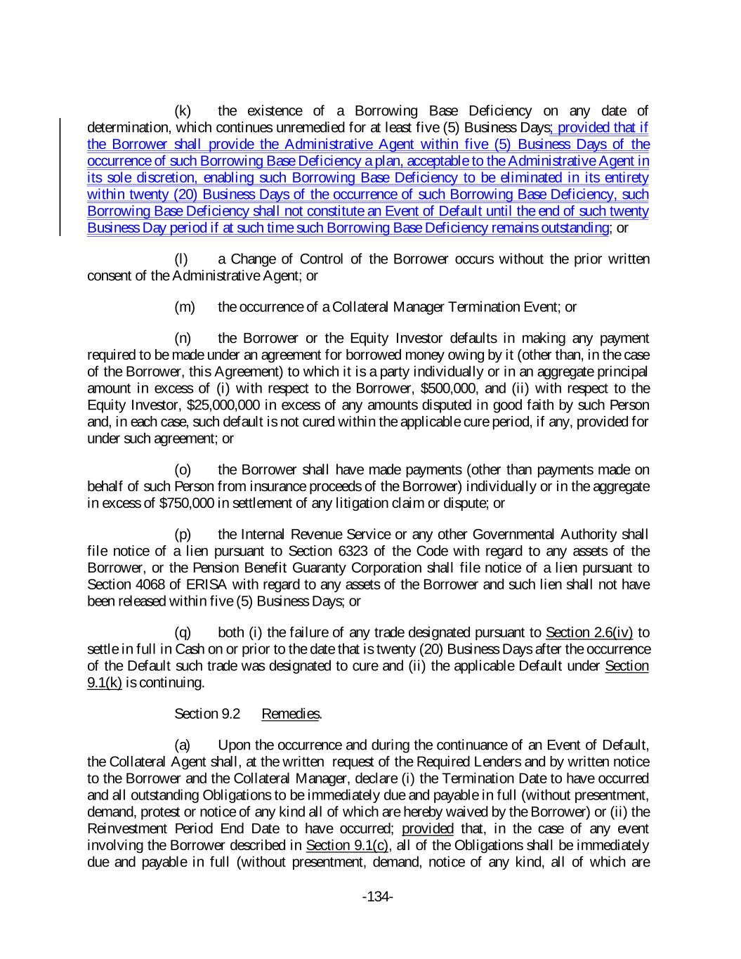 (k) the existence of a Borrowing Base Deficiency on any date of determination, which continues unremedied for at least five (5) Business Days; provided that if the Borrower shall provide the Administrative Agent within five (5) Business Days of the occurrence of such Borrowing Base Deficiency a plan, acceptable to the Administrative Agent in its sole discretion, enabling such Borrowing Base Deficiency to be eliminated in its entirety within twenty (20) Business Days of the occurrence of such Borrowing Base Deficiency, such Borrowing Base Deficiency shall not constitute an Event of Default until the end of such twenty Business Day period if at such time such Borrowing Base Deficiency remains outstanding; or (l) a Change of Control of the Borrower occurs without the prior written consent of the Administrative Agent; or (m) the occurrence of a Collateral Manager Termination Event; or (n) the Borrower or the Equity Investor defaults in making any payment required to be made under an agreement for borrowed money owing by it (other than, in the case of the Borrower, this Agreement) to which it is a party individually or in an aggregate principal amount in excess of (i) with respect to the Borrower, $500,000, and (ii) with respect to the Equity Investor, $25,000,000 in excess of any amounts disputed in good faith by such Person and, in each case, such default is not cured within the applicable cure period, if any, provided for under such agreement; or (o) the Borrower shall have made payments (other than payments made on behalf of such Person from insurance proceeds of the Borrower) individually or in the aggregate in excess of $750,000 in settlement of any litigation claim or dispute; or (p) the Internal Revenue Service or any other Governmental Authority shall file notice of a lien pursuant to Section 6323 of the Code with regard to any assets of the Borrower, or the Pension Benefit Guaranty Corporation shall file notice of a lien pursuant to Section 4068 of ERISA with regard to any assets of the Borrower and such lien shall not have been released within five (5) Business Days; or (q) both (i) the failure of any trade designated pursuant to Section 2.6(iv) to settle in full in Cash on or prior to the date that is twenty (20) Business Days after the occurrence of the Default such trade was designated to cure and (ii) the applicable Default under Section 9.1(k) is continuing. Section 9.2 Remedies. (a) Upon the occurrence and during the continuance of an Event of Default, the Collateral Agent shall, at the written request of the Required Lenders and by written notice to the Borrower and the Collateral Manager, declare (i) the Termination Date to have occurred and all outstanding Obligations to be immediately due and payable in full (without presentment, demand, protest or notice of any kind all of which are hereby waived by the Borrower) or (ii) the Reinvestment Period End Date to have occurred; provided that, in the case of any event involving the Borrower described in Section 9.1(c), all of the Obligations shall be immediately due and payable in full (without presentment, demand, notice of any kind, all of which are -134-