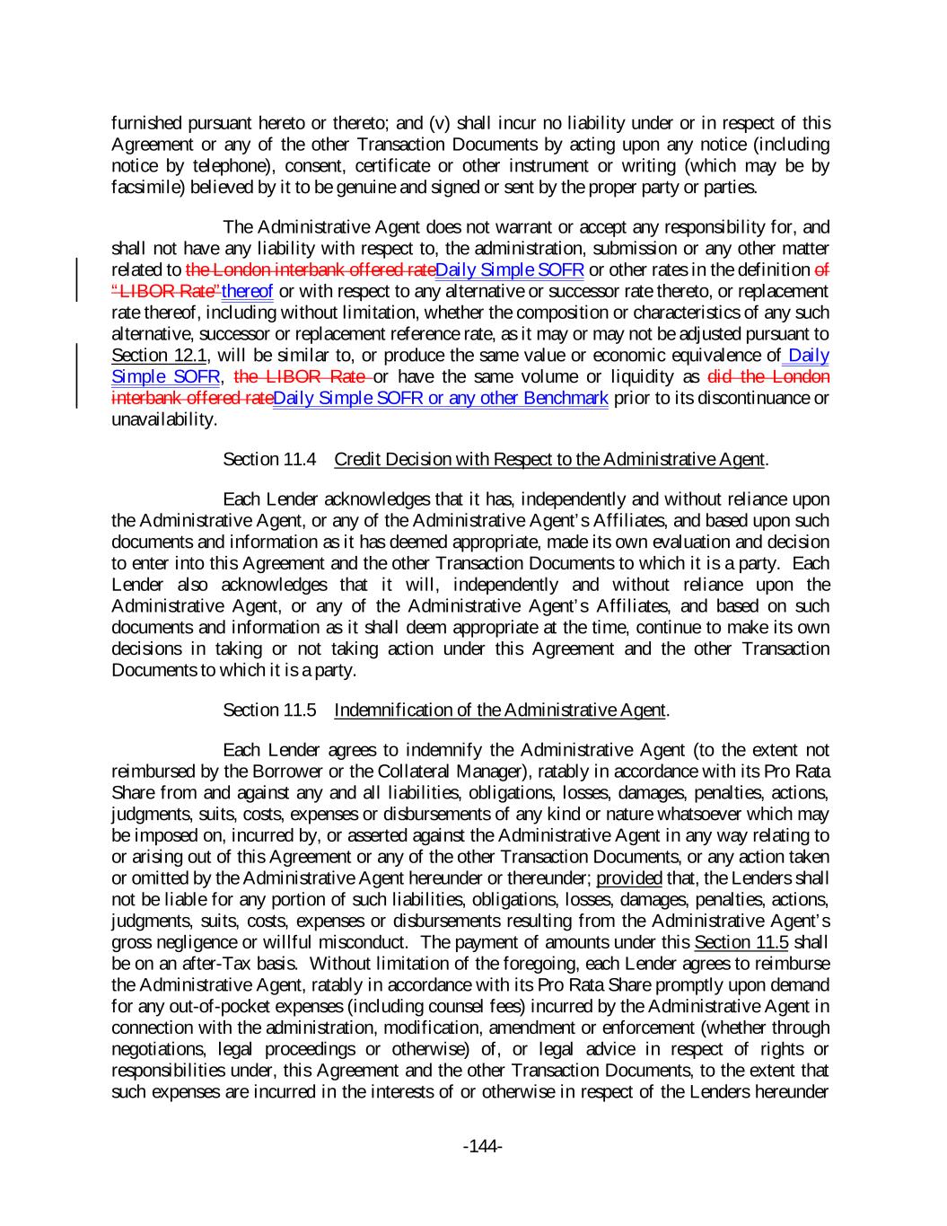 furnished pursuant hereto or thereto; and (v) shall incur no liability under or in respect of this Agreement or any of the other Transaction Documents by acting upon any notice (including notice by telephone), consent, certificate or other instrument or writing (which may be by facsimile) believed by it to be genuine and signed or sent by the proper party or parties. The Administrative Agent does not warrant or accept any responsibility for, and shall not have any liability with respect to, the administration, submission or any other matter related to the London interbank offered rateDaily Simple SOFR or other rates in the definition of “LIBOR Rate”thereof or with respect to any alternative or successor rate thereto, or replacement rate thereof, including without limitation, whether the composition or characteristics of any such alternative, successor or replacement reference rate, as it may or may not be adjusted pursuant to Section 12.1, will be similar to, or produce the same value or economic equivalence of Daily Simple SOFR, the LIBOR Rate or have the same volume or liquidity as did the London interbank offered rateDaily Simple SOFR or any other Benchmark prior to its discontinuance or unavailability. Section 11.4 Credit Decision with Respect to the Administrative Agent. Each Lender acknowledges that it has, independently and without reliance upon the Administrative Agent, or any of the Administrative Agent’s Affiliates, and based upon such documents and information as it has deemed appropriate, made its own evaluation and decision to enter into this Agreement and the other Transaction Documents to which it is a party. Each Lender also acknowledges that it will, independently and without reliance upon the Administrative Agent, or any of the Administrative Agent’s Affiliates, and based on such documents and information as it shall deem appropriate at the time, continue to make its own decisions in taking or not taking action under this Agreement and the other Transaction Documents to which it is a party. Section 11.5 Indemnification of the Administrative Agent. Each Lender agrees to indemnify the Administrative Agent (to the extent not reimbursed by the Borrower or the Collateral Manager), ratably in accordance with its Pro Rata Share from and against any and all liabilities, obligations, losses, damages, penalties, actions, judgments, suits, costs, expenses or disbursements of any kind or nature whatsoever which may be imposed on, incurred by, or asserted against the Administrative Agent in any way relating to or arising out of this Agreement or any of the other Transaction Documents, or any action taken or omitted by the Administrative Agent hereunder or thereunder; provided that, the Lenders shall not be liable for any portion of such liabilities, obligations, losses, damages, penalties, actions, judgments, suits, costs, expenses or disbursements resulting from the Administrative Agent’s gross negligence or willful misconduct. The payment of amounts under this Section 11.5 shall be on an after-Tax basis. Without limitation of the foregoing, each Lender agrees to reimburse the Administrative Agent, ratably in accordance with its Pro Rata Share promptly upon demand for any out-of-pocket expenses (including counsel fees) incurred by the Administrative Agent in connection with the administration, modification, amendment or enforcement (whether through negotiations, legal proceedings or otherwise) of, or legal advice in respect of rights or responsibilities under, this Agreement and the other Transaction Documents, to the extent that such expenses are incurred in the interests of or otherwise in respect of the Lenders hereunder -144-