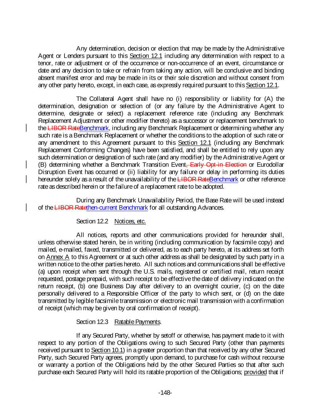 Any determination, decision or election that may be made by the Administrative Agent or Lenders pursuant to this Section 12.1 including any determination with respect to a tenor, rate or adjustment or of the occurrence or non-occurrence of an event, circumstance or date and any decision to take or refrain from taking any action, will be conclusive and binding absent manifest error and may be made in its or their sole discretion and without consent from any other party hereto, except, in each case, as expressly required pursuant to this Section 12.1. The Collateral Agent shall have no (i) responsibility or liability for (A) the determination, designation or selection of (or any failure by the Administrative Agent to determine, designate or select) a replacement reference rate (including any Benchmark Replacement Adjustment or other modifier thereto) as a successor or replacement benchmark to the LIBOR RateBenchmark, including any Benchmark Replacement or determining whether any such rate is a Benchmark Replacement or whether the conditions to the adoption of such rate or any amendment to this Agreement pursuant to this Section 12.1 (including any Benchmark Replacement Conforming Changes) have been satisfied, and shall be entitled to rely upon any such determination or designation of such rate (and any modifier) by the Administrative Agent or (B) determining whether a Benchmark Transition Event, Early Opt-in Election or Eurodollar Disruption Event has occurred or (ii) liability for any failure or delay in performing its duties hereunder solely as a result of the unavailability of the LIBOR RateBenchmark or other reference rate as described herein or the failure of a replacement rate to be adopted. During any Benchmark Unavailability Period, the Base Rate will be used instead of the LIBOR Ratethen-current Benchmark for all outstanding Advances. Section 12.2 Notices, etc. All notices, reports and other communications provided for hereunder shall, unless otherwise stated herein, be in writing (including communication by facsimile copy) and mailed, e-mailed, faxed, transmitted or delivered, as to each party hereto, at its address set forth on Annex A to this Agreement or at such other address as shall be designated by such party in a written notice to the other parties hereto. All such notices and communications shall be effective (a) upon receipt when sent through the U.S. mails, registered or certified mail, return receipt requested, postage prepaid, with such receipt to be effective the date of delivery indicated on the return receipt, (b) one Business Day after delivery to an overnight courier, (c) on the date personally delivered to a Responsible Officer of the party to which sent, or (d) on the date transmitted by legible facsimile transmission or electronic mail transmission with a confirmation of receipt (which may be given by oral confirmation of receipt). Section 12.3 Ratable Payments. If any Secured Party, whether by setoff or otherwise, has payment made to it with respect to any portion of the Obligations owing to such Secured Party (other than payments received pursuant to Section 10.1) in a greater proportion than that received by any other Secured Party, such Secured Party agrees, promptly upon demand, to purchase for cash without recourse or warranty a portion of the Obligations held by the other Secured Parties so that after such purchase each Secured Party will hold its ratable proportion of the Obligations; provided that if -148-