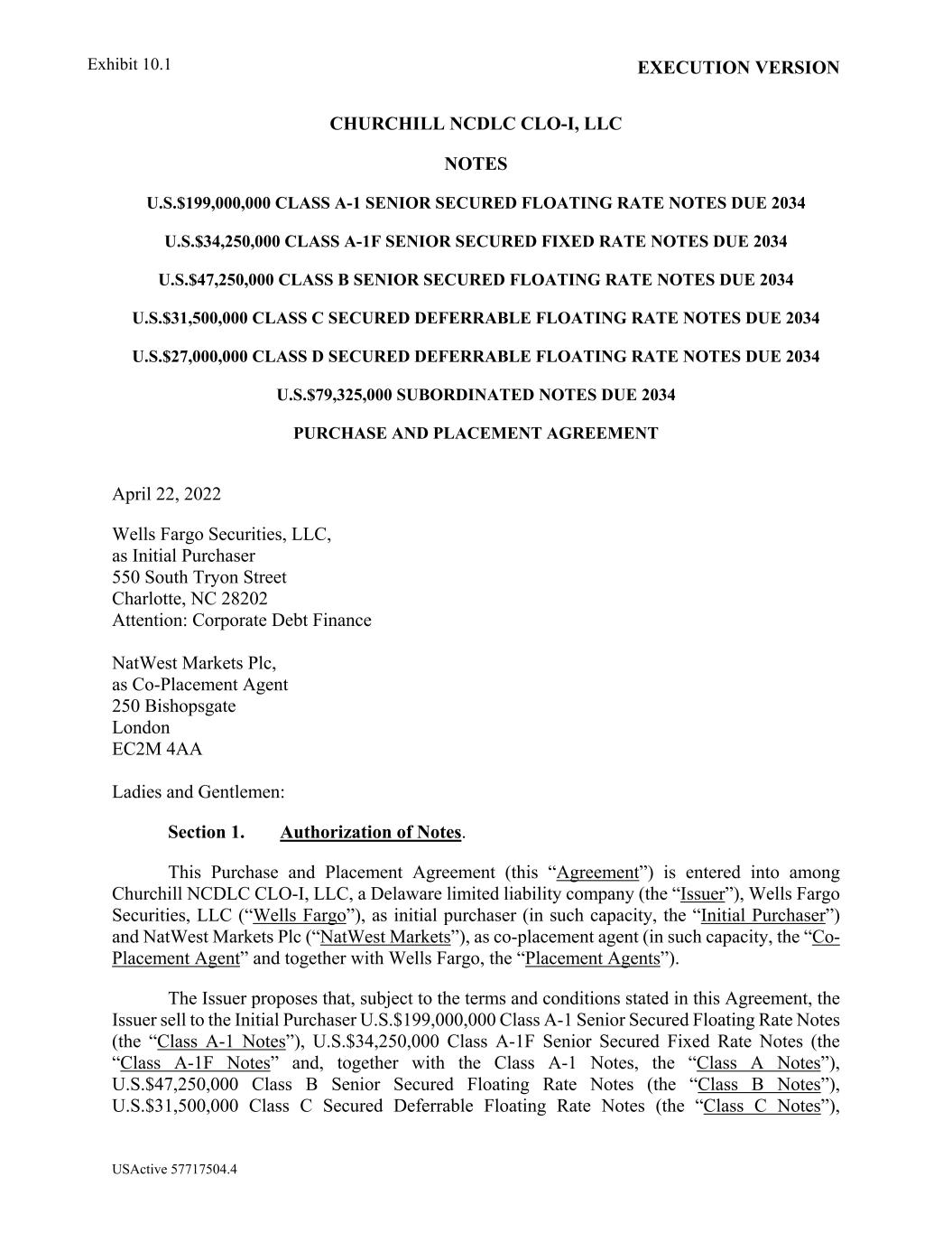 EXECUTION VERSION USActive 57717504.4 CHURCHILL NCDLC CLO-I, LLC NOTES U.S.$199,000,000 CLASS A-1 SENIOR SECURED FLOATING RATE NOTES DUE 2034 U.S.$34,250,000 CLASS A-1F SENIOR SECURED FIXED RATE NOTES DUE 2034 U.S.$47,250,000 CLASS B SENIOR SECURED FLOATING RATE NOTES DUE 2034 U.S.$31,500,000 CLASS C SECURED DEFERRABLE FLOATING RATE NOTES DUE 2034 U.S.$27,000,000 CLASS D SECURED DEFERRABLE FLOATING RATE NOTES DUE 2034 U.S.$79,325,000 SUBORDINATED NOTES DUE 2034 PURCHASE AND PLACEMENT AGREEMENT April 22, 2022 Wells Fargo Securities, LLC, as Initial Purchaser 550 South Tryon Street Charlotte, NC 28202 Attention: Corporate Debt Finance NatWest Markets Plc, as Co-Placement Agent 250 Bishopsgate London EC2M 4AA Ladies and Gentlemen: Section 1. Authorization of Notes. This Purchase and Placement Agreement (this “Agreement”) is entered into among Churchill NCDLC CLO-I, LLC, a Delaware limited liability company (the “Issuer”), Wells Fargo Securities, LLC (“Wells Fargo”), as initial purchaser (in such capacity, the “Initial Purchaser”) and NatWest Markets Plc (“NatWest Markets”), as co-placement agent (in such capacity, the “Co- Placement Agent” and together with Wells Fargo, the “Placement Agents”). The Issuer proposes that, subject to the terms and conditions stated in this Agreement, the Issuer sell to the Initial Purchaser U.S.$199,000,000 Class A-1 Senior Secured Floating Rate Notes (the “Class A-1 Notes”), U.S.$34,250,000 Class A-1F Senior Secured Fixed Rate Notes (the “Class A-1F Notes” and, together with the Class A-1 Notes, the “Class A Notes”), U.S.$47,250,000 Class B Senior Secured Floating Rate Notes (the “Class B Notes”), U.S.$31,500,000 Class C Secured Deferrable Floating Rate Notes (the “Class C Notes”), Exhibit 10.1