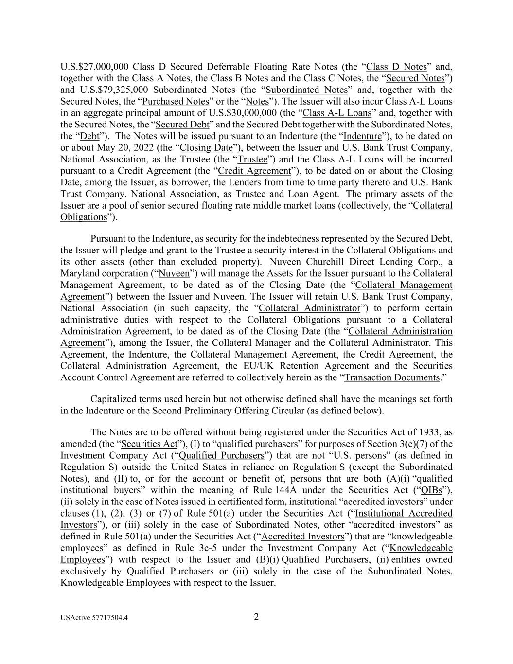 USActive 57717504.4 2 U.S.$27,000,000 Class D Secured Deferrable Floating Rate Notes (the “Class D Notes” and, together with the Class A Notes, the Class B Notes and the Class C Notes, the “Secured Notes”) and U.S.$79,325,000 Subordinated Notes (the “Subordinated Notes” and, together with the Secured Notes, the “Purchased Notes” or the “Notes”). The Issuer will also incur Class A-L Loans in an aggregate principal amount of U.S.$30,000,000 (the “Class A-L Loans” and, together with the Secured Notes, the “Secured Debt” and the Secured Debt together with the Subordinated Notes, the “Debt”). The Notes will be issued pursuant to an Indenture (the “Indenture”), to be dated on or about May 20, 2022 (the “Closing Date”), between the Issuer and U.S. Bank Trust Company, National Association, as the Trustee (the “Trustee”) and the Class A-L Loans will be incurred pursuant to a Credit Agreement (the “Credit Agreement”), to be dated on or about the Closing Date, among the Issuer, as borrower, the Lenders from time to time party thereto and U.S. Bank Trust Company, National Association, as Trustee and Loan Agent. The primary assets of the Issuer are a pool of senior secured floating rate middle market loans (collectively, the “Collateral Obligations”). Pursuant to the Indenture, as security for the indebtedness represented by the Secured Debt, the Issuer will pledge and grant to the Trustee a security interest in the Collateral Obligations and its other assets (other than excluded property). Nuveen Churchill Direct Lending Corp., a Maryland corporation (“Nuveen”) will manage the Assets for the Issuer pursuant to the Collateral Management Agreement, to be dated as of the Closing Date (the “Collateral Management Agreement”) between the Issuer and Nuveen. The Issuer will retain U.S. Bank Trust Company, National Association (in such capacity, the “Collateral Administrator”) to perform certain administrative duties with respect to the Collateral Obligations pursuant to a Collateral Administration Agreement, to be dated as of the Closing Date (the “Collateral Administration Agreement”), among the Issuer, the Collateral Manager and the Collateral Administrator. This Agreement, the Indenture, the Collateral Management Agreement, the Credit Agreement, the Collateral Administration Agreement, the EU/UK Retention Agreement and the Securities Account Control Agreement are referred to collectively herein as the “Transaction Documents.” Capitalized terms used herein but not otherwise defined shall have the meanings set forth in the Indenture or the Second Preliminary Offering Circular (as defined below). The Notes are to be offered without being registered under the Securities Act of 1933, as amended (the “Securities Act”), (I) to “qualified purchasers” for purposes of Section 3(c)(7) of the Investment Company Act (“Qualified Purchasers”) that are not “U.S. persons” (as defined in Regulation S) outside the United States in reliance on Regulation S (except the Subordinated Notes), and (II) to, or for the account or benefit of, persons that are both (A)(i) “qualified institutional buyers” within the meaning of Rule 144A under the Securities Act (“QIBs”), (ii) solely in the case of Notes issued in certificated form, institutional “accredited investors” under clauses (1), (2), (3) or (7) of Rule 501(a) under the Securities Act (“Institutional Accredited Investors”), or (iii) solely in the case of Subordinated Notes, other “accredited investors” as defined in Rule 501(a) under the Securities Act (“Accredited Investors”) that are “knowledgeable employees” as defined in Rule 3c-5 under the Investment Company Act (“Knowledgeable Employees”) with respect to the Issuer and (B)(i) Qualified Purchasers, (ii) entities owned exclusively by Qualified Purchasers or (iii) solely in the case of the Subordinated Notes, Knowledgeable Employees with respect to the Issuer.