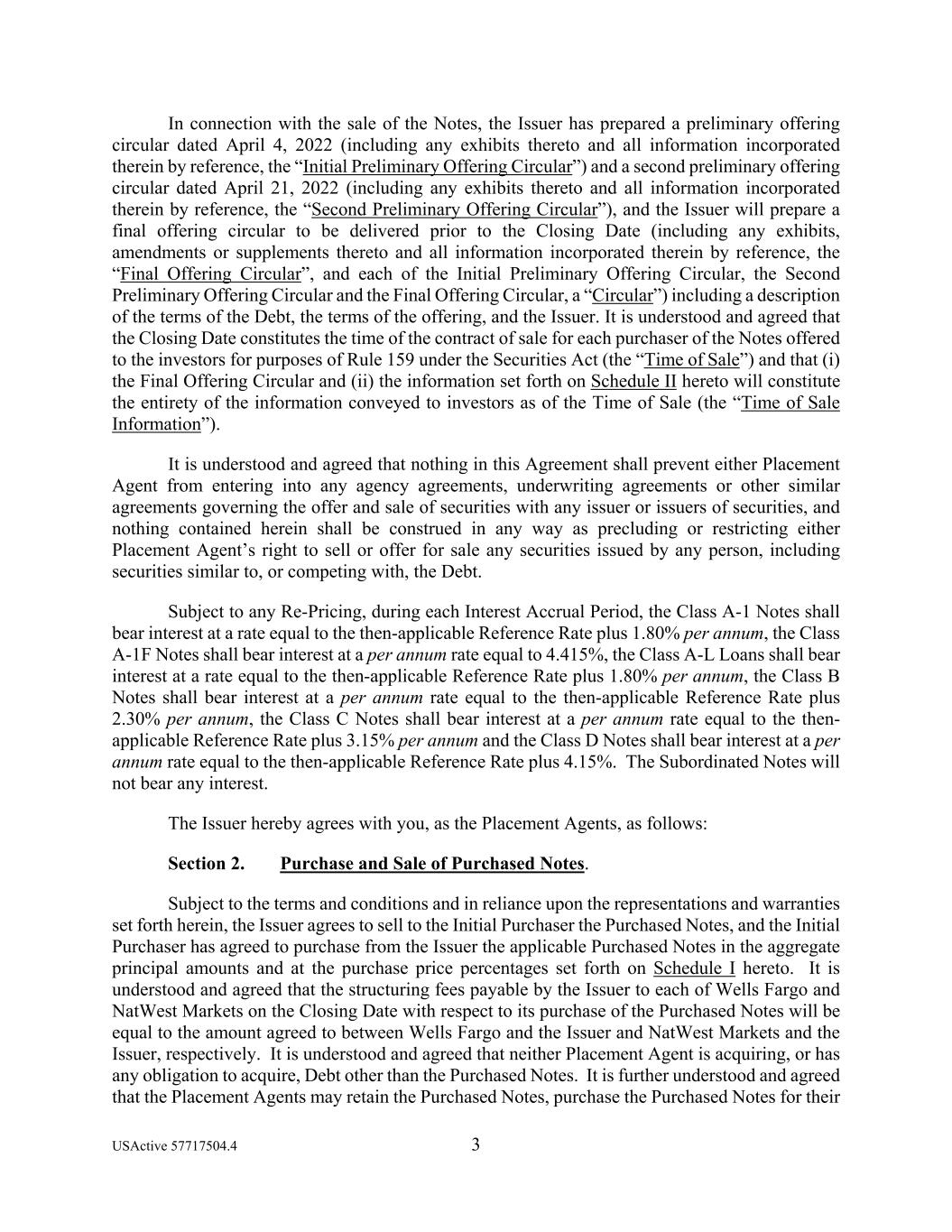 USActive 57717504.4 3 In connection with the sale of the Notes, the Issuer has prepared a preliminary offering circular dated April 4, 2022 (including any exhibits thereto and all information incorporated therein by reference, the “Initial Preliminary Offering Circular”) and a second preliminary offering circular dated April 21, 2022 (including any exhibits thereto and all information incorporated therein by reference, the “Second Preliminary Offering Circular”), and the Issuer will prepare a final offering circular to be delivered prior to the Closing Date (including any exhibits, amendments or supplements thereto and all information incorporated therein by reference, the “Final Offering Circular”, and each of the Initial Preliminary Offering Circular, the Second Preliminary Offering Circular and the Final Offering Circular, a “Circular”) including a description of the terms of the Debt, the terms of the offering, and the Issuer. It is understood and agreed that the Closing Date constitutes the time of the contract of sale for each purchaser of the Notes offered to the investors for purposes of Rule 159 under the Securities Act (the “Time of Sale”) and that (i) the Final Offering Circular and (ii) the information set forth on Schedule II hereto will constitute the entirety of the information conveyed to investors as of the Time of Sale (the “Time of Sale Information”). It is understood and agreed that nothing in this Agreement shall prevent either Placement Agent from entering into any agency agreements, underwriting agreements or other similar agreements governing the offer and sale of securities with any issuer or issuers of securities, and nothing contained herein shall be construed in any way as precluding or restricting either Placement Agent’s right to sell or offer for sale any securities issued by any person, including securities similar to, or competing with, the Debt. Subject to any Re-Pricing, during each Interest Accrual Period, the Class A-1 Notes shall bear interest at a rate equal to the then-applicable Reference Rate plus 1.80% per annum, the Class A-1F Notes shall bear interest at a per annum rate equal to 4.415%, the Class A-L Loans shall bear interest at a rate equal to the then-applicable Reference Rate plus 1.80% per annum, the Class B Notes shall bear interest at a per annum rate equal to the then-applicable Reference Rate plus 2.30% per annum, the Class C Notes shall bear interest at a per annum rate equal to the then- applicable Reference Rate plus 3.15% per annum and the Class D Notes shall bear interest at a per annum rate equal to the then-applicable Reference Rate plus 4.15%. The Subordinated Notes will not bear any interest. The Issuer hereby agrees with you, as the Placement Agents, as follows: Section 2. Purchase and Sale of Purchased Notes. Subject to the terms and conditions and in reliance upon the representations and warranties set forth herein, the Issuer agrees to sell to the Initial Purchaser the Purchased Notes, and the Initial Purchaser has agreed to purchase from the Issuer the applicable Purchased Notes in the aggregate principal amounts and at the purchase price percentages set forth on Schedule I hereto. It is understood and agreed that the structuring fees payable by the Issuer to each of Wells Fargo and NatWest Markets on the Closing Date with respect to its purchase of the Purchased Notes will be equal to the amount agreed to between Wells Fargo and the Issuer and NatWest Markets and the Issuer, respectively. It is understood and agreed that neither Placement Agent is acquiring, or has any obligation to acquire, Debt other than the Purchased Notes. It is further understood and agreed that the Placement Agents may retain the Purchased Notes, purchase the Purchased Notes for their