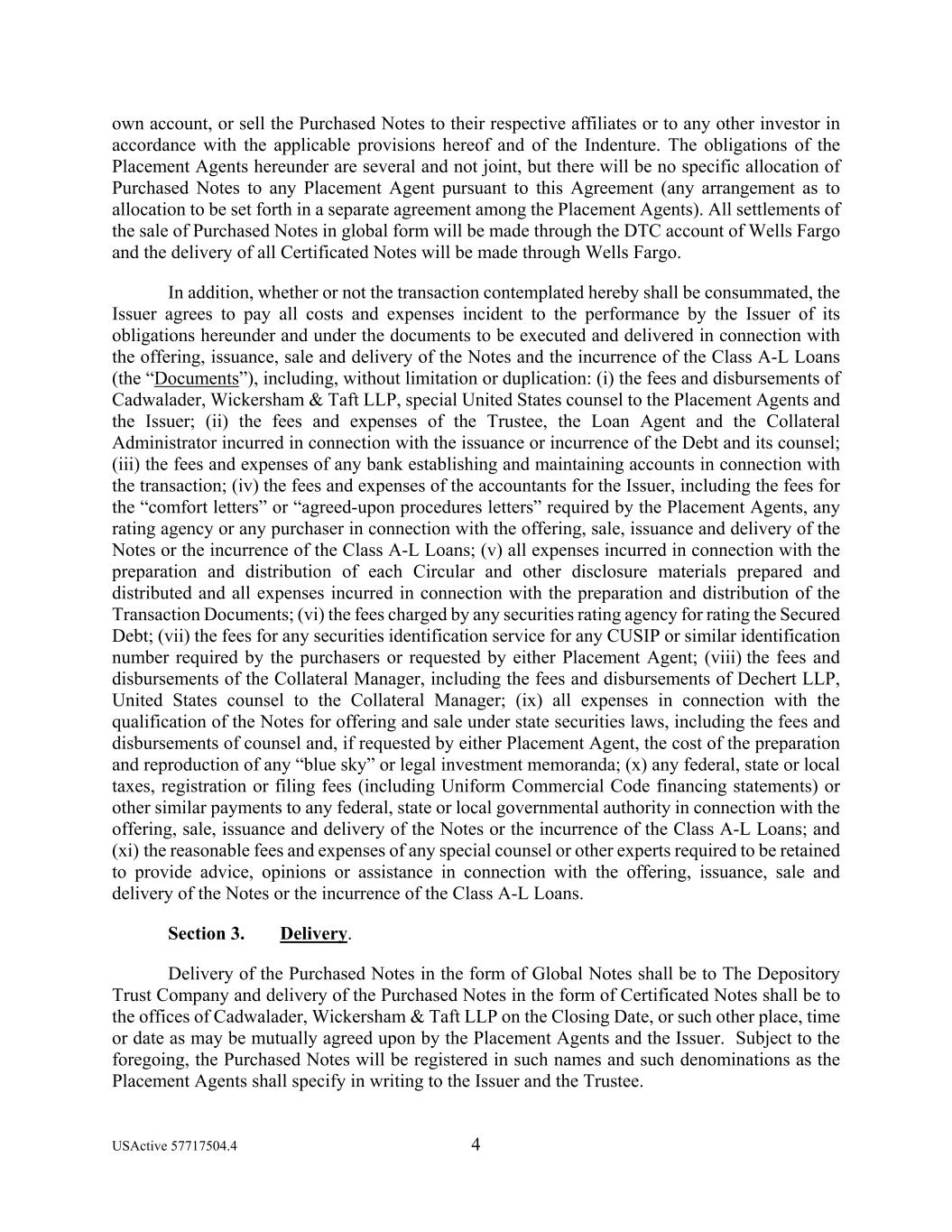 USActive 57717504.4 4 own account, or sell the Purchased Notes to their respective affiliates or to any other investor in accordance with the applicable provisions hereof and of the Indenture. The obligations of the Placement Agents hereunder are several and not joint, but there will be no specific allocation of Purchased Notes to any Placement Agent pursuant to this Agreement (any arrangement as to allocation to be set forth in a separate agreement among the Placement Agents). All settlements of the sale of Purchased Notes in global form will be made through the DTC account of Wells Fargo and the delivery of all Certificated Notes will be made through Wells Fargo. In addition, whether or not the transaction contemplated hereby shall be consummated, the Issuer agrees to pay all costs and expenses incident to the performance by the Issuer of its obligations hereunder and under the documents to be executed and delivered in connection with the offering, issuance, sale and delivery of the Notes and the incurrence of the Class A-L Loans (the “Documents”), including, without limitation or duplication: (i) the fees and disbursements of Cadwalader, Wickersham & Taft LLP, special United States counsel to the Placement Agents and the Issuer; (ii) the fees and expenses of the Trustee, the Loan Agent and the Collateral Administrator incurred in connection with the issuance or incurrence of the Debt and its counsel; (iii) the fees and expenses of any bank establishing and maintaining accounts in connection with the transaction; (iv) the fees and expenses of the accountants for the Issuer, including the fees for the “comfort letters” or “agreed-upon procedures letters” required by the Placement Agents, any rating agency or any purchaser in connection with the offering, sale, issuance and delivery of the Notes or the incurrence of the Class A-L Loans; (v) all expenses incurred in connection with the preparation and distribution of each Circular and other disclosure materials prepared and distributed and all expenses incurred in connection with the preparation and distribution of the Transaction Documents; (vi) the fees charged by any securities rating agency for rating the Secured Debt; (vii) the fees for any securities identification service for any CUSIP or similar identification number required by the purchasers or requested by either Placement Agent; (viii) the fees and disbursements of the Collateral Manager, including the fees and disbursements of Dechert LLP, United States counsel to the Collateral Manager; (ix) all expenses in connection with the qualification of the Notes for offering and sale under state securities laws, including the fees and disbursements of counsel and, if requested by either Placement Agent, the cost of the preparation and reproduction of any “blue sky” or legal investment memoranda; (x) any federal, state or local taxes, registration or filing fees (including Uniform Commercial Code financing statements) or other similar payments to any federal, state or local governmental authority in connection with the offering, sale, issuance and delivery of the Notes or the incurrence of the Class A-L Loans; and (xi) the reasonable fees and expenses of any special counsel or other experts required to be retained to provide advice, opinions or assistance in connection with the offering, issuance, sale and delivery of the Notes or the incurrence of the Class A-L Loans. Section 3. Delivery. Delivery of the Purchased Notes in the form of Global Notes shall be to The Depository Trust Company and delivery of the Purchased Notes in the form of Certificated Notes shall be to the offices of Cadwalader, Wickersham & Taft LLP on the Closing Date, or such other place, time or date as may be mutually agreed upon by the Placement Agents and the Issuer. Subject to the foregoing, the Purchased Notes will be registered in such names and such denominations as the Placement Agents shall specify in writing to the Issuer and the Trustee.