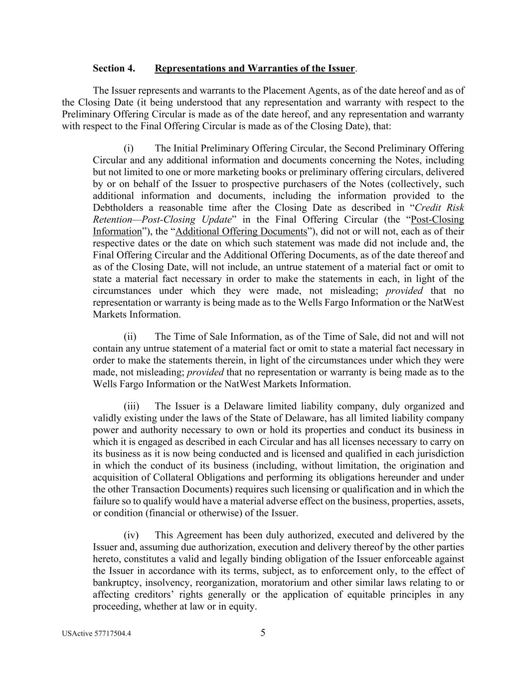 USActive 57717504.4 5 Section 4. Representations and Warranties of the Issuer. The Issuer represents and warrants to the Placement Agents, as of the date hereof and as of the Closing Date (it being understood that any representation and warranty with respect to the Preliminary Offering Circular is made as of the date hereof, and any representation and warranty with respect to the Final Offering Circular is made as of the Closing Date), that: (i) The Initial Preliminary Offering Circular, the Second Preliminary Offering Circular and any additional information and documents concerning the Notes, including but not limited to one or more marketing books or preliminary offering circulars, delivered by or on behalf of the Issuer to prospective purchasers of the Notes (collectively, such additional information and documents, including the information provided to the Debtholders a reasonable time after the Closing Date as described in “Credit Risk Retention—Post-Closing Update” in the Final Offering Circular (the “Post-Closing Information”), the “Additional Offering Documents”), did not or will not, each as of their respective dates or the date on which such statement was made did not include and, the Final Offering Circular and the Additional Offering Documents, as of the date thereof and as of the Closing Date, will not include, an untrue statement of a material fact or omit to state a material fact necessary in order to make the statements in each, in light of the circumstances under which they were made, not misleading; provided that no representation or warranty is being made as to the Wells Fargo Information or the NatWest Markets Information. (ii) The Time of Sale Information, as of the Time of Sale, did not and will not contain any untrue statement of a material fact or omit to state a material fact necessary in order to make the statements therein, in light of the circumstances under which they were made, not misleading; provided that no representation or warranty is being made as to the Wells Fargo Information or the NatWest Markets Information. (iii) The Issuer is a Delaware limited liability company, duly organized and validly existing under the laws of the State of Delaware, has all limited liability company power and authority necessary to own or hold its properties and conduct its business in which it is engaged as described in each Circular and has all licenses necessary to carry on its business as it is now being conducted and is licensed and qualified in each jurisdiction in which the conduct of its business (including, without limitation, the origination and acquisition of Collateral Obligations and performing its obligations hereunder and under the other Transaction Documents) requires such licensing or qualification and in which the failure so to qualify would have a material adverse effect on the business, properties, assets, or condition (financial or otherwise) of the Issuer. (iv) This Agreement has been duly authorized, executed and delivered by the Issuer and, assuming due authorization, execution and delivery thereof by the other parties hereto, constitutes a valid and legally binding obligation of the Issuer enforceable against the Issuer in accordance with its terms, subject, as to enforcement only, to the effect of bankruptcy, insolvency, reorganization, moratorium and other similar laws relating to or affecting creditors’ rights generally or the application of equitable principles in any proceeding, whether at law or in equity.