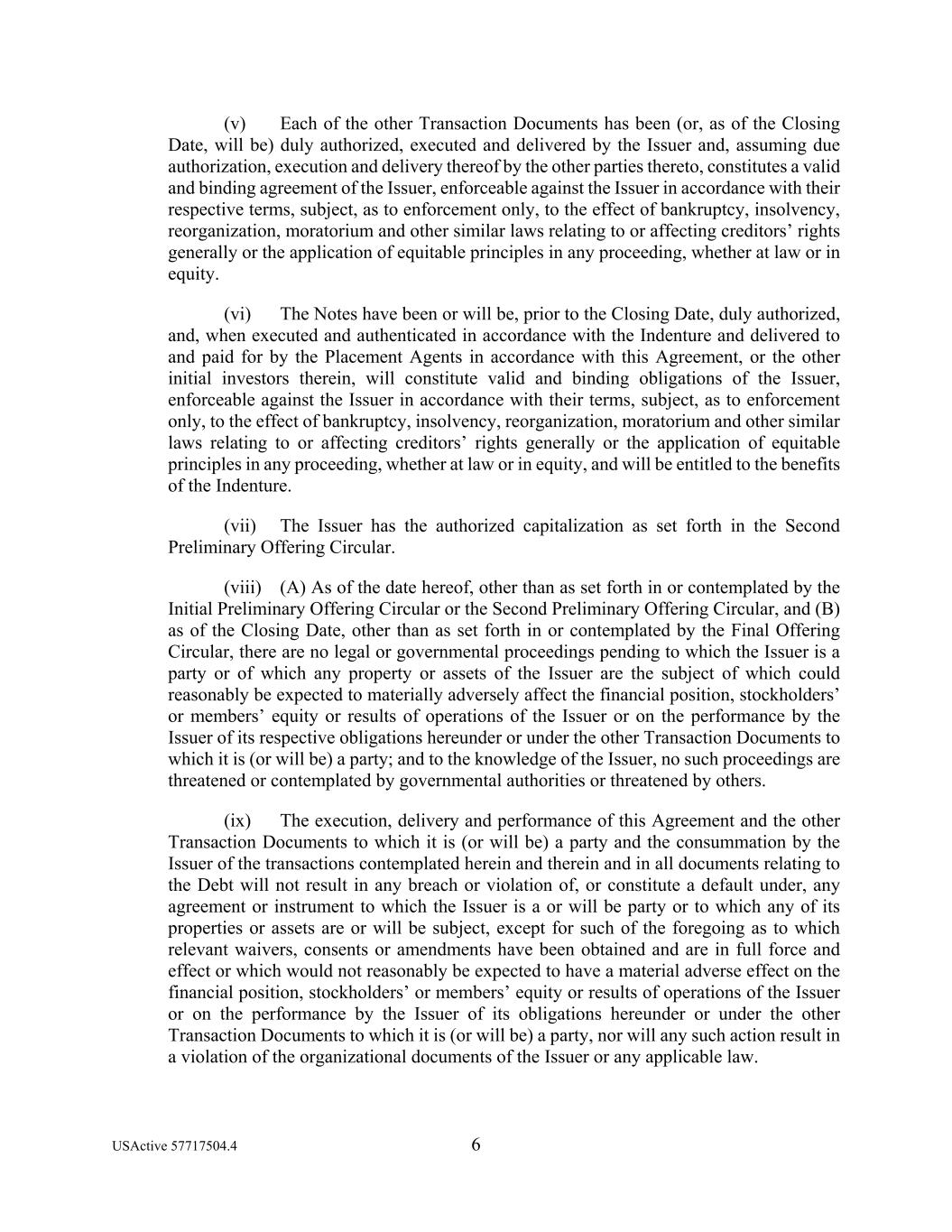 USActive 57717504.4 6 (v) Each of the other Transaction Documents has been (or, as of the Closing Date, will be) duly authorized, executed and delivered by the Issuer and, assuming due authorization, execution and delivery thereof by the other parties thereto, constitutes a valid and binding agreement of the Issuer, enforceable against the Issuer in accordance with their respective terms, subject, as to enforcement only, to the effect of bankruptcy, insolvency, reorganization, moratorium and other similar laws relating to or affecting creditors’ rights generally or the application of equitable principles in any proceeding, whether at law or in equity. (vi) The Notes have been or will be, prior to the Closing Date, duly authorized, and, when executed and authenticated in accordance with the Indenture and delivered to and paid for by the Placement Agents in accordance with this Agreement, or the other initial investors therein, will constitute valid and binding obligations of the Issuer, enforceable against the Issuer in accordance with their terms, subject, as to enforcement only, to the effect of bankruptcy, insolvency, reorganization, moratorium and other similar laws relating to or affecting creditors’ rights generally or the application of equitable principles in any proceeding, whether at law or in equity, and will be entitled to the benefits of the Indenture. (vii) The Issuer has the authorized capitalization as set forth in the Second Preliminary Offering Circular. (viii) (A) As of the date hereof, other than as set forth in or contemplated by the Initial Preliminary Offering Circular or the Second Preliminary Offering Circular, and (B) as of the Closing Date, other than as set forth in or contemplated by the Final Offering Circular, there are no legal or governmental proceedings pending to which the Issuer is a party or of which any property or assets of the Issuer are the subject of which could reasonably be expected to materially adversely affect the financial position, stockholders’ or members’ equity or results of operations of the Issuer or on the performance by the Issuer of its respective obligations hereunder or under the other Transaction Documents to which it is (or will be) a party; and to the knowledge of the Issuer, no such proceedings are threatened or contemplated by governmental authorities or threatened by others. (ix) The execution, delivery and performance of this Agreement and the other Transaction Documents to which it is (or will be) a party and the consummation by the Issuer of the transactions contemplated herein and therein and in all documents relating to the Debt will not result in any breach or violation of, or constitute a default under, any agreement or instrument to which the Issuer is a or will be party or to which any of its properties or assets are or will be subject, except for such of the foregoing as to which relevant waivers, consents or amendments have been obtained and are in full force and effect or which would not reasonably be expected to have a material adverse effect on the financial position, stockholders’ or members’ equity or results of operations of the Issuer or on the performance by the Issuer of its obligations hereunder or under the other Transaction Documents to which it is (or will be) a party, nor will any such action result in a violation of the organizational documents of the Issuer or any applicable law.