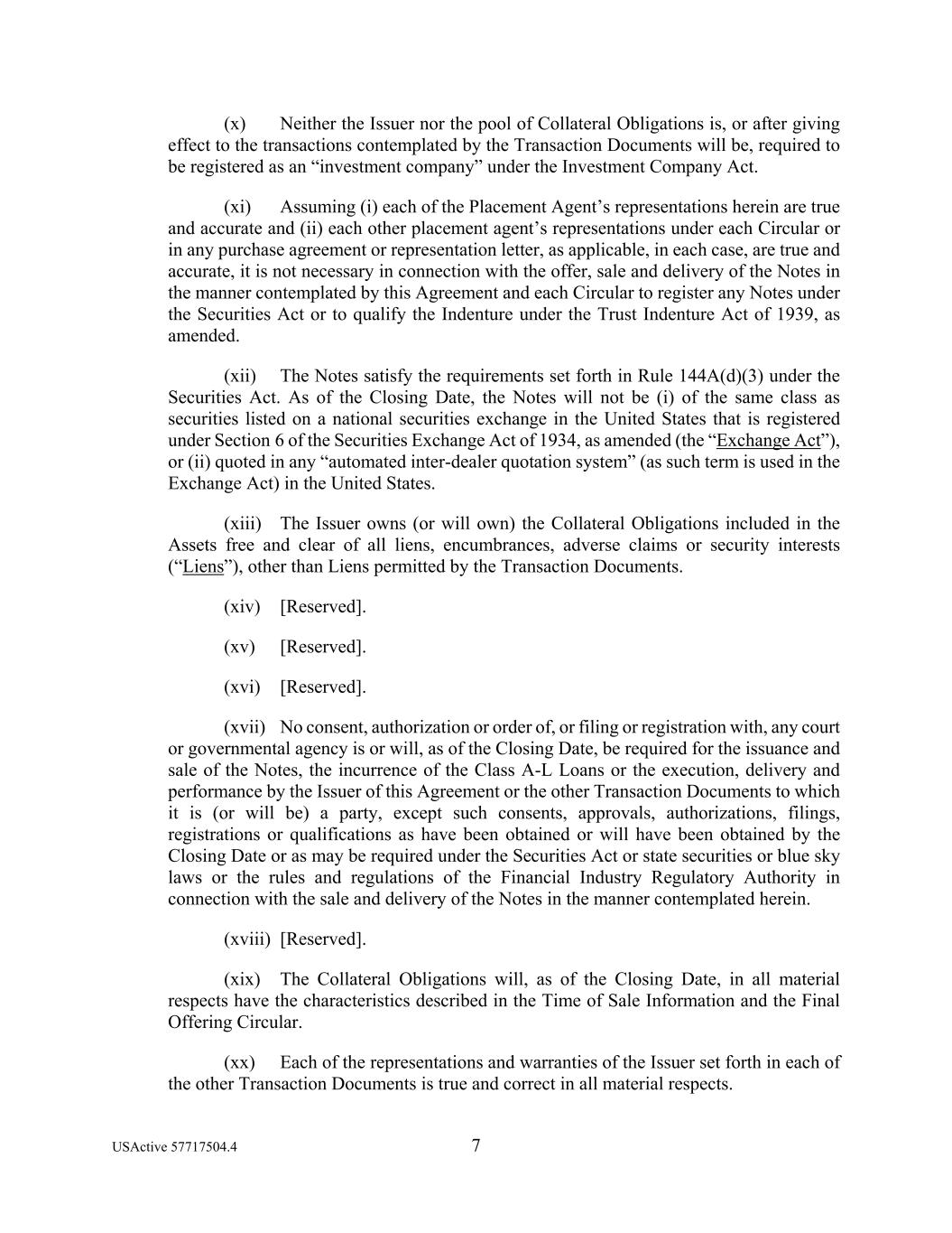 USActive 57717504.4 7 (x) Neither the Issuer nor the pool of Collateral Obligations is, or after giving effect to the transactions contemplated by the Transaction Documents will be, required to be registered as an “investment company” under the Investment Company Act. (xi) Assuming (i) each of the Placement Agent’s representations herein are true and accurate and (ii) each other placement agent’s representations under each Circular or in any purchase agreement or representation letter, as applicable, in each case, are true and accurate, it is not necessary in connection with the offer, sale and delivery of the Notes in the manner contemplated by this Agreement and each Circular to register any Notes under the Securities Act or to qualify the Indenture under the Trust Indenture Act of 1939, as amended. (xii) The Notes satisfy the requirements set forth in Rule 144A(d)(3) under the Securities Act. As of the Closing Date, the Notes will not be (i) of the same class as securities listed on a national securities exchange in the United States that is registered under Section 6 of the Securities Exchange Act of 1934, as amended (the “Exchange Act”), or (ii) quoted in any “automated inter-dealer quotation system” (as such term is used in the Exchange Act) in the United States. (xiii) The Issuer owns (or will own) the Collateral Obligations included in the Assets free and clear of all liens, encumbrances, adverse claims or security interests (“Liens”), other than Liens permitted by the Transaction Documents. (xiv) [Reserved]. (xv) [Reserved]. (xvi) [Reserved]. (xvii) No consent, authorization or order of, or filing or registration with, any court or governmental agency is or will, as of the Closing Date, be required for the issuance and sale of the Notes, the incurrence of the Class A-L Loans or the execution, delivery and performance by the Issuer of this Agreement or the other Transaction Documents to which it is (or will be) a party, except such consents, approvals, authorizations, filings, registrations or qualifications as have been obtained or will have been obtained by the Closing Date or as may be required under the Securities Act or state securities or blue sky laws or the rules and regulations of the Financial Industry Regulatory Authority in connection with the sale and delivery of the Notes in the manner contemplated herein. (xviii) [Reserved]. (xix) The Collateral Obligations will, as of the Closing Date, in all material respects have the characteristics described in the Time of Sale Information and the Final Offering Circular. (xx) Each of the representations and warranties of the Issuer set forth in each of the other Transaction Documents is true and correct in all material respects.