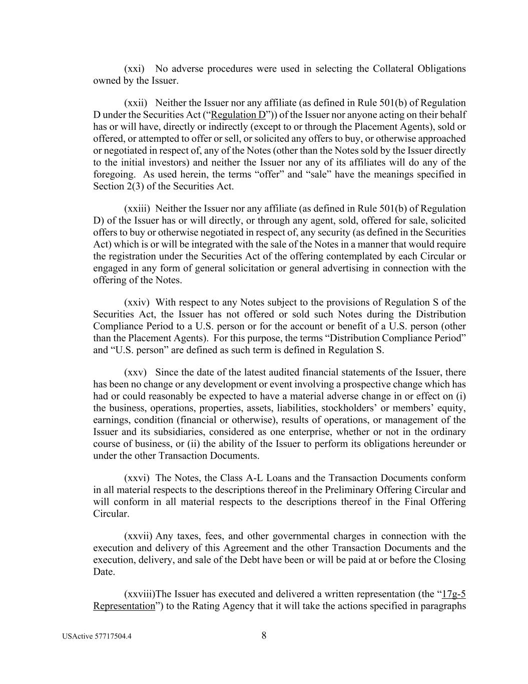 USActive 57717504.4 8 (xxi) No adverse procedures were used in selecting the Collateral Obligations owned by the Issuer. (xxii) Neither the Issuer nor any affiliate (as defined in Rule 501(b) of Regulation D under the Securities Act (“Regulation D”)) of the Issuer nor anyone acting on their behalf has or will have, directly or indirectly (except to or through the Placement Agents), sold or offered, or attempted to offer or sell, or solicited any offers to buy, or otherwise approached or negotiated in respect of, any of the Notes (other than the Notes sold by the Issuer directly to the initial investors) and neither the Issuer nor any of its affiliates will do any of the foregoing. As used herein, the terms “offer” and “sale” have the meanings specified in Section 2(3) of the Securities Act. (xxiii) Neither the Issuer nor any affiliate (as defined in Rule 501(b) of Regulation D) of the Issuer has or will directly, or through any agent, sold, offered for sale, solicited offers to buy or otherwise negotiated in respect of, any security (as defined in the Securities Act) which is or will be integrated with the sale of the Notes in a manner that would require the registration under the Securities Act of the offering contemplated by each Circular or engaged in any form of general solicitation or general advertising in connection with the offering of the Notes. (xxiv) With respect to any Notes subject to the provisions of Regulation S of the Securities Act, the Issuer has not offered or sold such Notes during the Distribution Compliance Period to a U.S. person or for the account or benefit of a U.S. person (other than the Placement Agents). For this purpose, the terms “Distribution Compliance Period” and “U.S. person” are defined as such term is defined in Regulation S. (xxv) Since the date of the latest audited financial statements of the Issuer, there has been no change or any development or event involving a prospective change which has had or could reasonably be expected to have a material adverse change in or effect on (i) the business, operations, properties, assets, liabilities, stockholders’ or members’ equity, earnings, condition (financial or otherwise), results of operations, or management of the Issuer and its subsidiaries, considered as one enterprise, whether or not in the ordinary course of business, or (ii) the ability of the Issuer to perform its obligations hereunder or under the other Transaction Documents. (xxvi) The Notes, the Class A-L Loans and the Transaction Documents conform in all material respects to the descriptions thereof in the Preliminary Offering Circular and will conform in all material respects to the descriptions thereof in the Final Offering Circular. (xxvii) Any taxes, fees, and other governmental charges in connection with the execution and delivery of this Agreement and the other Transaction Documents and the execution, delivery, and sale of the Debt have been or will be paid at or before the Closing Date. (xxviii)The Issuer has executed and delivered a written representation (the “17g-5 Representation”) to the Rating Agency that it will take the actions specified in paragraphs