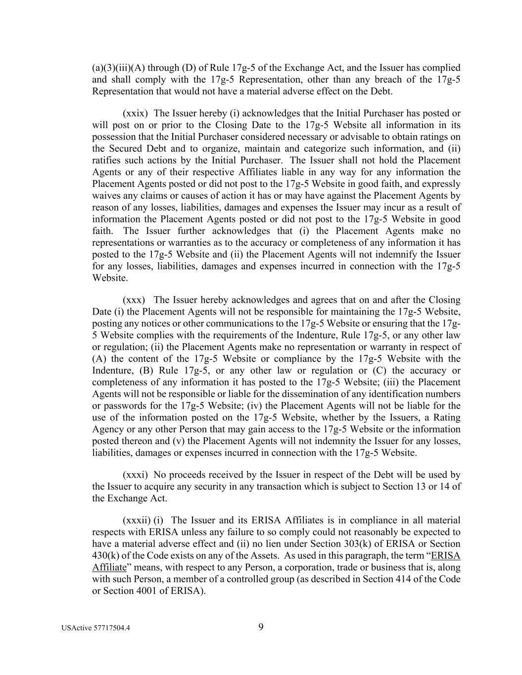 USActive 57717504.4 9 (a)(3)(iii)(A) through (D) of Rule 17g-5 of the Exchange Act, and the Issuer has complied and shall comply with the 17g-5 Representation, other than any breach of the 17g-5 Representation that would not have a material adverse effect on the Debt. (xxix) The Issuer hereby (i) acknowledges that the Initial Purchaser has posted or will post on or prior to the Closing Date to the 17g-5 Website all information in its possession that the Initial Purchaser considered necessary or advisable to obtain ratings on the Secured Debt and to organize, maintain and categorize such information, and (ii) ratifies such actions by the Initial Purchaser. The Issuer shall not hold the Placement Agents or any of their respective Affiliates liable in any way for any information the Placement Agents posted or did not post to the 17g-5 Website in good faith, and expressly waives any claims or causes of action it has or may have against the Placement Agents by reason of any losses, liabilities, damages and expenses the Issuer may incur as a result of information the Placement Agents posted or did not post to the 17g-5 Website in good faith. The Issuer further acknowledges that (i) the Placement Agents make no representations or warranties as to the accuracy or completeness of any information it has posted to the 17g-5 Website and (ii) the Placement Agents will not indemnify the Issuer for any losses, liabilities, damages and expenses incurred in connection with the 17g-5 Website. (xxx) The Issuer hereby acknowledges and agrees that on and after the Closing Date (i) the Placement Agents will not be responsible for maintaining the 17g-5 Website, posting any notices or other communications to the 17g-5 Website or ensuring that the 17g- 5 Website complies with the requirements of the Indenture, Rule 17g-5, or any other law or regulation; (ii) the Placement Agents make no representation or warranty in respect of (A) the content of the 17g-5 Website or compliance by the 17g-5 Website with the Indenture, (B) Rule 17g-5, or any other law or regulation or (C) the accuracy or completeness of any information it has posted to the 17g-5 Website; (iii) the Placement Agents will not be responsible or liable for the dissemination of any identification numbers or passwords for the 17g-5 Website; (iv) the Placement Agents will not be liable for the use of the information posted on the 17g-5 Website, whether by the Issuers, a Rating Agency or any other Person that may gain access to the 17g-5 Website or the information posted thereon and (v) the Placement Agents will not indemnity the Issuer for any losses, liabilities, damages or expenses incurred in connection with the 17g-5 Website. (xxxi) No proceeds received by the Issuer in respect of the Debt will be used by the Issuer to acquire any security in any transaction which is subject to Section 13 or 14 of the Exchange Act. (xxxii) (i) The Issuer and its ERISA Affiliates is in compliance in all material respects with ERISA unless any failure to so comply could not reasonably be expected to have a material adverse effect and (ii) no lien under Section 303(k) of ERISA or Section 430(k) of the Code exists on any of the Assets. As used in this paragraph, the term “ERISA Affiliate” means, with respect to any Person, a corporation, trade or business that is, along with such Person, a member of a controlled group (as described in Section 414 of the Code or Section 4001 of ERISA).