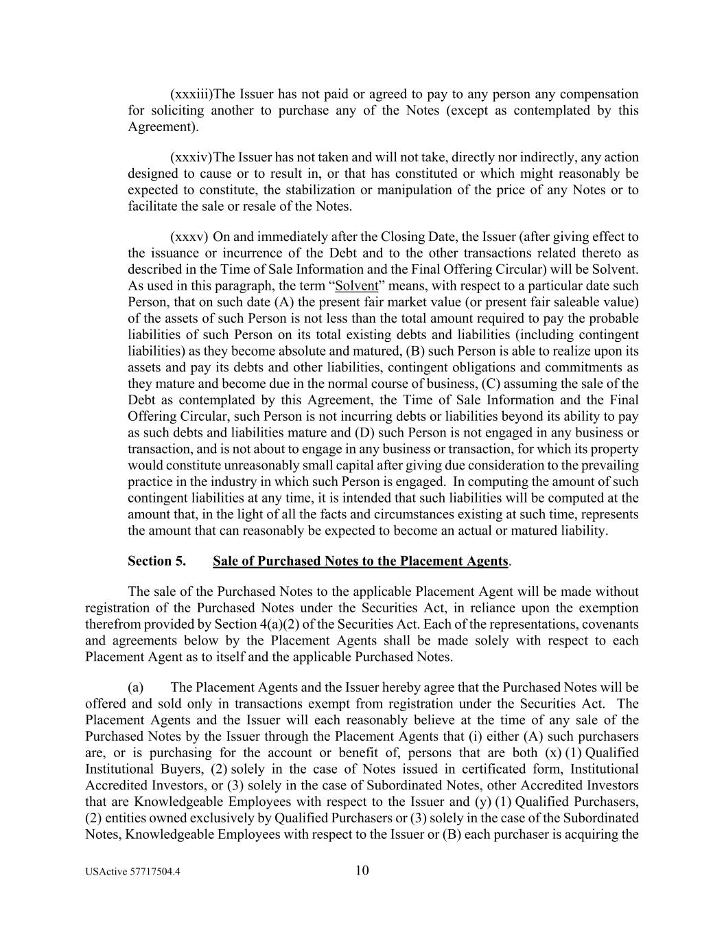USActive 57717504.4 10 (xxxiii)The Issuer has not paid or agreed to pay to any person any compensation for soliciting another to purchase any of the Notes (except as contemplated by this Agreement). (xxxiv) The Issuer has not taken and will not take, directly nor indirectly, any action designed to cause or to result in, or that has constituted or which might reasonably be expected to constitute, the stabilization or manipulation of the price of any Notes or to facilitate the sale or resale of the Notes. (xxxv) On and immediately after the Closing Date, the Issuer (after giving effect to the issuance or incurrence of the Debt and to the other transactions related thereto as described in the Time of Sale Information and the Final Offering Circular) will be Solvent. As used in this paragraph, the term “Solvent” means, with respect to a particular date such Person, that on such date (A) the present fair market value (or present fair saleable value) of the assets of such Person is not less than the total amount required to pay the probable liabilities of such Person on its total existing debts and liabilities (including contingent liabilities) as they become absolute and matured, (B) such Person is able to realize upon its assets and pay its debts and other liabilities, contingent obligations and commitments as they mature and become due in the normal course of business, (C) assuming the sale of the Debt as contemplated by this Agreement, the Time of Sale Information and the Final Offering Circular, such Person is not incurring debts or liabilities beyond its ability to pay as such debts and liabilities mature and (D) such Person is not engaged in any business or transaction, and is not about to engage in any business or transaction, for which its property would constitute unreasonably small capital after giving due consideration to the prevailing practice in the industry in which such Person is engaged. In computing the amount of such contingent liabilities at any time, it is intended that such liabilities will be computed at the amount that, in the light of all the facts and circumstances existing at such time, represents the amount that can reasonably be expected to become an actual or matured liability. Section 5. Sale of Purchased Notes to the Placement Agents. The sale of the Purchased Notes to the applicable Placement Agent will be made without registration of the Purchased Notes under the Securities Act, in reliance upon the exemption therefrom provided by Section 4(a)(2) of the Securities Act. Each of the representations, covenants and agreements below by the Placement Agents shall be made solely with respect to each Placement Agent as to itself and the applicable Purchased Notes. (a) The Placement Agents and the Issuer hereby agree that the Purchased Notes will be offered and sold only in transactions exempt from registration under the Securities Act. The Placement Agents and the Issuer will each reasonably believe at the time of any sale of the Purchased Notes by the Issuer through the Placement Agents that (i) either (A) such purchasers are, or is purchasing for the account or benefit of, persons that are both (x) (1) Qualified Institutional Buyers, (2) solely in the case of Notes issued in certificated form, Institutional Accredited Investors, or (3) solely in the case of Subordinated Notes, other Accredited Investors that are Knowledgeable Employees with respect to the Issuer and (y) (1) Qualified Purchasers, (2) entities owned exclusively by Qualified Purchasers or (3) solely in the case of the Subordinated Notes, Knowledgeable Employees with respect to the Issuer or (B) each purchaser is acquiring the