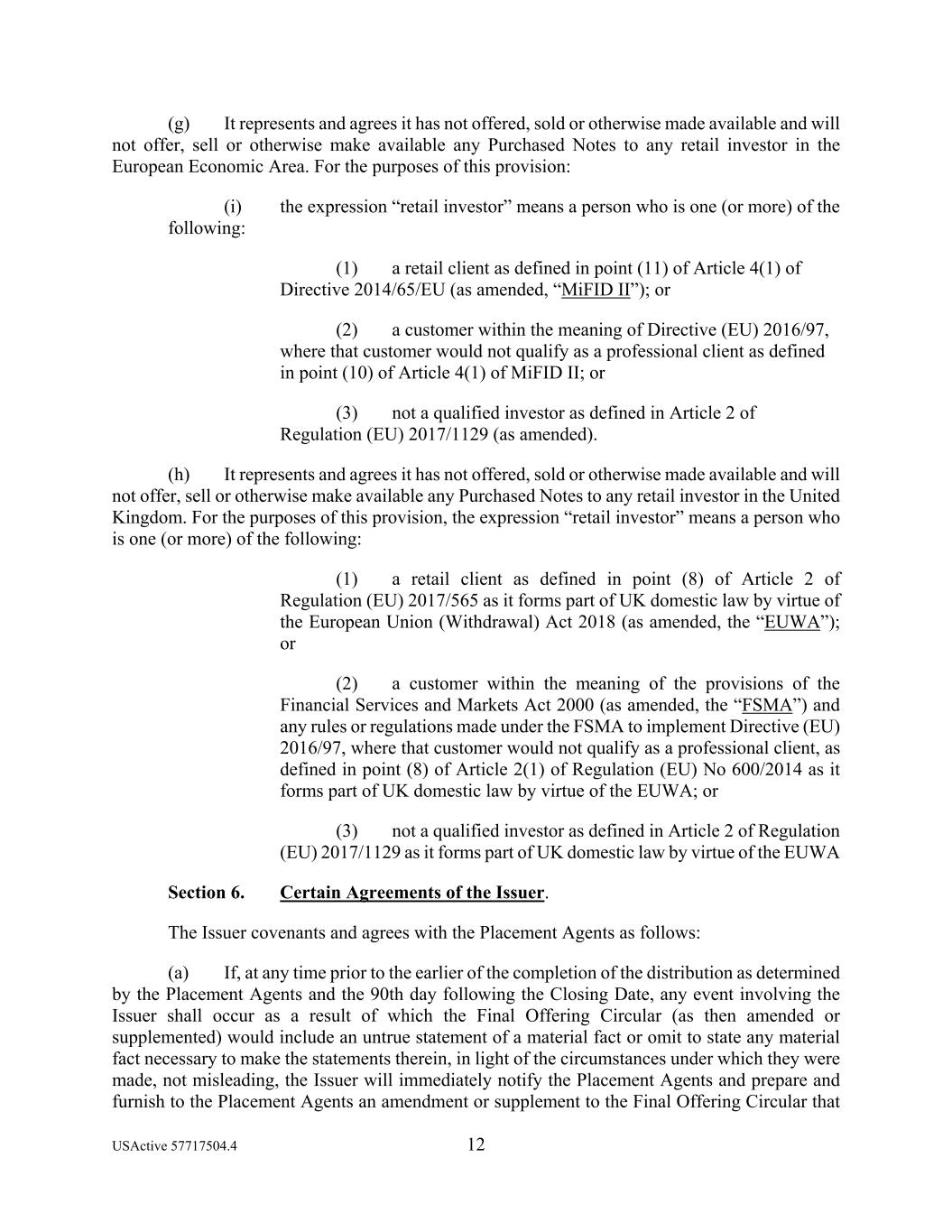 USActive 57717504.4 12 (g) It represents and agrees it has not offered, sold or otherwise made available and will not offer, sell or otherwise make available any Purchased Notes to any retail investor in the European Economic Area. For the purposes of this provision: (i) the expression “retail investor” means a person who is one (or more) of the following: (1) a retail client as defined in point (11) of Article 4(1) of Directive 2014/65/EU (as amended, “MiFID II”); or (2) a customer within the meaning of Directive (EU) 2016/97, where that customer would not qualify as a professional client as defined in point (10) of Article 4(1) of MiFID II; or (3) not a qualified investor as defined in Article 2 of Regulation (EU) 2017/1129 (as amended). (h) It represents and agrees it has not offered, sold or otherwise made available and will not offer, sell or otherwise make available any Purchased Notes to any retail investor in the United Kingdom. For the purposes of this provision, the expression “retail investor” means a person who is one (or more) of the following: (1) a retail client as defined in point (8) of Article 2 of Regulation (EU) 2017/565 as it forms part of UK domestic law by virtue of the European Union (Withdrawal) Act 2018 (as amended, the “EUWA”); or (2) a customer within the meaning of the provisions of the Financial Services and Markets Act 2000 (as amended, the “FSMA”) and any rules or regulations made under the FSMA to implement Directive (EU) 2016/97, where that customer would not qualify as a professional client, as defined in point (8) of Article 2(1) of Regulation (EU) No 600/2014 as it forms part of UK domestic law by virtue of the EUWA; or (3) not a qualified investor as defined in Article 2 of Regulation (EU) 2017/1129 as it forms part of UK domestic law by virtue of the EUWA Section 6. Certain Agreements of the Issuer. The Issuer covenants and agrees with the Placement Agents as follows: (a) If, at any time prior to the earlier of the completion of the distribution as determined by the Placement Agents and the 90th day following the Closing Date, any event involving the Issuer shall occur as a result of which the Final Offering Circular (as then amended or supplemented) would include an untrue statement of a material fact or omit to state any material fact necessary to make the statements therein, in light of the circumstances under which they were made, not misleading, the Issuer will immediately notify the Placement Agents and prepare and furnish to the Placement Agents an amendment or supplement to the Final Offering Circular that