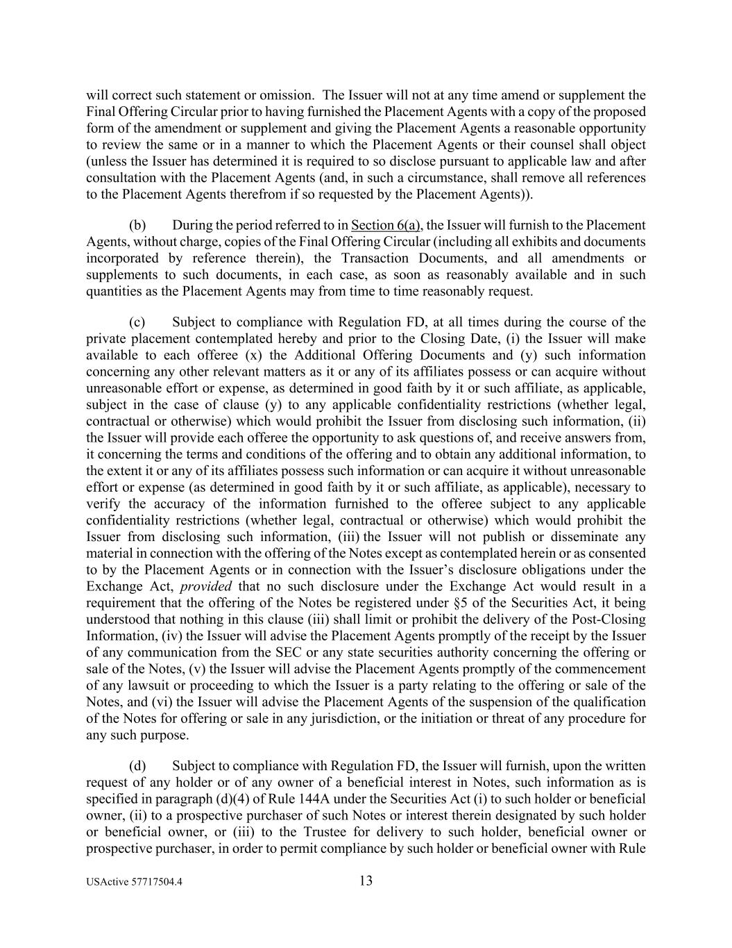 USActive 57717504.4 13 will correct such statement or omission. The Issuer will not at any time amend or supplement the Final Offering Circular prior to having furnished the Placement Agents with a copy of the proposed form of the amendment or supplement and giving the Placement Agents a reasonable opportunity to review the same or in a manner to which the Placement Agents or their counsel shall object (unless the Issuer has determined it is required to so disclose pursuant to applicable law and after consultation with the Placement Agents (and, in such a circumstance, shall remove all references to the Placement Agents therefrom if so requested by the Placement Agents)). (b) During the period referred to in Section 6(a), the Issuer will furnish to the Placement Agents, without charge, copies of the Final Offering Circular (including all exhibits and documents incorporated by reference therein), the Transaction Documents, and all amendments or supplements to such documents, in each case, as soon as reasonably available and in such quantities as the Placement Agents may from time to time reasonably request. (c) Subject to compliance with Regulation FD, at all times during the course of the private placement contemplated hereby and prior to the Closing Date, (i) the Issuer will make available to each offeree (x) the Additional Offering Documents and (y) such information concerning any other relevant matters as it or any of its affiliates possess or can acquire without unreasonable effort or expense, as determined in good faith by it or such affiliate, as applicable, subject in the case of clause (y) to any applicable confidentiality restrictions (whether legal, contractual or otherwise) which would prohibit the Issuer from disclosing such information, (ii) the Issuer will provide each offeree the opportunity to ask questions of, and receive answers from, it concerning the terms and conditions of the offering and to obtain any additional information, to the extent it or any of its affiliates possess such information or can acquire it without unreasonable effort or expense (as determined in good faith by it or such affiliate, as applicable), necessary to verify the accuracy of the information furnished to the offeree subject to any applicable confidentiality restrictions (whether legal, contractual or otherwise) which would prohibit the Issuer from disclosing such information, (iii) the Issuer will not publish or disseminate any material in connection with the offering of the Notes except as contemplated herein or as consented to by the Placement Agents or in connection with the Issuer’s disclosure obligations under the Exchange Act, provided that no such disclosure under the Exchange Act would result in a requirement that the offering of the Notes be registered under §5 of the Securities Act, it being understood that nothing in this clause (iii) shall limit or prohibit the delivery of the Post-Closing Information, (iv) the Issuer will advise the Placement Agents promptly of the receipt by the Issuer of any communication from the SEC or any state securities authority concerning the offering or sale of the Notes, (v) the Issuer will advise the Placement Agents promptly of the commencement of any lawsuit or proceeding to which the Issuer is a party relating to the offering or sale of the Notes, and (vi) the Issuer will advise the Placement Agents of the suspension of the qualification of the Notes for offering or sale in any jurisdiction, or the initiation or threat of any procedure for any such purpose. (d) Subject to compliance with Regulation FD, the Issuer will furnish, upon the written request of any holder or of any owner of a beneficial interest in Notes, such information as is specified in paragraph (d)(4) of Rule 144A under the Securities Act (i) to such holder or beneficial owner, (ii) to a prospective purchaser of such Notes or interest therein designated by such holder or beneficial owner, or (iii) to the Trustee for delivery to such holder, beneficial owner or prospective purchaser, in order to permit compliance by such holder or beneficial owner with Rule