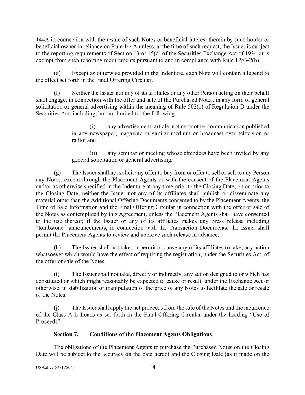USActive 57717504.4 14 144A in connection with the resale of such Notes or beneficial interest therein by such holder or beneficial owner in reliance on Rule 144A unless, at the time of such request, the Issuer is subject to the reporting requirements of Section 13 or 15(d) of the Securities Exchange Act of 1934 or is exempt from such reporting requirements pursuant to and in compliance with Rule 12g3-2(b). (e) Except as otherwise provided in the Indenture, each Note will contain a legend to the effect set forth in the Final Offering Circular. (f) Neither the Issuer nor any of its affiliates or any other Person acting on their behalf shall engage, in connection with the offer and sale of the Purchased Notes, in any form of general solicitation or general advertising within the meaning of Rule 502(c) of Regulation D under the Securities Act, including, but not limited to, the following: (i) any advertisement, article, notice or other communication published in any newspaper, magazine or similar medium or broadcast over television or radio; and (ii) any seminar or meeting whose attendees have been invited by any general solicitation or general advertising. (g) The Issuer shall not solicit any offer to buy from or offer to sell or sell to any Person any Notes, except through the Placement Agents or with the consent of the Placement Agents and/or as otherwise specified in the Indenture at any time prior to the Closing Date; on or prior to the Closing Date, neither the Issuer nor any of its affiliates shall publish or disseminate any material other than the Additional Offering Documents consented to by the Placement Agents, the Time of Sale Information and the Final Offering Circular in connection with the offer or sale of the Notes as contemplated by this Agreement, unless the Placement Agents shall have consented to the use thereof; if the Issuer or any of its affiliates makes any press release including “tombstone” announcements, in connection with the Transaction Documents, the Issuer shall permit the Placement Agents to review and approve such release in advance. (h) The Issuer shall not take, or permit or cause any of its affiliates to take, any action whatsoever which would have the effect of requiring the registration, under the Securities Act, of the offer or sale of the Notes. (i) The Issuer shall not take, directly or indirectly, any action designed to or which has constituted or which might reasonably be expected to cause or result, under the Exchange Act or otherwise, in stabilization or manipulation of the price of any Notes to facilitate the sale or resale of the Notes. (j) The Issuer shall apply the net proceeds from the sale of the Notes and the incurrence of the Class A-L Loans as set forth in the Final Offering Circular under the heading “Use of Proceeds”. Section 7. Conditions of the Placement Agents Obligations. The obligations of the Placement Agents to purchase the Purchased Notes on the Closing Date will be subject to the accuracy on the date hereof and the Closing Date (as if made on the