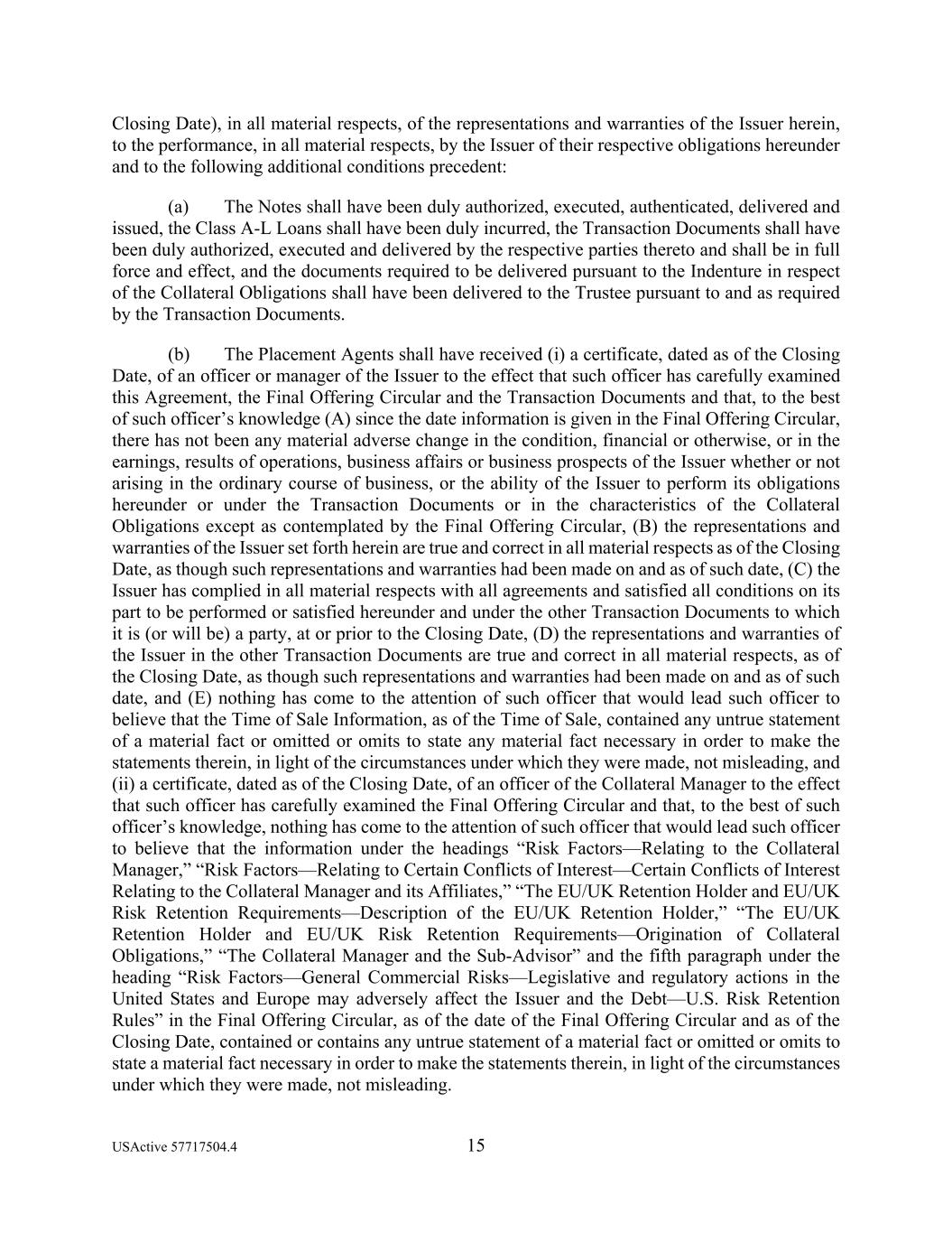 USActive 57717504.4 15 Closing Date), in all material respects, of the representations and warranties of the Issuer herein, to the performance, in all material respects, by the Issuer of their respective obligations hereunder and to the following additional conditions precedent: (a) The Notes shall have been duly authorized, executed, authenticated, delivered and issued, the Class A-L Loans shall have been duly incurred, the Transaction Documents shall have been duly authorized, executed and delivered by the respective parties thereto and shall be in full force and effect, and the documents required to be delivered pursuant to the Indenture in respect of the Collateral Obligations shall have been delivered to the Trustee pursuant to and as required by the Transaction Documents. (b) The Placement Agents shall have received (i) a certificate, dated as of the Closing Date, of an officer or manager of the Issuer to the effect that such officer has carefully examined this Agreement, the Final Offering Circular and the Transaction Documents and that, to the best of such officer’s knowledge (A) since the date information is given in the Final Offering Circular, there has not been any material adverse change in the condition, financial or otherwise, or in the earnings, results of operations, business affairs or business prospects of the Issuer whether or not arising in the ordinary course of business, or the ability of the Issuer to perform its obligations hereunder or under the Transaction Documents or in the characteristics of the Collateral Obligations except as contemplated by the Final Offering Circular, (B) the representations and warranties of the Issuer set forth herein are true and correct in all material respects as of the Closing Date, as though such representations and warranties had been made on and as of such date, (C) the Issuer has complied in all material respects with all agreements and satisfied all conditions on its part to be performed or satisfied hereunder and under the other Transaction Documents to which it is (or will be) a party, at or prior to the Closing Date, (D) the representations and warranties of the Issuer in the other Transaction Documents are true and correct in all material respects, as of the Closing Date, as though such representations and warranties had been made on and as of such date, and (E) nothing has come to the attention of such officer that would lead such officer to believe that the Time of Sale Information, as of the Time of Sale, contained any untrue statement of a material fact or omitted or omits to state any material fact necessary in order to make the statements therein, in light of the circumstances under which they were made, not misleading, and (ii) a certificate, dated as of the Closing Date, of an officer of the Collateral Manager to the effect that such officer has carefully examined the Final Offering Circular and that, to the best of such officer’s knowledge, nothing has come to the attention of such officer that would lead such officer to believe that the information under the headings “Risk Factors—Relating to the Collateral Manager,” “Risk Factors—Relating to Certain Conflicts of Interest—Certain Conflicts of Interest Relating to the Collateral Manager and its Affiliates,” “The EU/UK Retention Holder and EU/UK Risk Retention Requirements—Description of the EU/UK Retention Holder,” “The EU/UK Retention Holder and EU/UK Risk Retention Requirements—Origination of Collateral Obligations,” “The Collateral Manager and the Sub-Advisor” and the fifth paragraph under the heading “Risk Factors—General Commercial Risks—Legislative and regulatory actions in the United States and Europe may adversely affect the Issuer and the Debt—U.S. Risk Retention Rules” in the Final Offering Circular, as of the date of the Final Offering Circular and as of the Closing Date, contained or contains any untrue statement of a material fact or omitted or omits to state a material fact necessary in order to make the statements therein, in light of the circumstances under which they were made, not misleading.