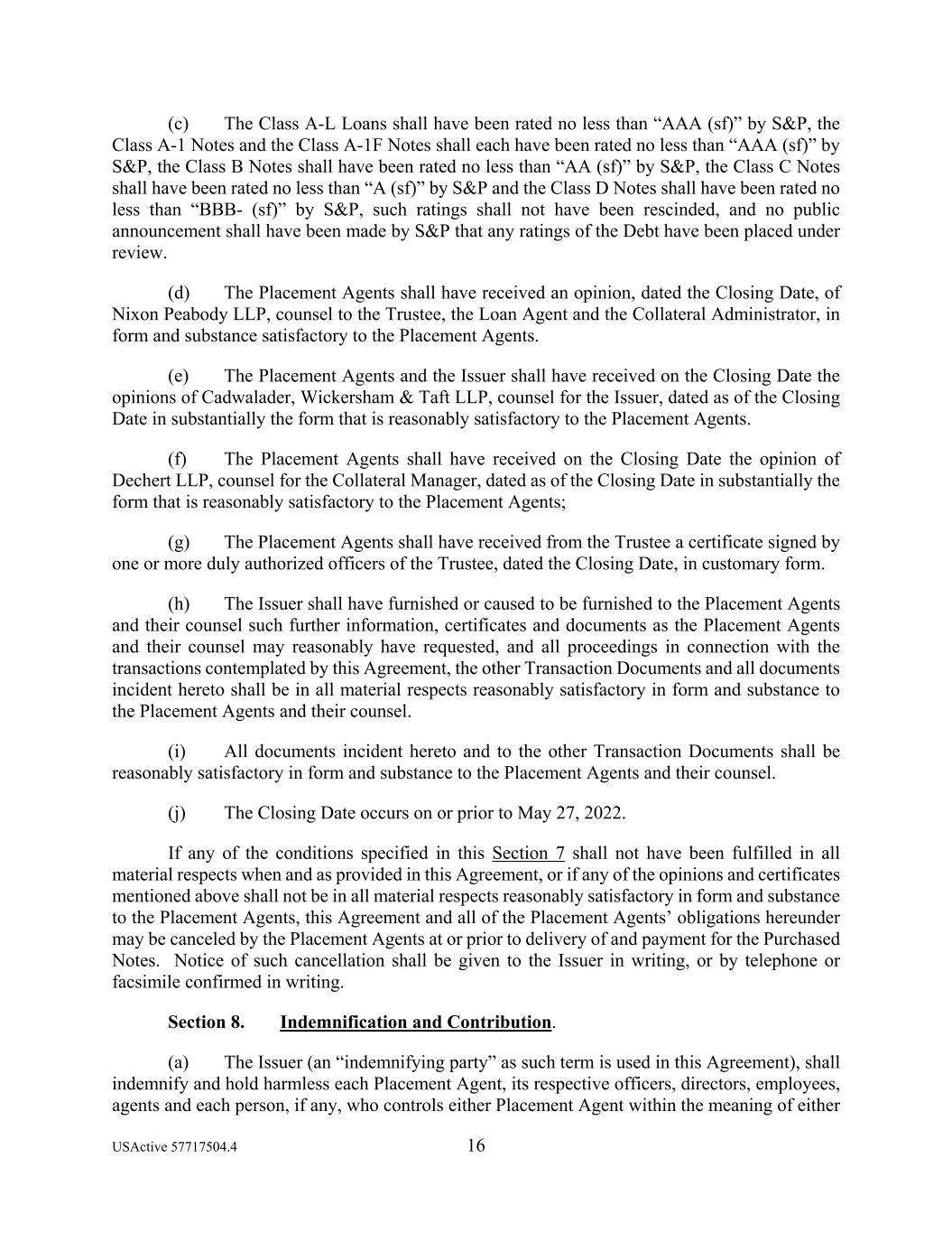 USActive 57717504.4 16 (c) The Class A-L Loans shall have been rated no less than “AAA (sf)” by S&P, the Class A-1 Notes and the Class A-1F Notes shall each have been rated no less than “AAA (sf)” by S&P, the Class B Notes shall have been rated no less than “AA (sf)” by S&P, the Class C Notes shall have been rated no less than “A (sf)” by S&P and the Class D Notes shall have been rated no less than “BBB- (sf)” by S&P, such ratings shall not have been rescinded, and no public announcement shall have been made by S&P that any ratings of the Debt have been placed under review. (d) The Placement Agents shall have received an opinion, dated the Closing Date, of Nixon Peabody LLP, counsel to the Trustee, the Loan Agent and the Collateral Administrator, in form and substance satisfactory to the Placement Agents. (e) The Placement Agents and the Issuer shall have received on the Closing Date the opinions of Cadwalader, Wickersham & Taft LLP, counsel for the Issuer, dated as of the Closing Date in substantially the form that is reasonably satisfactory to the Placement Agents. (f) The Placement Agents shall have received on the Closing Date the opinion of Dechert LLP, counsel for the Collateral Manager, dated as of the Closing Date in substantially the form that is reasonably satisfactory to the Placement Agents; (g) The Placement Agents shall have received from the Trustee a certificate signed by one or more duly authorized officers of the Trustee, dated the Closing Date, in customary form. (h) The Issuer shall have furnished or caused to be furnished to the Placement Agents and their counsel such further information, certificates and documents as the Placement Agents and their counsel may reasonably have requested, and all proceedings in connection with the transactions contemplated by this Agreement, the other Transaction Documents and all documents incident hereto shall be in all material respects reasonably satisfactory in form and substance to the Placement Agents and their counsel. (i) All documents incident hereto and to the other Transaction Documents shall be reasonably satisfactory in form and substance to the Placement Agents and their counsel. (j) The Closing Date occurs on or prior to May 27, 2022. If any of the conditions specified in this Section 7 shall not have been fulfilled in all material respects when and as provided in this Agreement, or if any of the opinions and certificates mentioned above shall not be in all material respects reasonably satisfactory in form and substance to the Placement Agents, this Agreement and all of the Placement Agents’ obligations hereunder may be canceled by the Placement Agents at or prior to delivery of and payment for the Purchased Notes. Notice of such cancellation shall be given to the Issuer in writing, or by telephone or facsimile confirmed in writing. Section 8. Indemnification and Contribution. (a) The Issuer (an “indemnifying party” as such term is used in this Agreement), shall indemnify and hold harmless each Placement Agent, its respective officers, directors, employees, agents and each person, if any, who controls either Placement Agent within the meaning of either