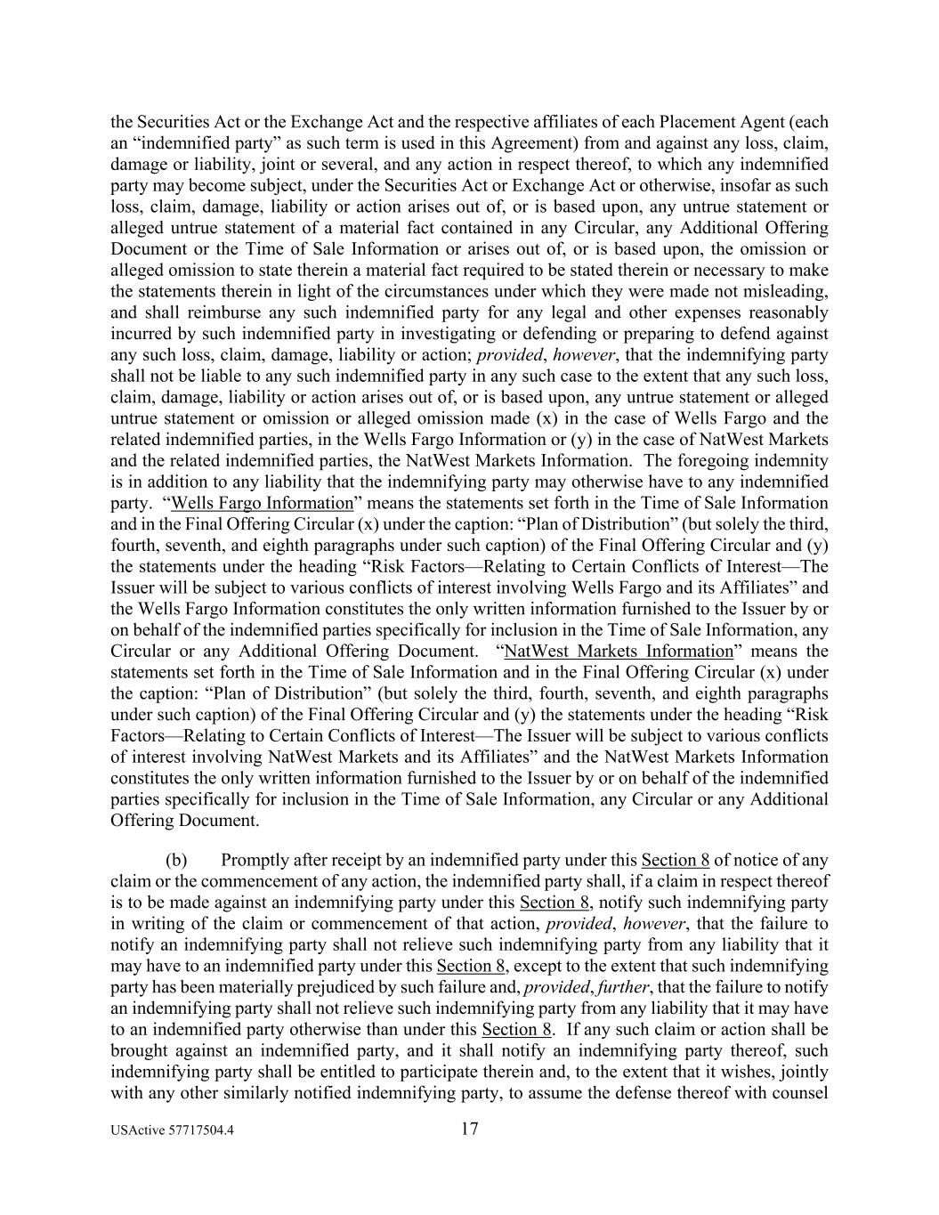 USActive 57717504.4 17 the Securities Act or the Exchange Act and the respective affiliates of each Placement Agent (each an “indemnified party” as such term is used in this Agreement) from and against any loss, claim, damage or liability, joint or several, and any action in respect thereof, to which any indemnified party may become subject, under the Securities Act or Exchange Act or otherwise, insofar as such loss, claim, damage, liability or action arises out of, or is based upon, any untrue statement or alleged untrue statement of a material fact contained in any Circular, any Additional Offering Document or the Time of Sale Information or arises out of, or is based upon, the omission or alleged omission to state therein a material fact required to be stated therein or necessary to make the statements therein in light of the circumstances under which they were made not misleading, and shall reimburse any such indemnified party for any legal and other expenses reasonably incurred by such indemnified party in investigating or defending or preparing to defend against any such loss, claim, damage, liability or action; provided, however, that the indemnifying party shall not be liable to any such indemnified party in any such case to the extent that any such loss, claim, damage, liability or action arises out of, or is based upon, any untrue statement or alleged untrue statement or omission or alleged omission made (x) in the case of Wells Fargo and the related indemnified parties, in the Wells Fargo Information or (y) in the case of NatWest Markets and the related indemnified parties, the NatWest Markets Information. The foregoing indemnity is in addition to any liability that the indemnifying party may otherwise have to any indemnified party. “Wells Fargo Information” means the statements set forth in the Time of Sale Information and in the Final Offering Circular (x) under the caption: “Plan of Distribution” (but solely the third, fourth, seventh, and eighth paragraphs under such caption) of the Final Offering Circular and (y) the statements under the heading “Risk Factors—Relating to Certain Conflicts of Interest—The Issuer will be subject to various conflicts of interest involving Wells Fargo and its Affiliates” and the Wells Fargo Information constitutes the only written information furnished to the Issuer by or on behalf of the indemnified parties specifically for inclusion in the Time of Sale Information, any Circular or any Additional Offering Document. “NatWest Markets Information” means the statements set forth in the Time of Sale Information and in the Final Offering Circular (x) under the caption: “Plan of Distribution” (but solely the third, fourth, seventh, and eighth paragraphs under such caption) of the Final Offering Circular and (y) the statements under the heading “Risk Factors—Relating to Certain Conflicts of Interest—The Issuer will be subject to various conflicts of interest involving NatWest Markets and its Affiliates” and the NatWest Markets Information constitutes the only written information furnished to the Issuer by or on behalf of the indemnified parties specifically for inclusion in the Time of Sale Information, any Circular or any Additional Offering Document. (b) Promptly after receipt by an indemnified party under this Section 8 of notice of any claim or the commencement of any action, the indemnified party shall, if a claim in respect thereof is to be made against an indemnifying party under this Section 8, notify such indemnifying party in writing of the claim or commencement of that action, provided, however, that the failure to notify an indemnifying party shall not relieve such indemnifying party from any liability that it may have to an indemnified party under this Section 8, except to the extent that such indemnifying party has been materially prejudiced by such failure and, provided, further, that the failure to notify an indemnifying party shall not relieve such indemnifying party from any liability that it may have to an indemnified party otherwise than under this Section 8. If any such claim or action shall be brought against an indemnified party, and it shall notify an indemnifying party thereof, such indemnifying party shall be entitled to participate therein and, to the extent that it wishes, jointly with any other similarly notified indemnifying party, to assume the defense thereof with counsel