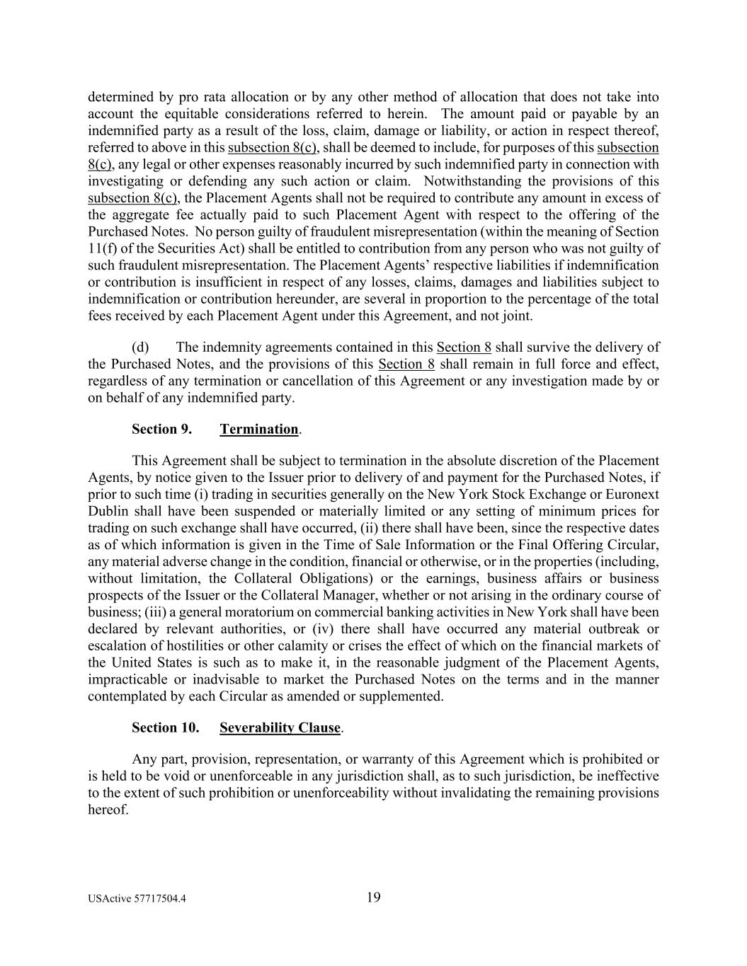USActive 57717504.4 19 determined by pro rata allocation or by any other method of allocation that does not take into account the equitable considerations referred to herein. The amount paid or payable by an indemnified party as a result of the loss, claim, damage or liability, or action in respect thereof, referred to above in this subsection 8(c), shall be deemed to include, for purposes of this subsection 8(c), any legal or other expenses reasonably incurred by such indemnified party in connection with investigating or defending any such action or claim. Notwithstanding the provisions of this subsection 8(c), the Placement Agents shall not be required to contribute any amount in excess of the aggregate fee actually paid to such Placement Agent with respect to the offering of the Purchased Notes. No person guilty of fraudulent misrepresentation (within the meaning of Section 11(f) of the Securities Act) shall be entitled to contribution from any person who was not guilty of such fraudulent misrepresentation. The Placement Agents’ respective liabilities if indemnification or contribution is insufficient in respect of any losses, claims, damages and liabilities subject to indemnification or contribution hereunder, are several in proportion to the percentage of the total fees received by each Placement Agent under this Agreement, and not joint. (d) The indemnity agreements contained in this Section 8 shall survive the delivery of the Purchased Notes, and the provisions of this Section 8 shall remain in full force and effect, regardless of any termination or cancellation of this Agreement or any investigation made by or on behalf of any indemnified party. Section 9. Termination. This Agreement shall be subject to termination in the absolute discretion of the Placement Agents, by notice given to the Issuer prior to delivery of and payment for the Purchased Notes, if prior to such time (i) trading in securities generally on the New York Stock Exchange or Euronext Dublin shall have been suspended or materially limited or any setting of minimum prices for trading on such exchange shall have occurred, (ii) there shall have been, since the respective dates as of which information is given in the Time of Sale Information or the Final Offering Circular, any material adverse change in the condition, financial or otherwise, or in the properties (including, without limitation, the Collateral Obligations) or the earnings, business affairs or business prospects of the Issuer or the Collateral Manager, whether or not arising in the ordinary course of business; (iii) a general moratorium on commercial banking activities in New York shall have been declared by relevant authorities, or (iv) there shall have occurred any material outbreak or escalation of hostilities or other calamity or crises the effect of which on the financial markets of the United States is such as to make it, in the reasonable judgment of the Placement Agents, impracticable or inadvisable to market the Purchased Notes on the terms and in the manner contemplated by each Circular as amended or supplemented. Section 10. Severability Clause. Any part, provision, representation, or warranty of this Agreement which is prohibited or is held to be void or unenforceable in any jurisdiction shall, as to such jurisdiction, be ineffective to the extent of such prohibition or unenforceability without invalidating the remaining provisions hereof.