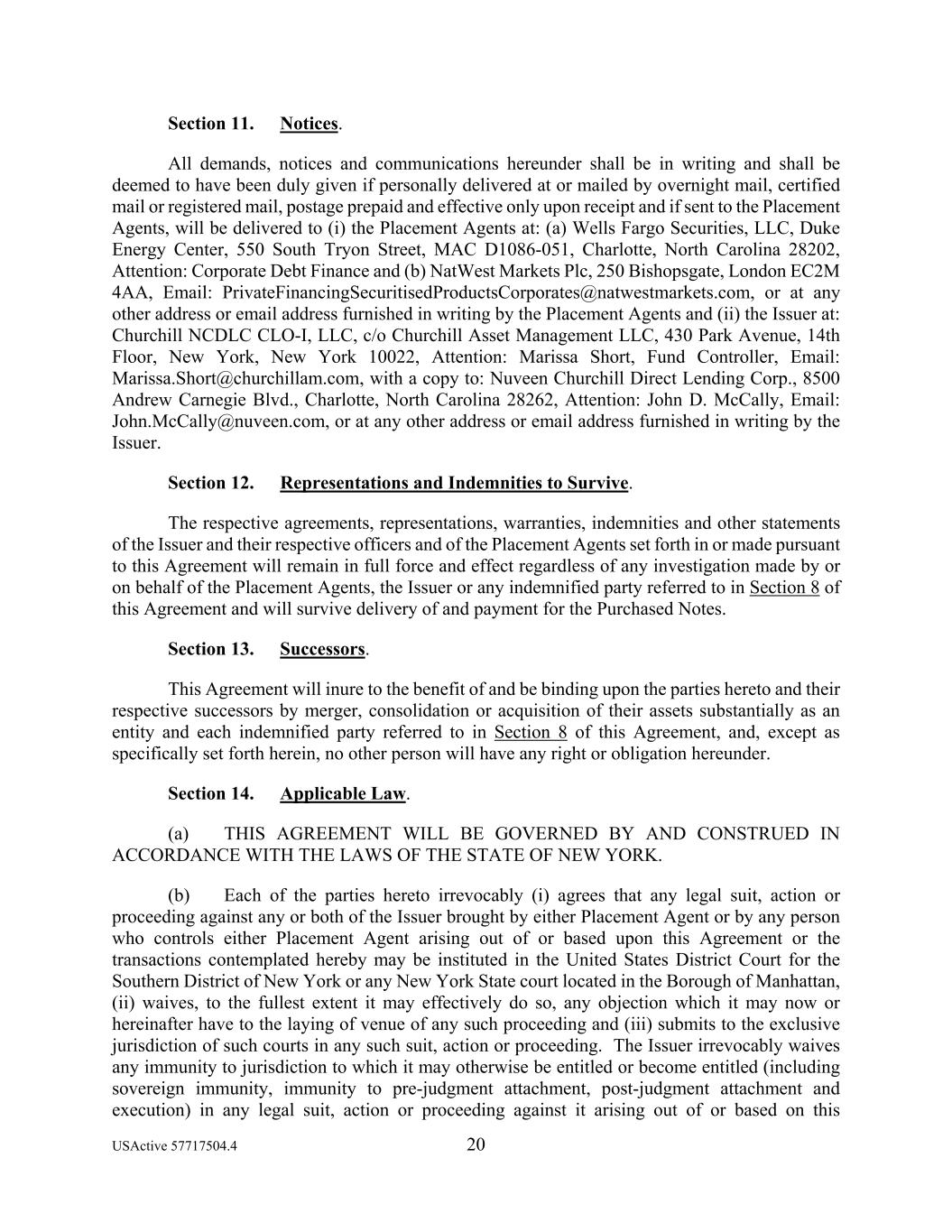 USActive 57717504.4 20 Section 11. Notices. All demands, notices and communications hereunder shall be in writing and shall be deemed to have been duly given if personally delivered at or mailed by overnight mail, certified mail or registered mail, postage prepaid and effective only upon receipt and if sent to the Placement Agents, will be delivered to (i) the Placement Agents at: (a) Wells Fargo Securities, LLC, Duke Energy Center, 550 South Tryon Street, MAC D1086-051, Charlotte, North Carolina 28202, Attention: Corporate Debt Finance and (b) NatWest Markets Plc, 250 Bishopsgate, London EC2M 4AA, Email: PrivateFinancingSecuritisedProductsCorporates@natwestmarkets.com, or at any other address or email address furnished in writing by the Placement Agents and (ii) the Issuer at: Churchill NCDLC CLO-I, LLC, c/o Churchill Asset Management LLC, 430 Park Avenue, 14th Floor, New York, New York 10022, Attention: Marissa Short, Fund Controller, Email: Marissa.Short@churchillam.com, with a copy to: Nuveen Churchill Direct Lending Corp., 8500 Andrew Carnegie Blvd., Charlotte, North Carolina 28262, Attention: John D. McCally, Email: John.McCally@nuveen.com, or at any other address or email address furnished in writing by the Issuer. Section 12. Representations and Indemnities to Survive. The respective agreements, representations, warranties, indemnities and other statements of the Issuer and their respective officers and of the Placement Agents set forth in or made pursuant to this Agreement will remain in full force and effect regardless of any investigation made by or on behalf of the Placement Agents, the Issuer or any indemnified party referred to in Section 8 of this Agreement and will survive delivery of and payment for the Purchased Notes. Section 13. Successors. This Agreement will inure to the benefit of and be binding upon the parties hereto and their respective successors by merger, consolidation or acquisition of their assets substantially as an entity and each indemnified party referred to in Section 8 of this Agreement, and, except as specifically set forth herein, no other person will have any right or obligation hereunder. Section 14. Applicable Law. (a) THIS AGREEMENT WILL BE GOVERNED BY AND CONSTRUED IN ACCORDANCE WITH THE LAWS OF THE STATE OF NEW YORK. (b) Each of the parties hereto irrevocably (i) agrees that any legal suit, action or proceeding against any or both of the Issuer brought by either Placement Agent or by any person who controls either Placement Agent arising out of or based upon this Agreement or the transactions contemplated hereby may be instituted in the United States District Court for the Southern District of New York or any New York State court located in the Borough of Manhattan, (ii) waives, to the fullest extent it may effectively do so, any objection which it may now or hereinafter have to the laying of venue of any such proceeding and (iii) submits to the exclusive jurisdiction of such courts in any such suit, action or proceeding. The Issuer irrevocably waives any immunity to jurisdiction to which it may otherwise be entitled or become entitled (including sovereign immunity, immunity to pre-judgment attachment, post-judgment attachment and execution) in any legal suit, action or proceeding against it arising out of or based on this