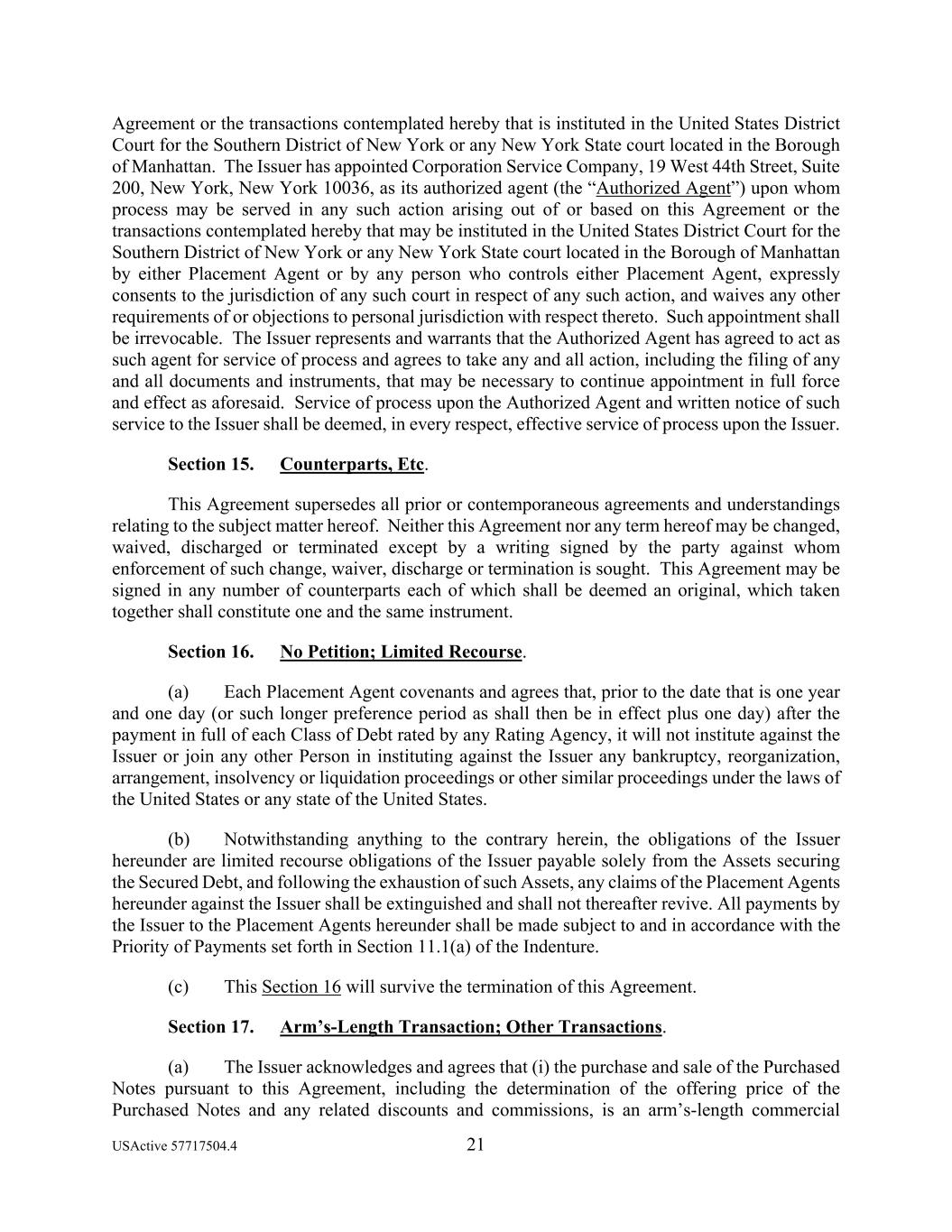 USActive 57717504.4 21 Agreement or the transactions contemplated hereby that is instituted in the United States District Court for the Southern District of New York or any New York State court located in the Borough of Manhattan. The Issuer has appointed Corporation Service Company, 19 West 44th Street, Suite 200, New York, New York 10036, as its authorized agent (the “Authorized Agent”) upon whom process may be served in any such action arising out of or based on this Agreement or the transactions contemplated hereby that may be instituted in the United States District Court for the Southern District of New York or any New York State court located in the Borough of Manhattan by either Placement Agent or by any person who controls either Placement Agent, expressly consents to the jurisdiction of any such court in respect of any such action, and waives any other requirements of or objections to personal jurisdiction with respect thereto. Such appointment shall be irrevocable. The Issuer represents and warrants that the Authorized Agent has agreed to act as such agent for service of process and agrees to take any and all action, including the filing of any and all documents and instruments, that may be necessary to continue appointment in full force and effect as aforesaid. Service of process upon the Authorized Agent and written notice of such service to the Issuer shall be deemed, in every respect, effective service of process upon the Issuer. Section 15. Counterparts, Etc. This Agreement supersedes all prior or contemporaneous agreements and understandings relating to the subject matter hereof. Neither this Agreement nor any term hereof may be changed, waived, discharged or terminated except by a writing signed by the party against whom enforcement of such change, waiver, discharge or termination is sought. This Agreement may be signed in any number of counterparts each of which shall be deemed an original, which taken together shall constitute one and the same instrument. Section 16. No Petition; Limited Recourse. (a) Each Placement Agent covenants and agrees that, prior to the date that is one year and one day (or such longer preference period as shall then be in effect plus one day) after the payment in full of each Class of Debt rated by any Rating Agency, it will not institute against the Issuer or join any other Person in instituting against the Issuer any bankruptcy, reorganization, arrangement, insolvency or liquidation proceedings or other similar proceedings under the laws of the United States or any state of the United States. (b) Notwithstanding anything to the contrary herein, the obligations of the Issuer hereunder are limited recourse obligations of the Issuer payable solely from the Assets securing the Secured Debt, and following the exhaustion of such Assets, any claims of the Placement Agents hereunder against the Issuer shall be extinguished and shall not thereafter revive. All payments by the Issuer to the Placement Agents hereunder shall be made subject to and in accordance with the Priority of Payments set forth in Section 11.1(a) of the Indenture. (c) This Section 16 will survive the termination of this Agreement. Section 17. Arm’s-Length Transaction; Other Transactions. (a) The Issuer acknowledges and agrees that (i) the purchase and sale of the Purchased Notes pursuant to this Agreement, including the determination of the offering price of the Purchased Notes and any related discounts and commissions, is an arm’s-length commercial