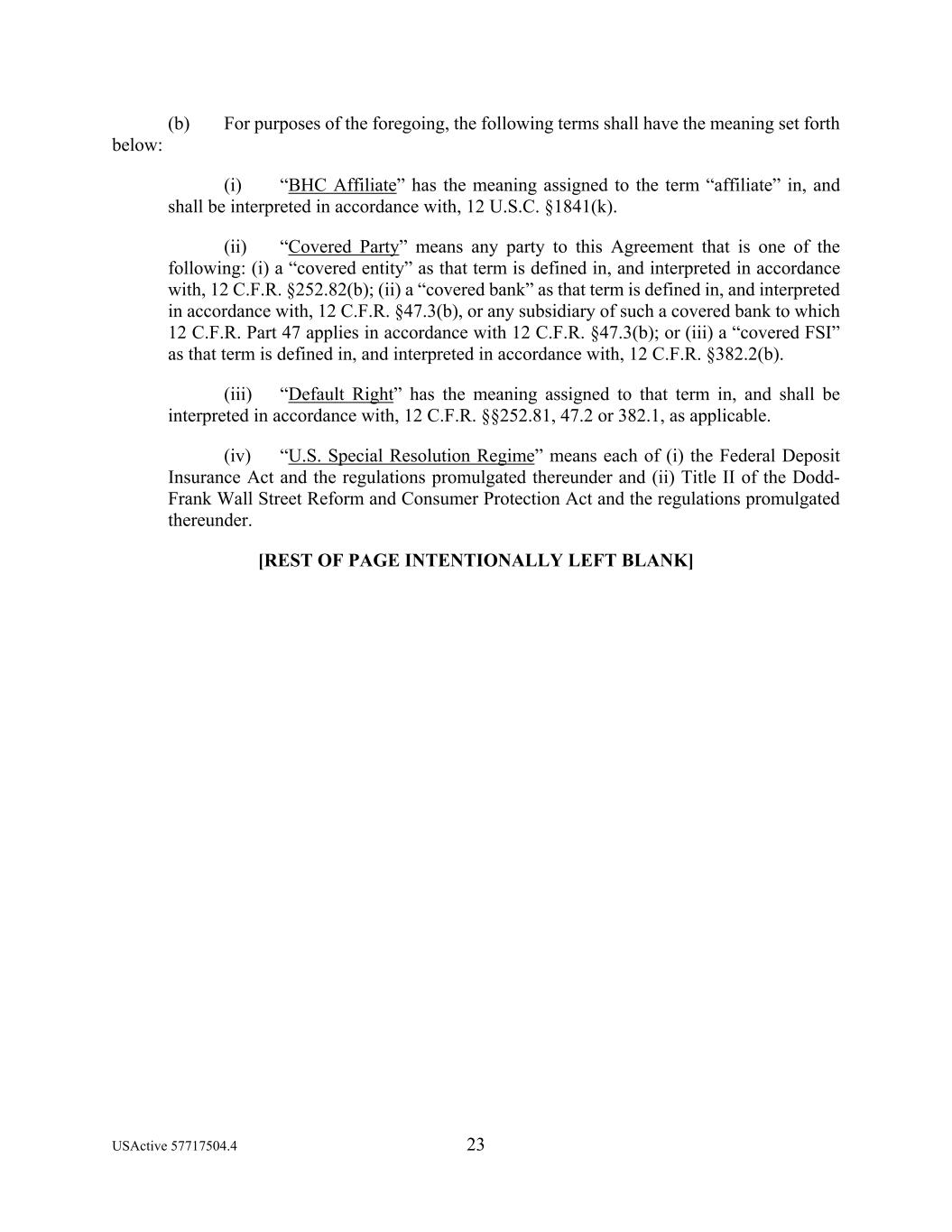 USActive 57717504.4 23 (b) For purposes of the foregoing, the following terms shall have the meaning set forth below: (i) “BHC Affiliate” has the meaning assigned to the term “affiliate” in, and shall be interpreted in accordance with, 12 U.S.C. §1841(k). (ii) “Covered Party” means any party to this Agreement that is one of the following: (i) a “covered entity” as that term is defined in, and interpreted in accordance with, 12 C.F.R. §252.82(b); (ii) a “covered bank” as that term is defined in, and interpreted in accordance with, 12 C.F.R. §47.3(b), or any subsidiary of such a covered bank to which 12 C.F.R. Part 47 applies in accordance with 12 C.F.R. §47.3(b); or (iii) a “covered FSI” as that term is defined in, and interpreted in accordance with, 12 C.F.R. §382.2(b). (iii) “Default Right” has the meaning assigned to that term in, and shall be interpreted in accordance with, 12 C.F.R. §§252.81, 47.2 or 382.1, as applicable. (iv) “U.S. Special Resolution Regime” means each of (i) the Federal Deposit Insurance Act and the regulations promulgated thereunder and (ii) Title II of the Dodd- Frank Wall Street Reform and Consumer Protection Act and the regulations promulgated thereunder. [REST OF PAGE INTENTIONALLY LEFT BLANK]