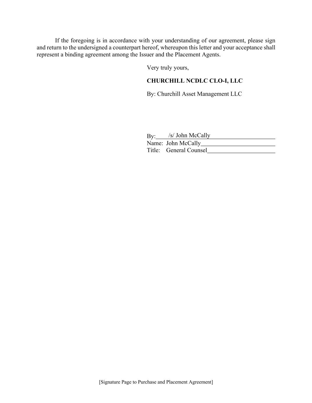 [Signature Page to Purchase and Placement Agreement] If the foregoing is in accordance with your understanding of our agreement, please sign and return to the undersigned a counterpart hereof, whereupon this letter and your acceptance shall represent a binding agreement among the Issuer and the Placement Agents. Very truly yours, CHURCHILL NCDLC CLO-I, LLC By: Churchill Asset Management LLC By: Name: John McCally Title: General Counsel /s/ John McCally