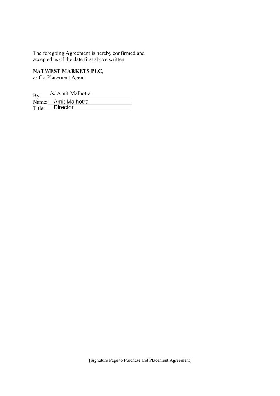 [Signature Page to Purchase and Placement Agreement] The foregoing Agreement is hereby confirmed and accepted as of the date first above written. NATWEST MARKETS PLC, as Co-Placement Agent By: Name: Title: Amit Malhotra Director /s/ Amit Malhotra