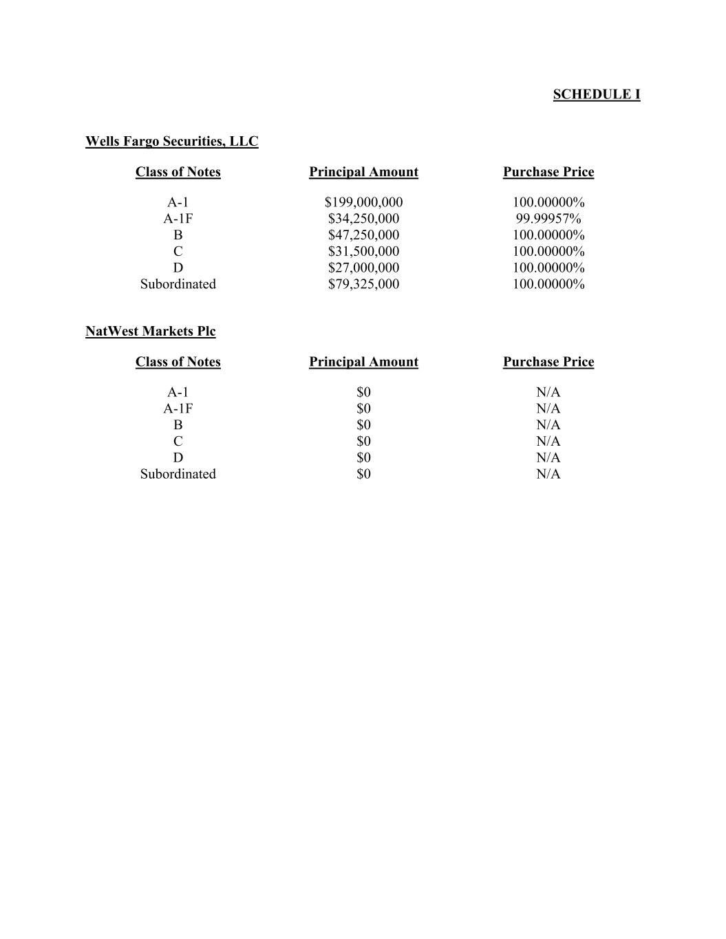 SCHEDULE I Wells Fargo Securities, LLC Class of Notes Principal Amount Purchase Price A-1 $199,000,000 100.00000% A-1F $34,250,000 99.99957% B $47,250,000 100.00000% C $31,500,000 100.00000% D $27,000,000 100.00000% Subordinated $79,325,000 100.00000% NatWest Markets Plc Class of Notes Principal Amount Purchase Price A-1 $0 N/A A-1F $0 N/A B $0 N/A C $0 N/A D $0 N/A Subordinated $0 N/A