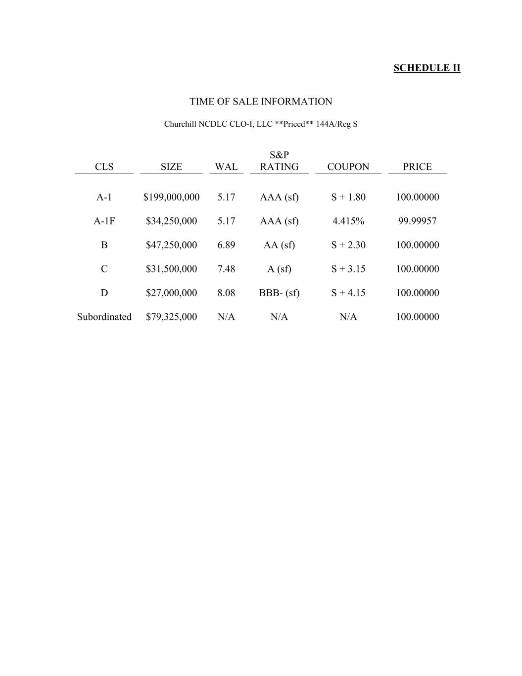 SCHEDULE II TIME OF SALE INFORMATION Churchill NCDLC CLO-I, LLC **Priced** 144A/Reg S CLS SIZE WAL S&P RATING COUPON PRICE A-1 $199,000,000 5.17 AAA (sf) S + 1.80 100.00000 A-1F $34,250,000 5.17 AAA (sf) 4.415% 99.99957 B $47,250,000 6.89 AA (sf) S + 2.30 100.00000 C $31,500,000 7.48 A (sf) S + 3.15 100.00000 D $27,000,000 8.08 BBB- (sf) S + 4.15 100.00000 Subordinated $79,325,000 N/A N/A N/A 100.00000