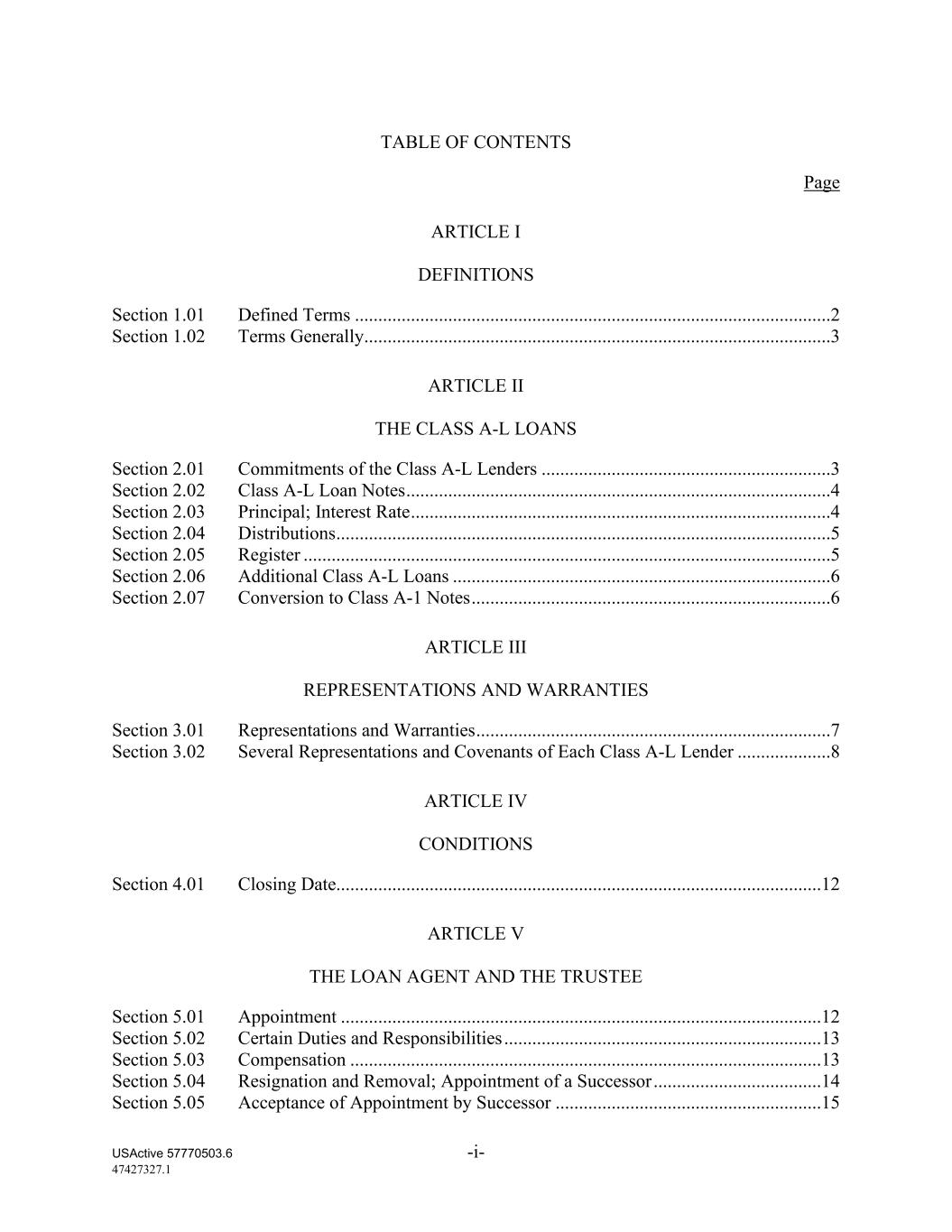 USActive 57770503.6 -i- 47427327.1 TABLE OF CONTENTS Page ARTICLE I DEFINITIONS Section 1.01 Defined Terms ......................................................................................................2 Section 1.02 Terms Generally....................................................................................................3 ARTICLE II THE CLASS A-L LOANS Section 2.01 Commitments of the Class A-L Lenders ..............................................................3 Section 2.02 Class A-L Loan Notes ...........................................................................................4 Section 2.03 Principal; Interest Rate ..........................................................................................4 Section 2.04 Distributions ..........................................................................................................5 Section 2.05 Register .................................................................................................................5 Section 2.06 Additional Class A-L Loans .................................................................................6 Section 2.07 Conversion to Class A-1 Notes .............................................................................6 ARTICLE III REPRESENTATIONS AND WARRANTIES Section 3.01 Representations and Warranties ............................................................................7 Section 3.02 Several Representations and Covenants of Each Class A-L Lender ....................8 ARTICLE IV CONDITIONS Section 4.01 Closing Date........................................................................................................12 ARTICLE V THE LOAN AGENT AND THE TRUSTEE Section 5.01 Appointment .......................................................................................................12 Section 5.02 Certain Duties and Responsibilities ....................................................................13 Section 5.03 Compensation .....................................................................................................13 Section 5.04 Resignation and Removal; Appointment of a Successor ....................................14 Section 5.05 Acceptance of Appointment by Successor .........................................................15