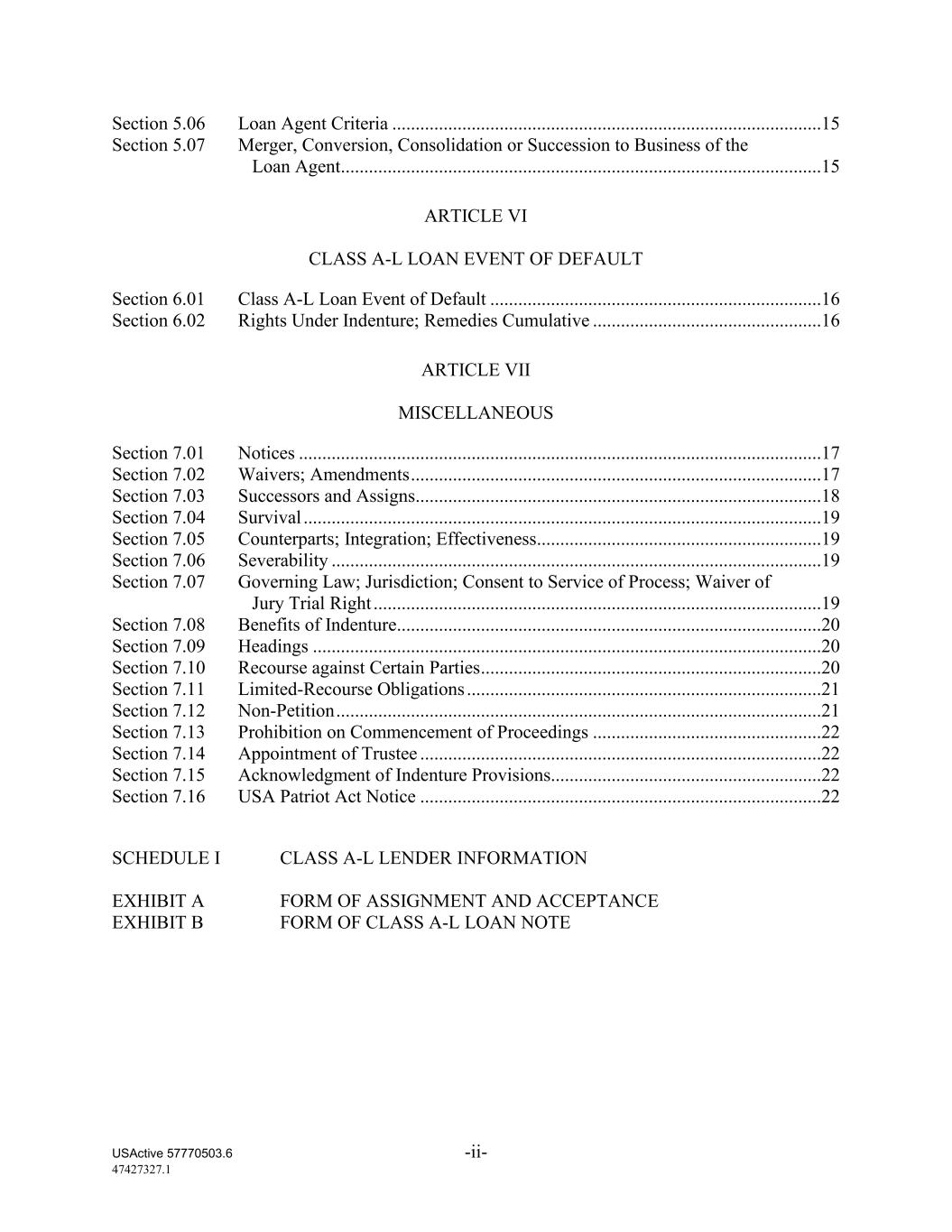 USActive 57770503.6 -ii- 47427327.1 Section 5.06 Loan Agent Criteria ............................................................................................15 Section 5.07 Merger, Conversion, Consolidation or Succession to Business of the Loan Agent.......................................................................................................15 ARTICLE VI CLASS A-L LOAN EVENT OF DEFAULT Section 6.01 Class A-L Loan Event of Default .......................................................................16 Section 6.02 Rights Under Indenture; Remedies Cumulative .................................................16 ARTICLE VII MISCELLANEOUS Section 7.01 Notices ................................................................................................................17 Section 7.02 Waivers; Amendments ........................................................................................17 Section 7.03 Successors and Assigns.......................................................................................18 Section 7.04 Survival ...............................................................................................................19 Section 7.05 Counterparts; Integration; Effectiveness .............................................................19 Section 7.06 Severability .........................................................................................................19 Section 7.07 Governing Law; Jurisdiction; Consent to Service of Process; Waiver of Jury Trial Right ................................................................................................19 Section 7.08 Benefits of Indenture...........................................................................................20 Section 7.09 Headings .............................................................................................................20 Section 7.10 Recourse against Certain Parties .........................................................................20 Section 7.11 Limited-Recourse Obligations ............................................................................21 Section 7.12 Non-Petition ........................................................................................................21 Section 7.13 Prohibition on Commencement of Proceedings .................................................22 Section 7.14 Appointment of Trustee ......................................................................................22 Section 7.15 Acknowledgment of Indenture Provisions..........................................................22 Section 7.16 USA Patriot Act Notice ......................................................................................22 SCHEDULE I CLASS A-L LENDER INFORMATION EXHIBIT A FORM OF ASSIGNMENT AND ACCEPTANCE EXHIBIT B FORM OF CLASS A-L LOAN NOTE
