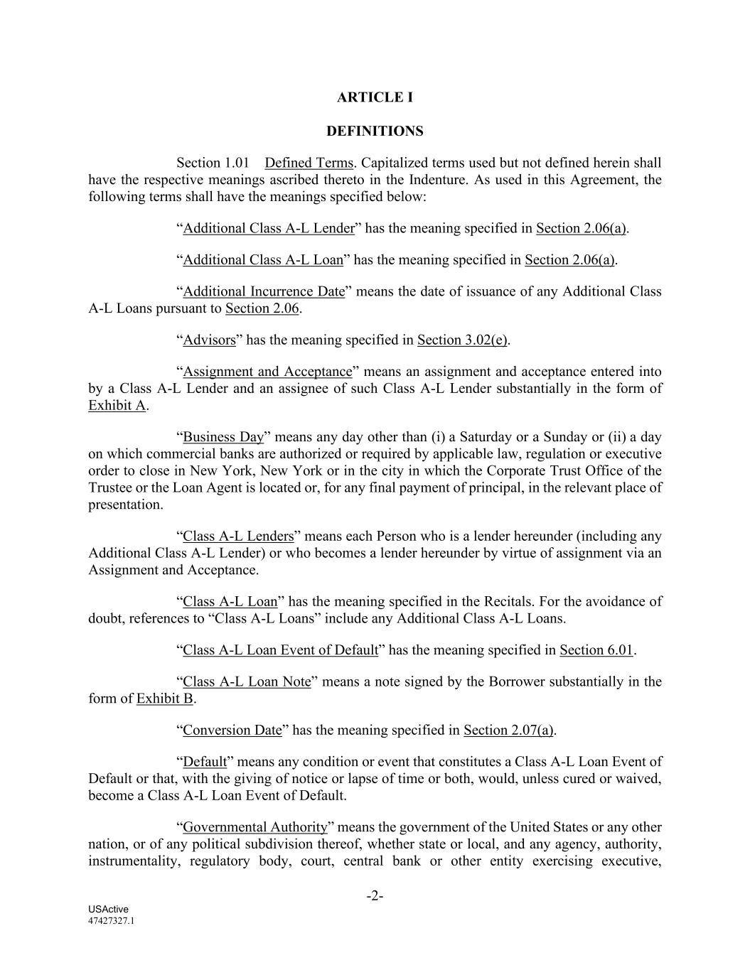 -2- USActive 47427327.1 ARTICLE I DEFINITIONS Section 1.01 Defined Terms. Capitalized terms used but not defined herein shall have the respective meanings ascribed thereto in the Indenture. As used in this Agreement, the following terms shall have the meanings specified below: “Additional Class A-L Lender” has the meaning specified in Section 2.06(a). “Additional Class A-L Loan” has the meaning specified in Section 2.06(a). “Additional Incurrence Date” means the date of issuance of any Additional Class A-L Loans pursuant to Section 2.06. “Advisors” has the meaning specified in Section 3.02(e). “Assignment and Acceptance” means an assignment and acceptance entered into by a Class A-L Lender and an assignee of such Class A-L Lender substantially in the form of Exhibit A. “Business Day” means any day other than (i) a Saturday or a Sunday or (ii) a day on which commercial banks are authorized or required by applicable law, regulation or executive order to close in New York, New York or in the city in which the Corporate Trust Office of the Trustee or the Loan Agent is located or, for any final payment of principal, in the relevant place of presentation. “Class A-L Lenders” means each Person who is a lender hereunder (including any Additional Class A-L Lender) or who becomes a lender hereunder by virtue of assignment via an Assignment and Acceptance. “Class A-L Loan” has the meaning specified in the Recitals. For the avoidance of doubt, references to “Class A-L Loans” include any Additional Class A-L Loans. “Class A-L Loan Event of Default” has the meaning specified in Section 6.01. “Class A-L Loan Note” means a note signed by the Borrower substantially in the form of Exhibit B. “Conversion Date” has the meaning specified in Section 2.07(a). “Default” means any condition or event that constitutes a Class A-L Loan Event of Default or that, with the giving of notice or lapse of time or both, would, unless cured or waived, become a Class A-L Loan Event of Default. “Governmental Authority” means the government of the United States or any other nation, or of any political subdivision thereof, whether state or local, and any agency, authority, instrumentality, regulatory body, court, central bank or other entity exercising executive,
