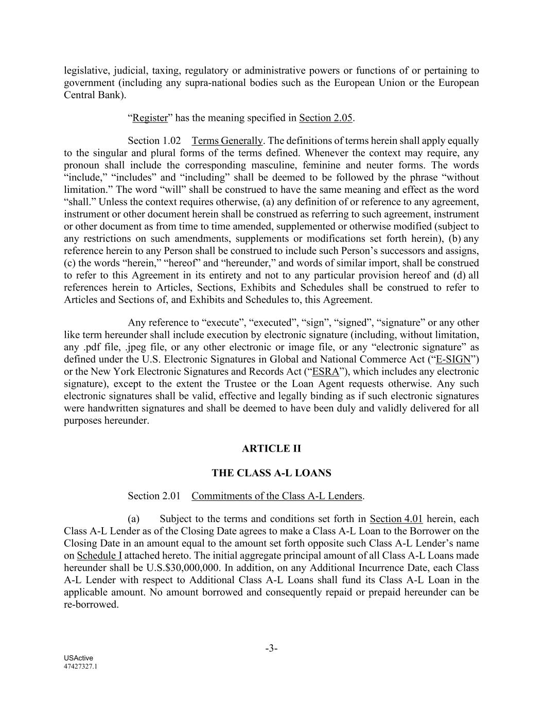 -3- USActive 47427327.1 legislative, judicial, taxing, regulatory or administrative powers or functions of or pertaining to government (including any supra-national bodies such as the European Union or the European Central Bank). “Register” has the meaning specified in Section 2.05. Section 1.02 Terms Generally. The definitions of terms herein shall apply equally to the singular and plural forms of the terms defined. Whenever the context may require, any pronoun shall include the corresponding masculine, feminine and neuter forms. The words “include,” “includes” and “including” shall be deemed to be followed by the phrase “without limitation.” The word “will” shall be construed to have the same meaning and effect as the word “shall.” Unless the context requires otherwise, (a) any definition of or reference to any agreement, instrument or other document herein shall be construed as referring to such agreement, instrument or other document as from time to time amended, supplemented or otherwise modified (subject to any restrictions on such amendments, supplements or modifications set forth herein), (b) any reference herein to any Person shall be construed to include such Person’s successors and assigns, (c) the words “herein,” “hereof” and “hereunder,” and words of similar import, shall be construed to refer to this Agreement in its entirety and not to any particular provision hereof and (d) all references herein to Articles, Sections, Exhibits and Schedules shall be construed to refer to Articles and Sections of, and Exhibits and Schedules to, this Agreement. Any reference to “execute”, “executed”, “sign”, “signed”, “signature” or any other like term hereunder shall include execution by electronic signature (including, without limitation, any .pdf file, .jpeg file, or any other electronic or image file, or any “electronic signature” as defined under the U.S. Electronic Signatures in Global and National Commerce Act (“E-SIGN”) or the New York Electronic Signatures and Records Act (“ESRA”), which includes any electronic signature), except to the extent the Trustee or the Loan Agent requests otherwise. Any such electronic signatures shall be valid, effective and legally binding as if such electronic signatures were handwritten signatures and shall be deemed to have been duly and validly delivered for all purposes hereunder. ARTICLE II THE CLASS A-L LOANS Section 2.01 Commitments of the Class A-L Lenders. (a) Subject to the terms and conditions set forth in Section 4.01 herein, each Class A-L Lender as of the Closing Date agrees to make a Class A-L Loan to the Borrower on the Closing Date in an amount equal to the amount set forth opposite such Class A-L Lender’s name on Schedule I attached hereto. The initial aggregate principal amount of all Class A-L Loans made hereunder shall be U.S.$30,000,000. In addition, on any Additional Incurrence Date, each Class A-L Lender with respect to Additional Class A-L Loans shall fund its Class A-L Loan in the applicable amount. No amount borrowed and consequently repaid or prepaid hereunder can be re-borrowed.