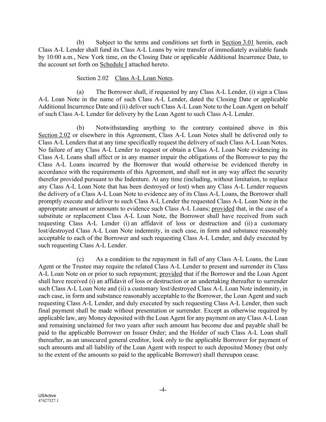 -4- USActive 47427327.1 (b) Subject to the terms and conditions set forth in Section 3.01 herein, each Class A-L Lender shall fund its Class A-L Loans by wire transfer of immediately available funds by 10:00 a.m., New York time, on the Closing Date or applicable Additional Incurrence Date, to the account set forth on Schedule I attached hereto. Section 2.02 Class A-L Loan Notes. (a) The Borrower shall, if requested by any Class A-L Lender, (i) sign a Class A-L Loan Note in the name of such Class A-L Lender, dated the Closing Date or applicable Additional Incurrence Date and (ii) deliver such Class A-L Loan Note to the Loan Agent on behalf of such Class A-L Lender for delivery by the Loan Agent to such Class A-L Lender. (b) Notwithstanding anything to the contrary contained above in this Section 2.02 or elsewhere in this Agreement, Class A-L Loan Notes shall be delivered only to Class A-L Lenders that at any time specifically request the delivery of such Class A-L Loan Notes. No failure of any Class A-L Lender to request or obtain a Class A-L Loan Note evidencing its Class A-L Loans shall affect or in any manner impair the obligations of the Borrower to pay the Class A-L Loans incurred by the Borrower that would otherwise be evidenced thereby in accordance with the requirements of this Agreement, and shall not in any way affect the security therefor provided pursuant to the Indenture. At any time (including, without limitation, to replace any Class A-L Loan Note that has been destroyed or lost) when any Class A-L Lender requests the delivery of a Class A-L Loan Note to evidence any of its Class A-L Loans, the Borrower shall promptly execute and deliver to such Class A-L Lender the requested Class A-L Loan Note in the appropriate amount or amounts to evidence such Class A-L Loans; provided that, in the case of a substitute or replacement Class A-L Loan Note, the Borrower shall have received from such requesting Class A-L Lender (i) an affidavit of loss or destruction and (ii) a customary lost/destroyed Class A-L Loan Note indemnity, in each case, in form and substance reasonably acceptable to each of the Borrower and such requesting Class A-L Lender, and duly executed by such requesting Class A-L Lender. (c) As a condition to the repayment in full of any Class A-L Loans, the Loan Agent or the Trustee may require the related Class A-L Lender to present and surrender its Class A-L Loan Note on or prior to such repayment; provided that if the Borrower and the Loan Agent shall have received (i) an affidavit of loss or destruction or an undertaking thereafter to surrender such Class A-L Loan Note and (ii) a customary lost/destroyed Class A-L Loan Note indemnity, in each case, in form and substance reasonably acceptable to the Borrower, the Loan Agent and such requesting Class A-L Lender, and duly executed by such requesting Class A-L Lender, then such final payment shall be made without presentation or surrender. Except as otherwise required by applicable law, any Money deposited with the Loan Agent for any payment on any Class A-L Loan and remaining unclaimed for two years after such amount has become due and payable shall be paid to the applicable Borrower on Issuer Order; and the Holder of such Class A-L Loan shall thereafter, as an unsecured general creditor, look only to the applicable Borrower for payment of such amounts and all liability of the Loan Agent with respect to such deposited Money (but only to the extent of the amounts so paid to the applicable Borrower) shall thereupon cease.