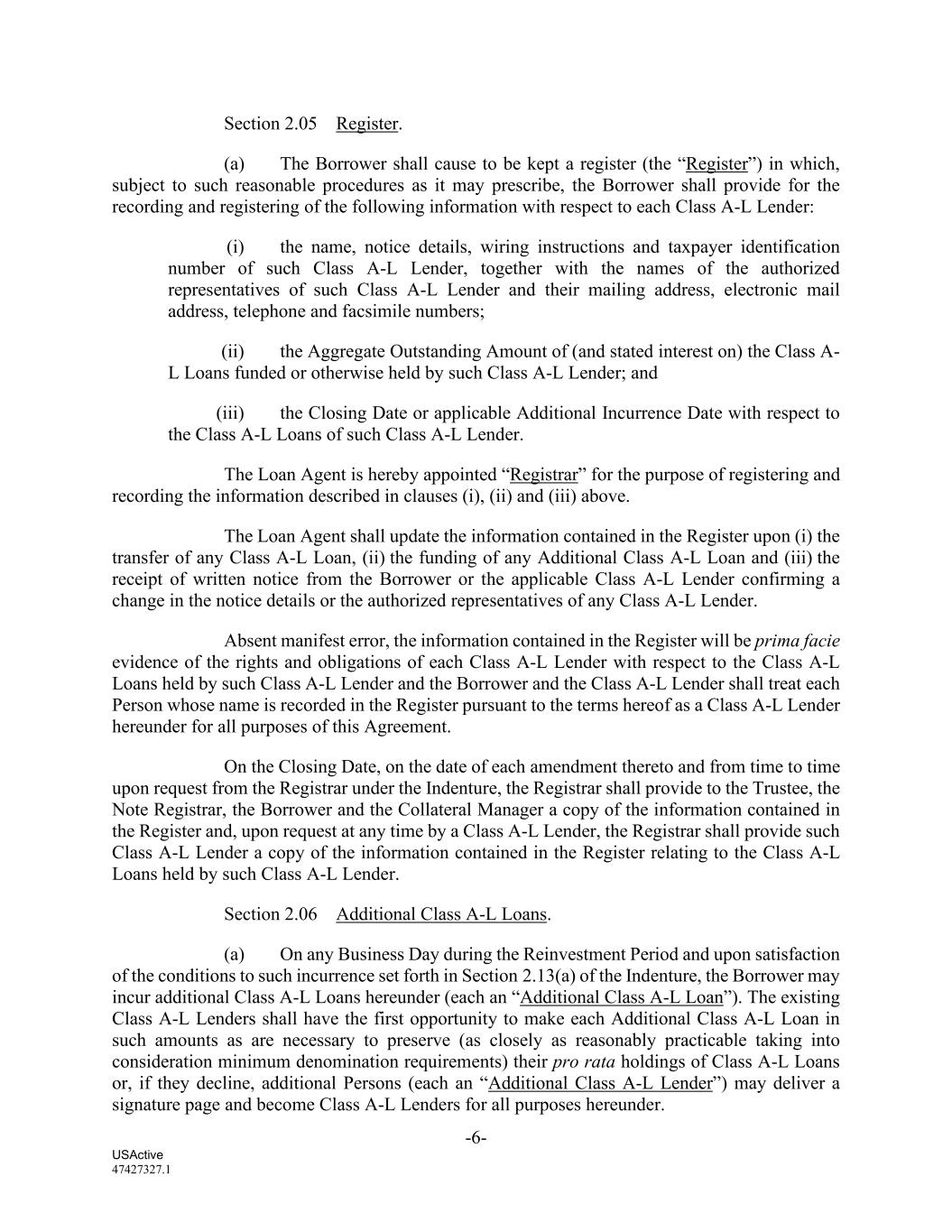 -6- USActive 47427327.1 Section 2.05 Register. (a) The Borrower shall cause to be kept a register (the “Register”) in which, subject to such reasonable procedures as it may prescribe, the Borrower shall provide for the recording and registering of the following information with respect to each Class A-L Lender: (i) the name, notice details, wiring instructions and taxpayer identification number of such Class A-L Lender, together with the names of the authorized representatives of such Class A-L Lender and their mailing address, electronic mail address, telephone and facsimile numbers; (ii) the Aggregate Outstanding Amount of (and stated interest on) the Class A- L Loans funded or otherwise held by such Class A-L Lender; and (iii) the Closing Date or applicable Additional Incurrence Date with respect to the Class A-L Loans of such Class A-L Lender. The Loan Agent is hereby appointed “Registrar” for the purpose of registering and recording the information described in clauses (i), (ii) and (iii) above. The Loan Agent shall update the information contained in the Register upon (i) the transfer of any Class A-L Loan, (ii) the funding of any Additional Class A-L Loan and (iii) the receipt of written notice from the Borrower or the applicable Class A-L Lender confirming a change in the notice details or the authorized representatives of any Class A-L Lender. Absent manifest error, the information contained in the Register will be prima facie evidence of the rights and obligations of each Class A-L Lender with respect to the Class A-L Loans held by such Class A-L Lender and the Borrower and the Class A-L Lender shall treat each Person whose name is recorded in the Register pursuant to the terms hereof as a Class A-L Lender hereunder for all purposes of this Agreement. On the Closing Date, on the date of each amendment thereto and from time to time upon request from the Registrar under the Indenture, the Registrar shall provide to the Trustee, the Note Registrar, the Borrower and the Collateral Manager a copy of the information contained in the Register and, upon request at any time by a Class A-L Lender, the Registrar shall provide such Class A-L Lender a copy of the information contained in the Register relating to the Class A-L Loans held by such Class A-L Lender. Section 2.06 Additional Class A-L Loans. (a) On any Business Day during the Reinvestment Period and upon satisfaction of the conditions to such incurrence set forth in Section 2.13(a) of the Indenture, the Borrower may incur additional Class A-L Loans hereunder (each an “Additional Class A-L Loan”). The existing Class A-L Lenders shall have the first opportunity to make each Additional Class A-L Loan in such amounts as are necessary to preserve (as closely as reasonably practicable taking into consideration minimum denomination requirements) their pro rata holdings of Class A-L Loans or, if they decline, additional Persons (each an “Additional Class A-L Lender”) may deliver a signature page and become Class A-L Lenders for all purposes hereunder.