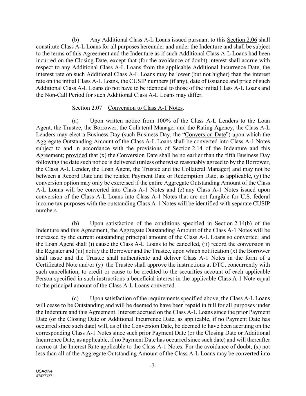 -7- USActive 47427327.1 (b) Any Additional Class A-L Loans issued pursuant to this Section 2.06 shall constitute Class A-L Loans for all purposes hereunder and under the Indenture and shall be subject to the terms of this Agreement and the Indenture as if such Additional Class A-L Loans had been incurred on the Closing Date, except that (for the avoidance of doubt) interest shall accrue with respect to any Additional Class A-L Loans from the applicable Additional Incurrence Date, the interest rate on such Additional Class A-L Loans may be lower (but not higher) than the interest rate on the initial Class A-L Loans, the CUSIP numbers (if any), date of issuance and price of such Additional Class A-L Loans do not have to be identical to those of the initial Class A-L Loans and the Non-Call Period for such Additional Class A-L Loans may differ. Section 2.07 Conversion to Class A-1 Notes. (a) Upon written notice from 100% of the Class A-L Lenders to the Loan Agent, the Trustee, the Borrower, the Collateral Manager and the Rating Agency, the Class A-L Lenders may elect a Business Day (such Business Day, the “Conversion Date”) upon which the Aggregate Outstanding Amount of the Class A-L Loans shall be converted into Class A-1 Notes subject to and in accordance with the provisions of Section 2.14 of the Indenture and this Agreement; provided that (x) the Conversion Date shall be no earlier than the fifth Business Day following the date such notice is delivered (unless otherwise reasonably agreed to by the Borrower, the Class A-L Lender, the Loan Agent, the Trustee and the Collateral Manager) and may not be between a Record Date and the related Payment Date or Redemption Date, as applicable, (y) the conversion option may only be exercised if the entire Aggregate Outstanding Amount of the Class A-L Loans will be converted into Class A-1 Notes and (z) any Class A-1 Notes issued upon conversion of the Class A-L Loans into Class A-1 Notes that are not fungible for U.S. federal income tax purposes with the outstanding Class A-1 Notes will be identified with separate CUSIP numbers. (b) Upon satisfaction of the conditions specified in Section 2.14(b) of the Indenture and this Agreement, the Aggregate Outstanding Amount of the Class A-1 Notes will be increased by the current outstanding principal amount of the Class A-L Loans so converted] and the Loan Agent shall (i) cause the Class A-L Loans to be cancelled, (ii) record the conversion in the Register and (iii) notify the Borrower and the Trustee, upon which notification (x) the Borrower shall issue and the Trustee shall authenticate and deliver Class A-1 Notes in the form of a Certificated Note and/or (y) the Trustee shall approve the instructions at DTC, concurrently with such cancellation, to credit or cause to be credited to the securities account of each applicable Person specified in such instructions a beneficial interest in the applicable Class A-1 Note equal to the principal amount of the Class A-L Loans converted. (c) Upon satisfaction of the requirements specified above, the Class A-L Loans will cease to be Outstanding and will be deemed to have been repaid in full for all purposes under the Indenture and this Agreement. Interest accrued on the Class A-L Loans since the prior Payment Date (or the Closing Date or Additional Incurrence Date, as applicable, if no Payment Date has occurred since such date) will, as of the Conversion Date, be deemed to have been accruing on the corresponding Class A-1 Notes since such prior Payment Date (or the Closing Date or Additional Incurrence Date, as applicable, if no Payment Date has occurred since such date) and will thereafter accrue at the Interest Rate applicable to the Class A-1 Notes. For the avoidance of doubt, (x) not less than all of the Aggregate Outstanding Amount of the Class A-L Loans may be converted into