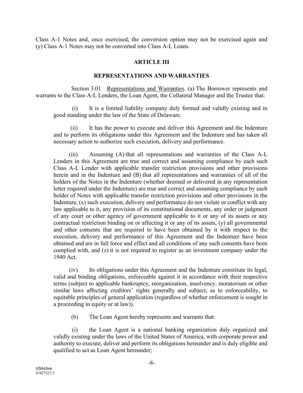 -8- USActive 47427327.1 Class A-1 Notes and, once exercised, the conversion option may not be exercised again and (y) Class A-1 Notes may not be converted into Class A-L Loans. ARTICLE III REPRESENTATIONS AND WARRANTIES Section 3.01 Representations and Warranties. (a) The Borrower represents and warrants to the Class A-L Lenders, the Loan Agent, the Collateral Manager and the Trustee that: (i) It is a limited liability company duly formed and validly existing and in good standing under the law of the State of Delaware. (ii) It has the power to execute and deliver this Agreement and the Indenture and to perform its obligations under this Agreement and the Indenture and has taken all necessary action to authorize such execution, delivery and performance. (iii) Assuming (A) that all representations and warranties of the Class A-L Lenders in this Agreement are true and correct and assuming compliance by each such Class A-L Lender with applicable transfer restriction provisions and other provisions herein and in the Indenture and (B) that all representations and warranties of all of the holders of the Notes in the Indenture (whether deemed or delivered in any representation letter required under the Indenture) are true and correct and assuming compliance by each holder of Notes with applicable transfer restriction provisions and other provisions in the Indenture, (x) such execution, delivery and performance do not violate or conflict with any law applicable to it, any provision of its constitutional documents, any order or judgment of any court or other agency of government applicable to it or any of its assets or any contractual restriction binding on or affecting it or any of its assets, (y) all governmental and other consents that are required to have been obtained by it with respect to the execution, delivery and performance of this Agreement and the Indenture have been obtained and are in full force and effect and all conditions of any such consents have been complied with, and (z) it is not required to register as an investment company under the 1940 Act. (iv) Its obligations under this Agreement and the Indenture constitute its legal, valid and binding obligations, enforceable against it in accordance with their respective terms (subject to applicable bankruptcy, reorganization, insolvency, moratorium or other similar laws affecting creditors’ rights generally and subject, as to enforceability, to equitable principles of general application (regardless of whether enforcement is sought in a proceeding in equity or at law)). (b) The Loan Agent hereby represents and warrants that: (i) the Loan Agent is a national banking organization duly organized and validly existing under the laws of the United States of America, with corporate power and authority to execute, deliver and perform its obligations hereunder and is duly eligible and qualified to act as Loan Agent hereunder;