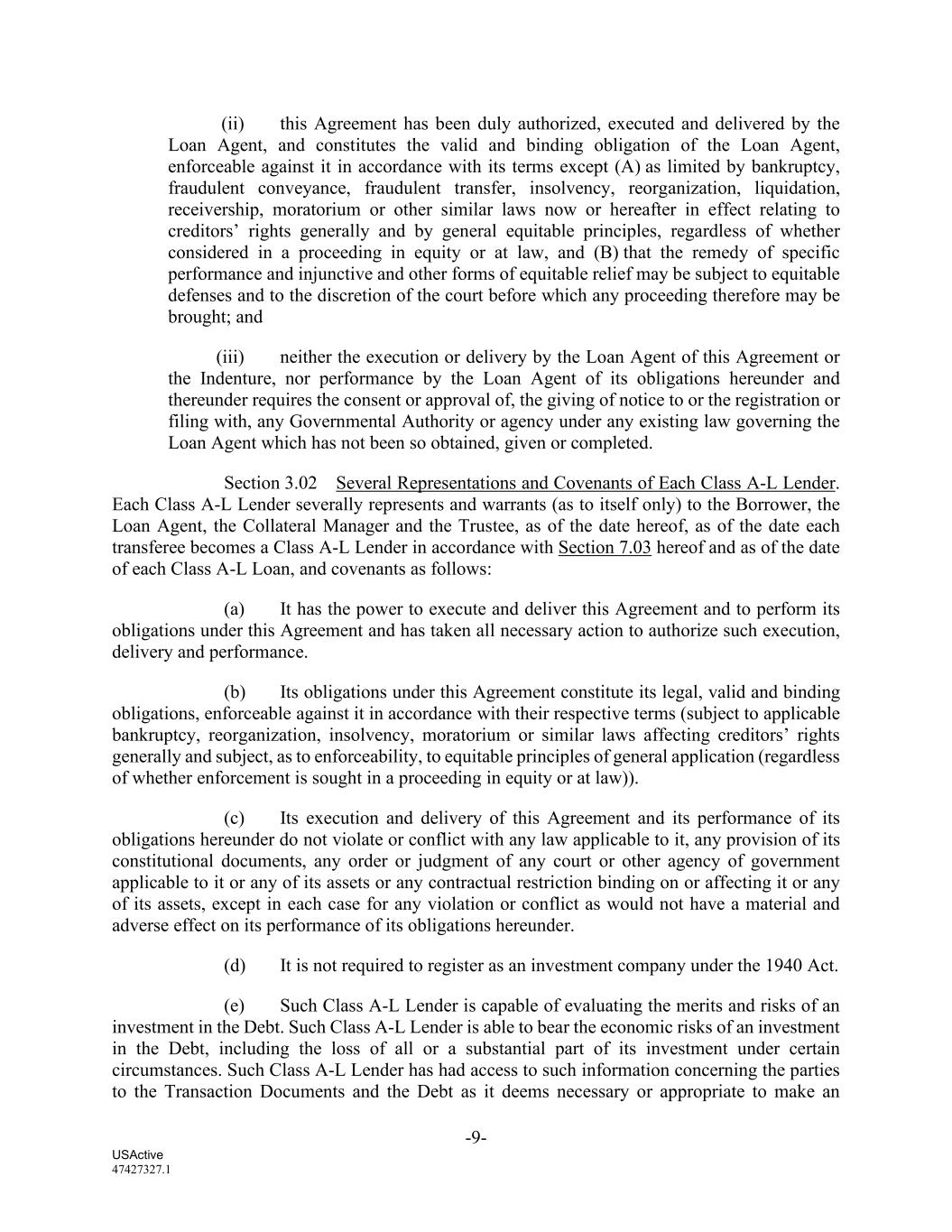 -9- USActive 47427327.1 (ii) this Agreement has been duly authorized, executed and delivered by the Loan Agent, and constitutes the valid and binding obligation of the Loan Agent, enforceable against it in accordance with its terms except (A) as limited by bankruptcy, fraudulent conveyance, fraudulent transfer, insolvency, reorganization, liquidation, receivership, moratorium or other similar laws now or hereafter in effect relating to creditors’ rights generally and by general equitable principles, regardless of whether considered in a proceeding in equity or at law, and (B) that the remedy of specific performance and injunctive and other forms of equitable relief may be subject to equitable defenses and to the discretion of the court before which any proceeding therefore may be brought; and (iii) neither the execution or delivery by the Loan Agent of this Agreement or the Indenture, nor performance by the Loan Agent of its obligations hereunder and thereunder requires the consent or approval of, the giving of notice to or the registration or filing with, any Governmental Authority or agency under any existing law governing the Loan Agent which has not been so obtained, given or completed. Section 3.02 Several Representations and Covenants of Each Class A-L Lender. Each Class A-L Lender severally represents and warrants (as to itself only) to the Borrower, the Loan Agent, the Collateral Manager and the Trustee, as of the date hereof, as of the date each transferee becomes a Class A-L Lender in accordance with Section 7.03 hereof and as of the date of each Class A-L Loan, and covenants as follows: (a) It has the power to execute and deliver this Agreement and to perform its obligations under this Agreement and has taken all necessary action to authorize such execution, delivery and performance. (b) Its obligations under this Agreement constitute its legal, valid and binding obligations, enforceable against it in accordance with their respective terms (subject to applicable bankruptcy, reorganization, insolvency, moratorium or similar laws affecting creditors’ rights generally and subject, as to enforceability, to equitable principles of general application (regardless of whether enforcement is sought in a proceeding in equity or at law)). (c) Its execution and delivery of this Agreement and its performance of its obligations hereunder do not violate or conflict with any law applicable to it, any provision of its constitutional documents, any order or judgment of any court or other agency of government applicable to it or any of its assets or any contractual restriction binding on or affecting it or any of its assets, except in each case for any violation or conflict as would not have a material and adverse effect on its performance of its obligations hereunder. (d) It is not required to register as an investment company under the 1940 Act. (e) Such Class A-L Lender is capable of evaluating the merits and risks of an investment in the Debt. Such Class A-L Lender is able to bear the economic risks of an investment in the Debt, including the loss of all or a substantial part of its investment under certain circumstances. Such Class A-L Lender has had access to such information concerning the parties to the Transaction Documents and the Debt as it deems necessary or appropriate to make an